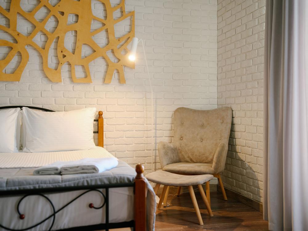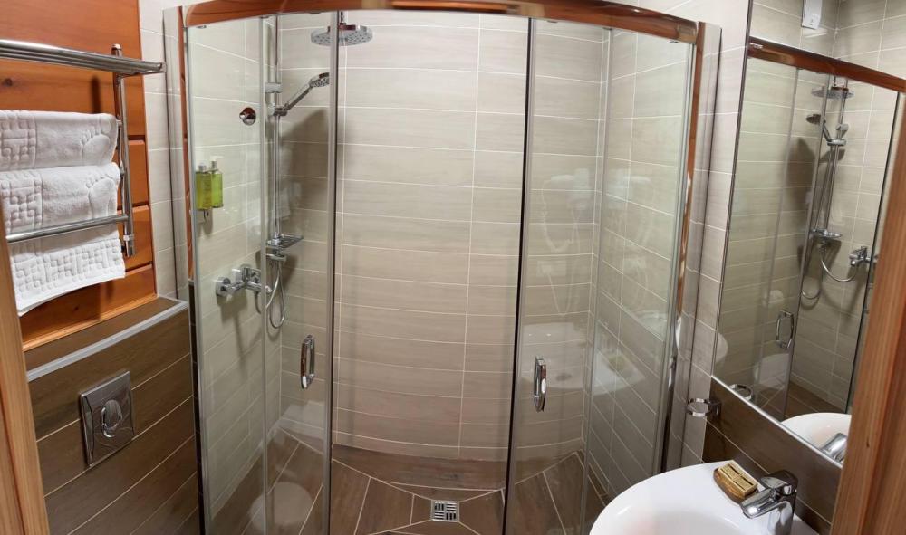 В номере: двуспальная кровать, вместительный шкаф, телевизор, холодильник, чайник. Туалетная комната оснащена всем необходимым по количеству гостей: халаты, тапочки, полотенца, наборы для душа, фен.