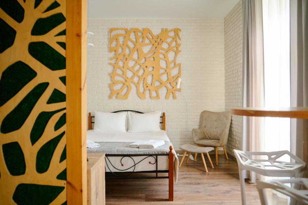 Номер на втором этаже с балконом. Две раздельные комнаты и кухня. Двуспальная кровать, двуспальный диван, вместительный шкаф, телевизор, холодильник, чайник. Туалетная комната оснащена всем необходимым по количеству гостей: халаты, полотенца, тапочки, наборы для душа, фен.