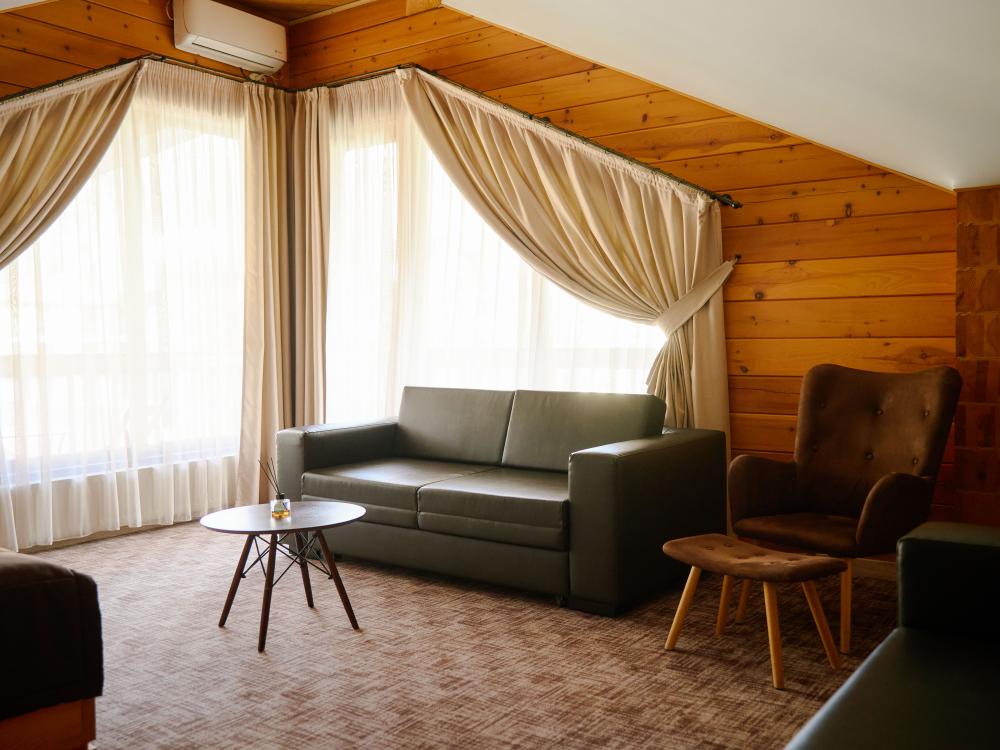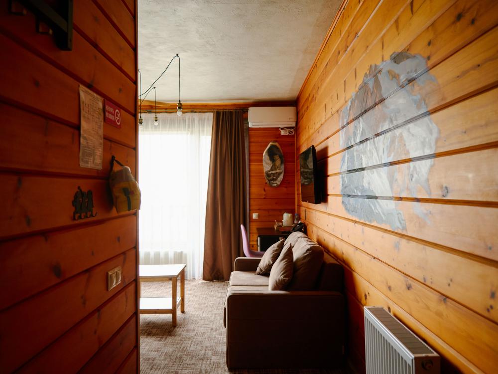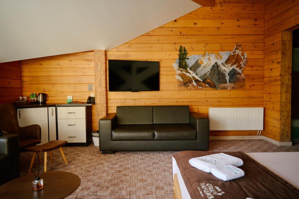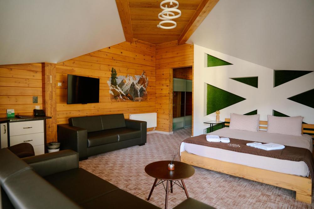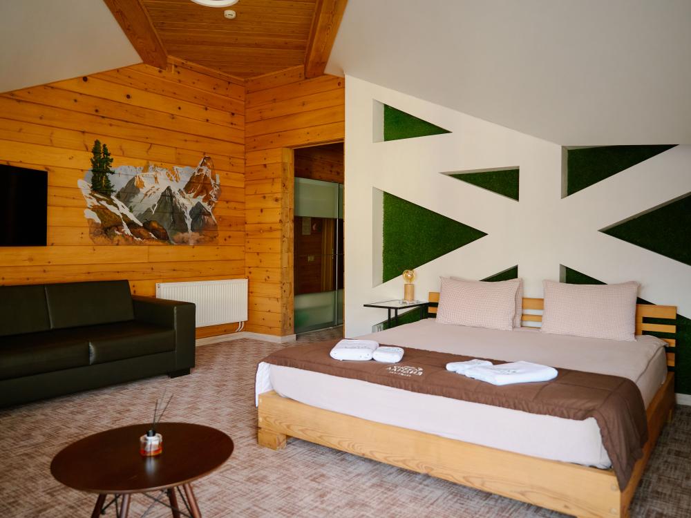 В номере: двуспальная кровать, двуспальный диван, зона для уютных вечеров небольшой компании, вместительный шкаф, телевизор, холодильник, кондиционер. Балкон с шикарным видом на горы. Туалетная комната, оснащена всем необходимым по количеству гостей: халаты, полотенца, тапочки, наборы для душа, фен.