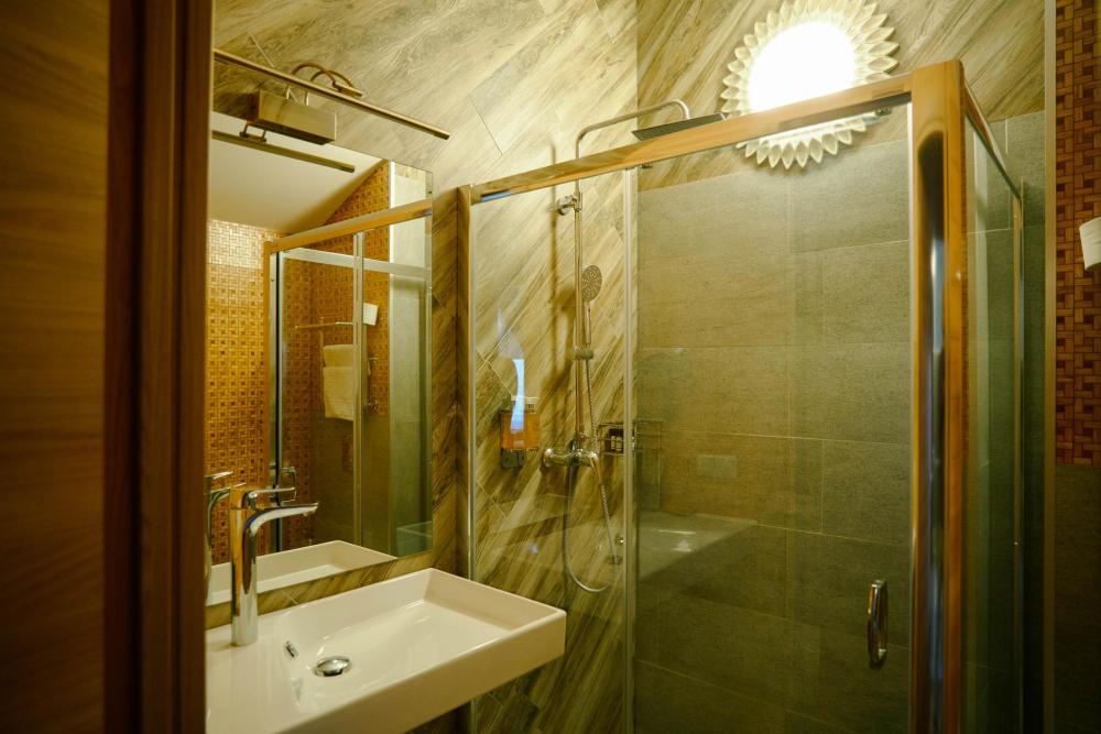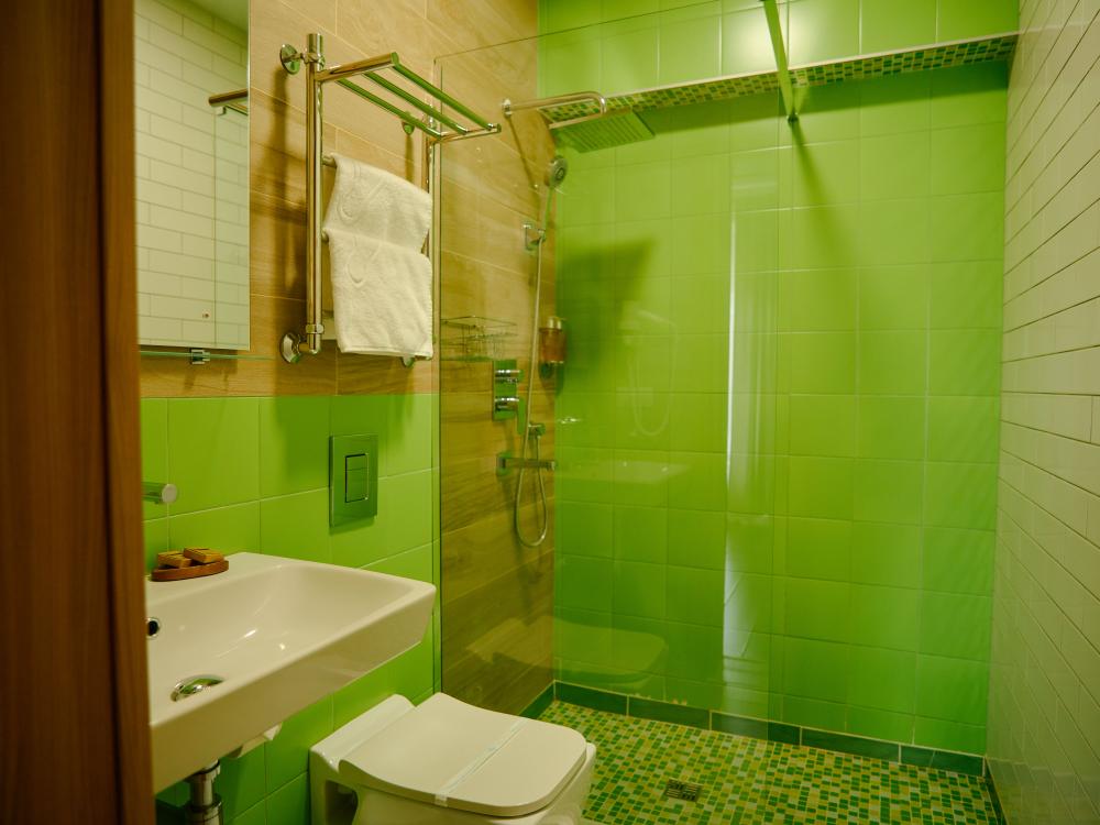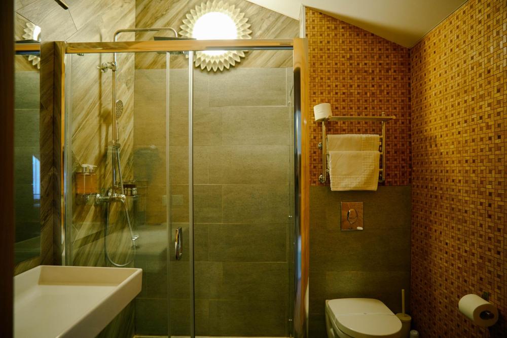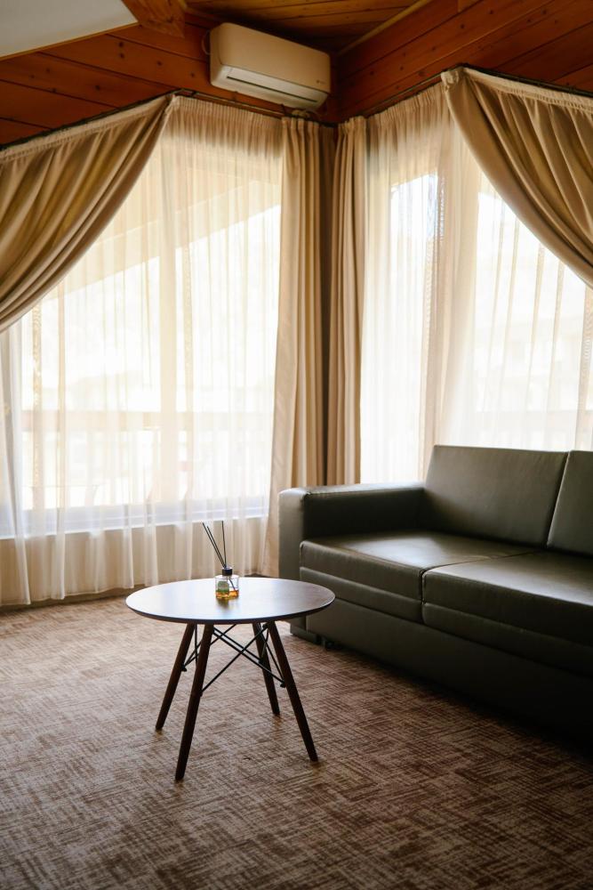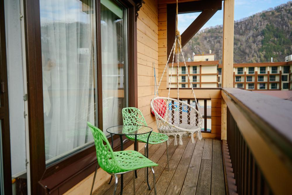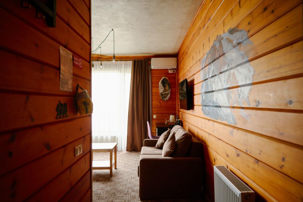 В номере: двуспальная кровать, двуспальный диван, зона для уютных вечеров небольшой компании, вместительный шкаф, телевизор, холодильник, кондиционер. Балкон с шикарным видом на горы. Туалетная комната, оснащена всем необходимым по количеству гостей: халаты, полотенца, тапочки, наборы для душа, фен.