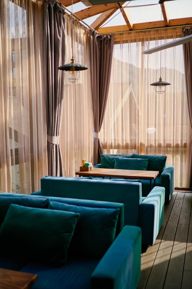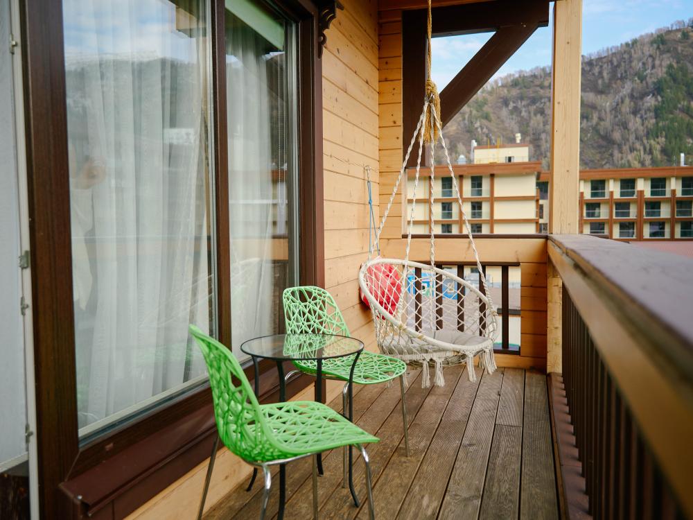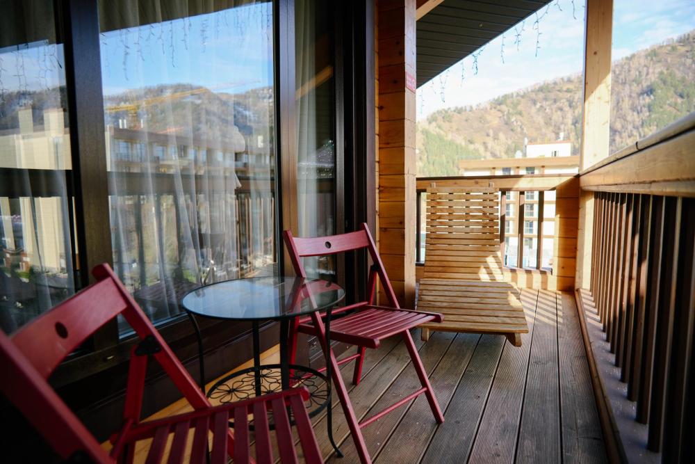 В номере: двуспальная кровать, двуспальный диван, зона для уютных вечеров небольшой компании, вместительный шкаф, телевизор, холодильник, кондиционер. Балкон с шикарным видом на горы. Кухонная зона со всем необходимым для самостоятельного приготовления еды или небольшого перекуса. Туалетная комната с большой ванной, оснащена всем необходимым по количеству гостей: халаты, тапочки, полотенца, наборы для душа, фен.