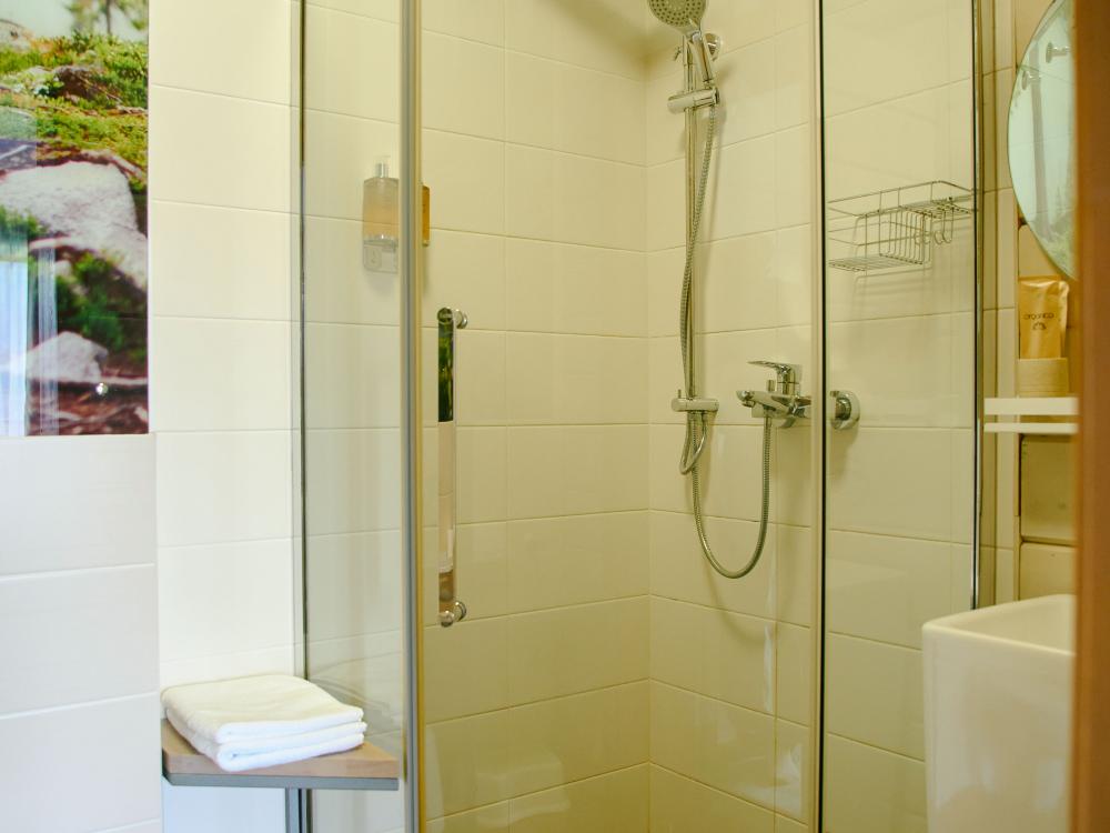 Категория номера включает в себя 16 кв.м экологически чистого пространства. Номер на первом этаже без балкона. Две односпальные кровати, телевизор, холодильник, чайник. Туалетная комната оснащена всем необходимым по количеству гостей: халаты, тапочки, полотенца, наборы для душа, фен.