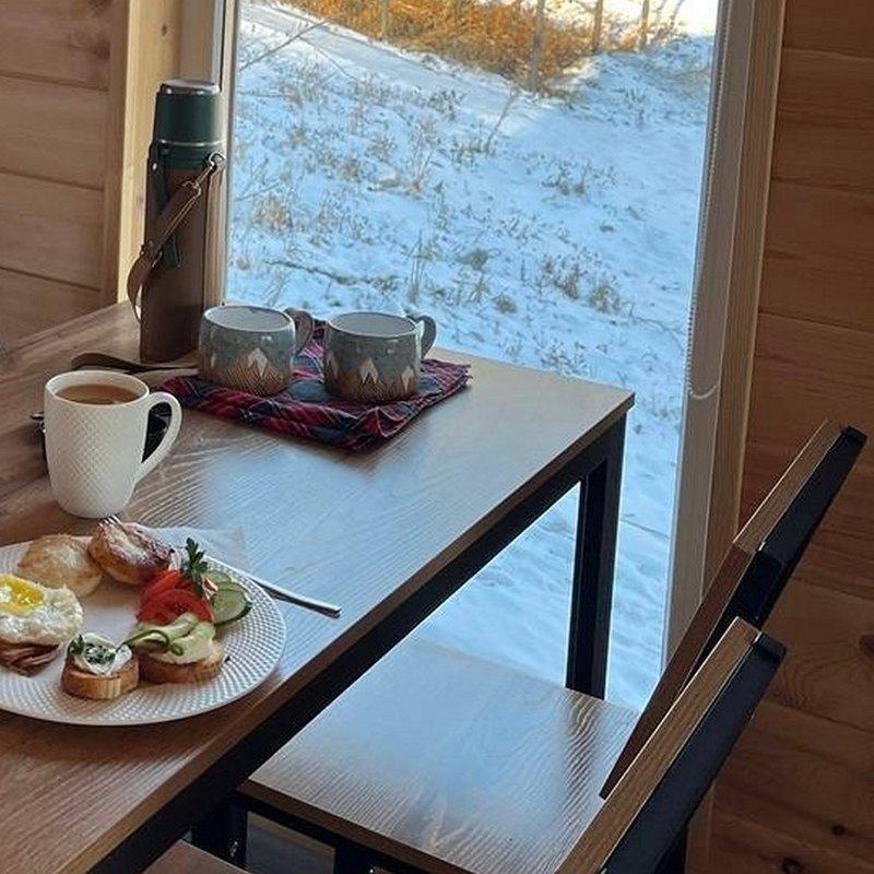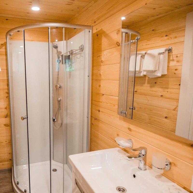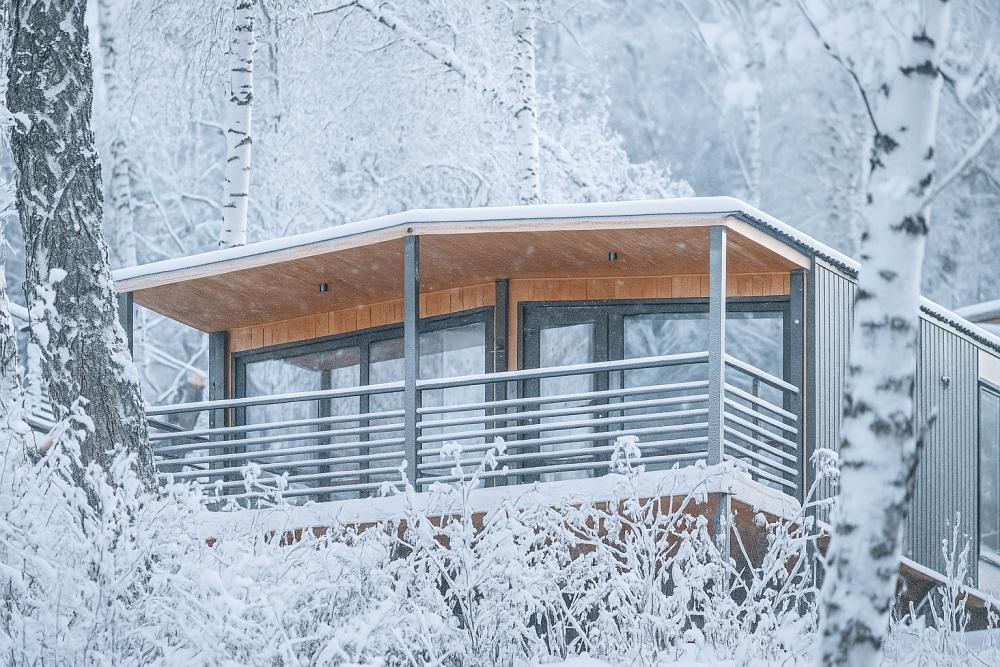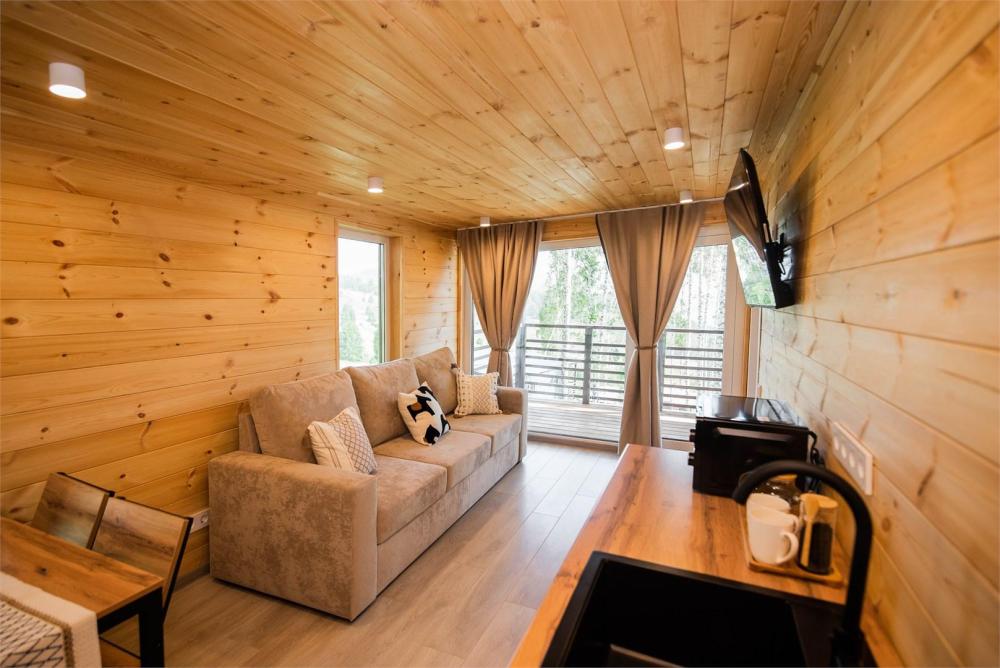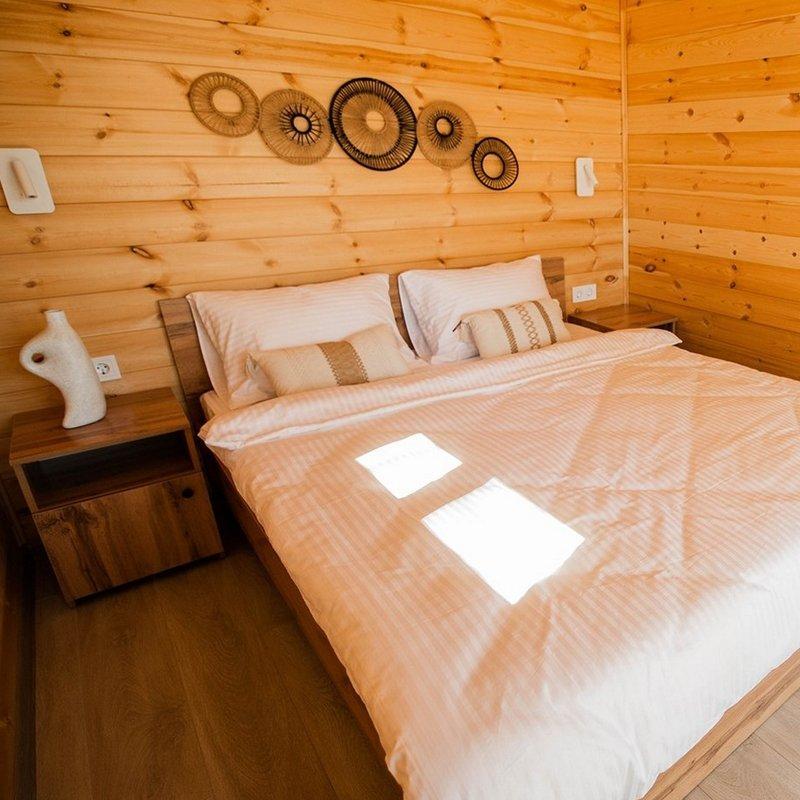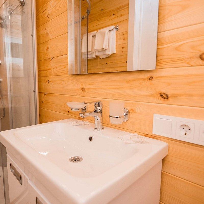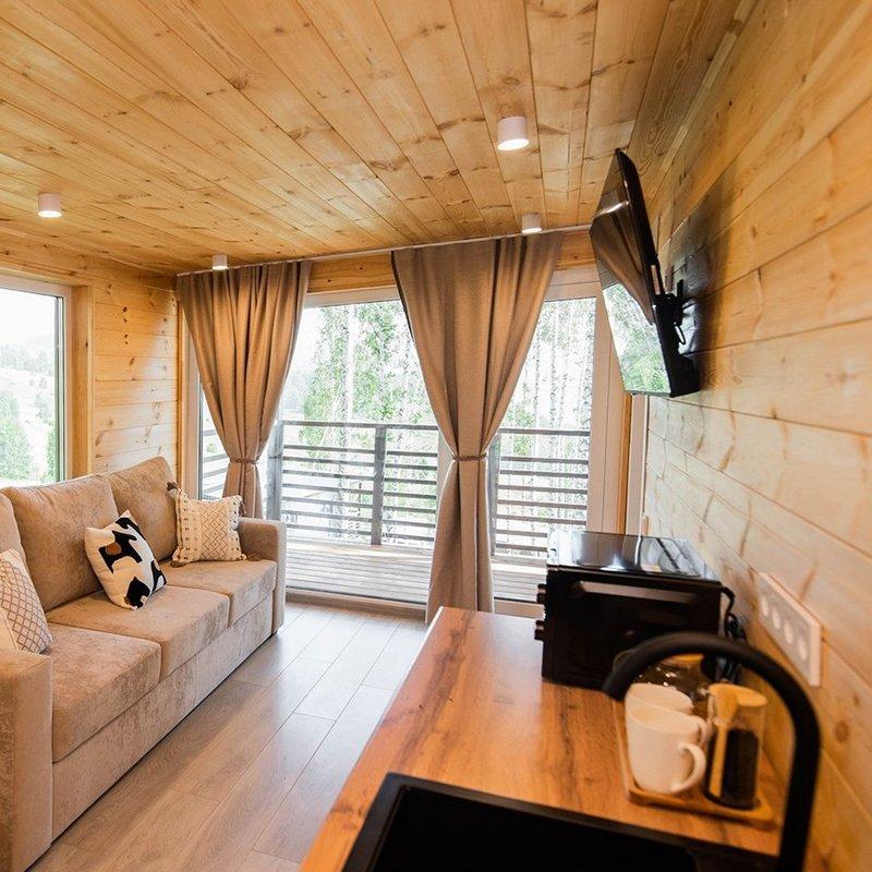 Просторный двухкомнатный дом, из панорамных окон которого открывается восхитительный вид на горы. Дом включает в себя уютную спальню с двуспальной кроватью и прикроватными тумбочками. Спокойные цвета, мягкий белоснежный текстиль и утренний свет создают атмосферу полного расслабления. Гостиная дома с большим мягким диваном, обеденным столом и кухонной зоной. Современная душевая с раковиной, зеркалом и туалетом. Ванная комната укомплектована феном, набором полотенец и косметическим набором для каждого гостя. Все дома оборудованы системой "теплый пол" и мощным обогревом, что делает отдых комфортным даже в самые сильные морозы.