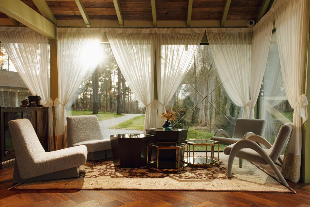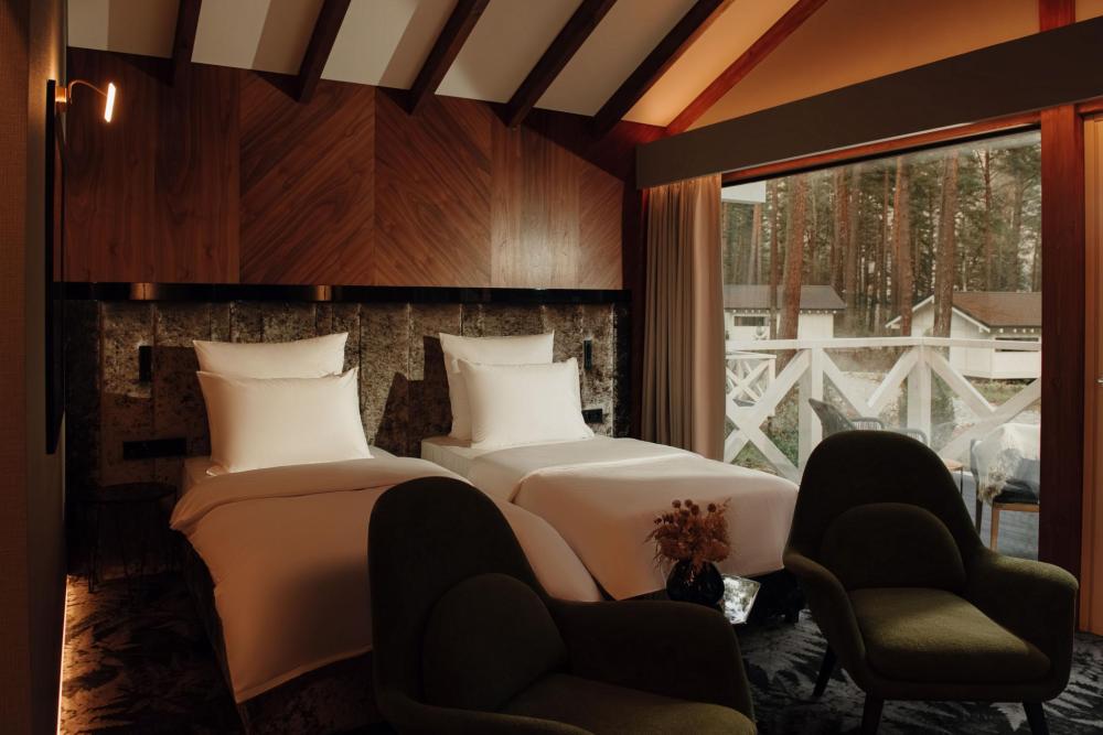 Эксклюзивный номер площадью 38 кв.м. с панорамными окнами на первозданную природу Алтая. В каждом номере имеется: двуспальная кровать, прикроватные столики, телевизор, рабочее место, чайнофейная и кофейная станция, кресла, шкаф, отдельный с/у, душевая, багажное отделение, ванные принадлежности, халаты и тапочки.