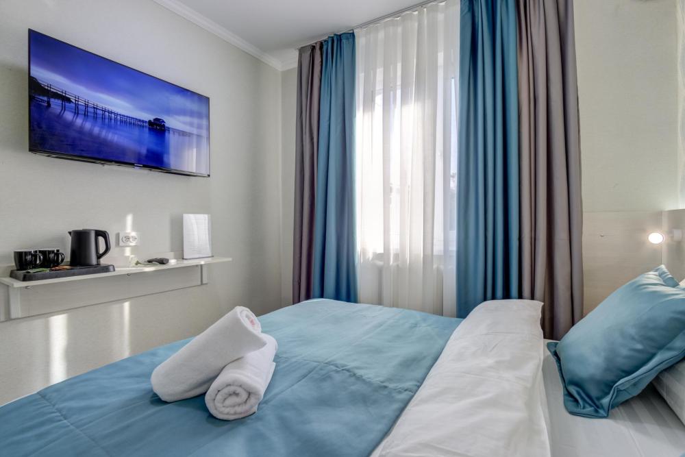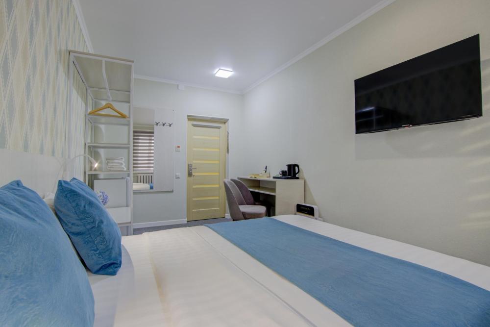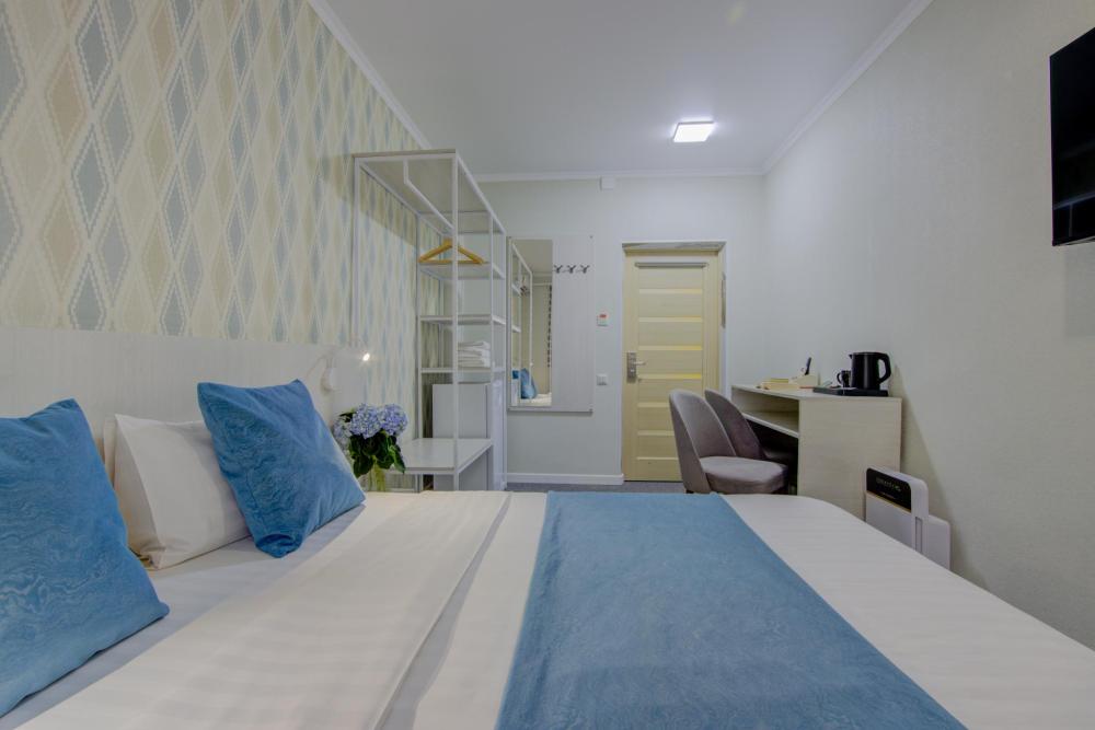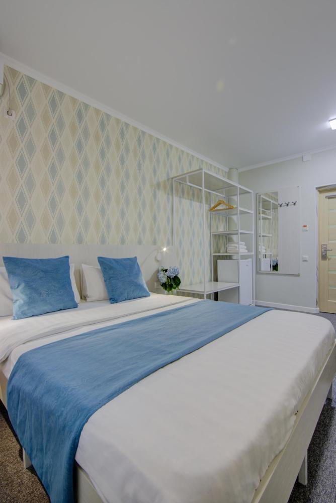 Номер Делюкс представляет собой просторный номер с одной двуспальной кроватью и собственной ванной комнатой. В перечень дополнительных удобств входят: холодильник, шкаф для одежды, сейф и халаты.