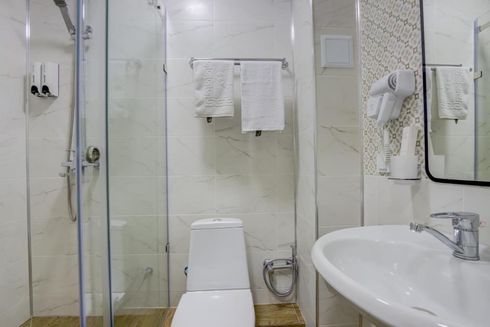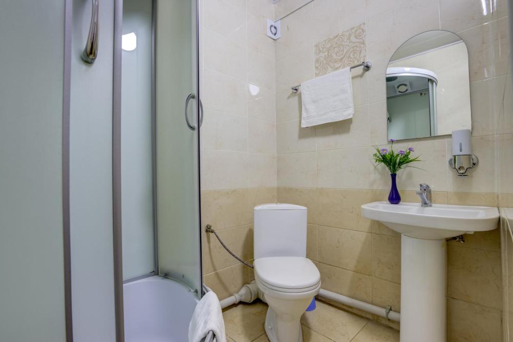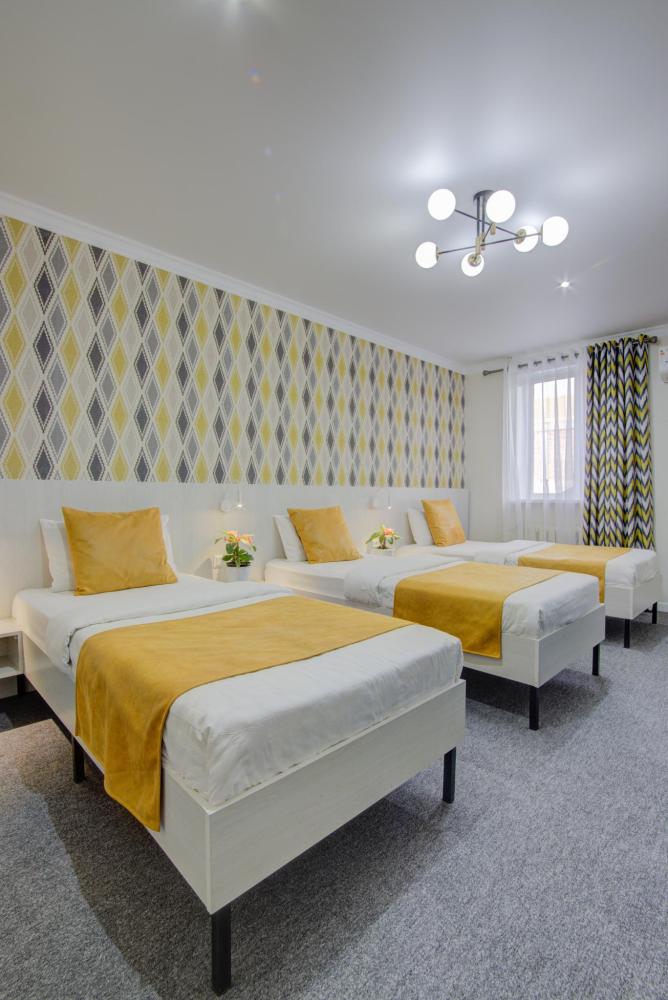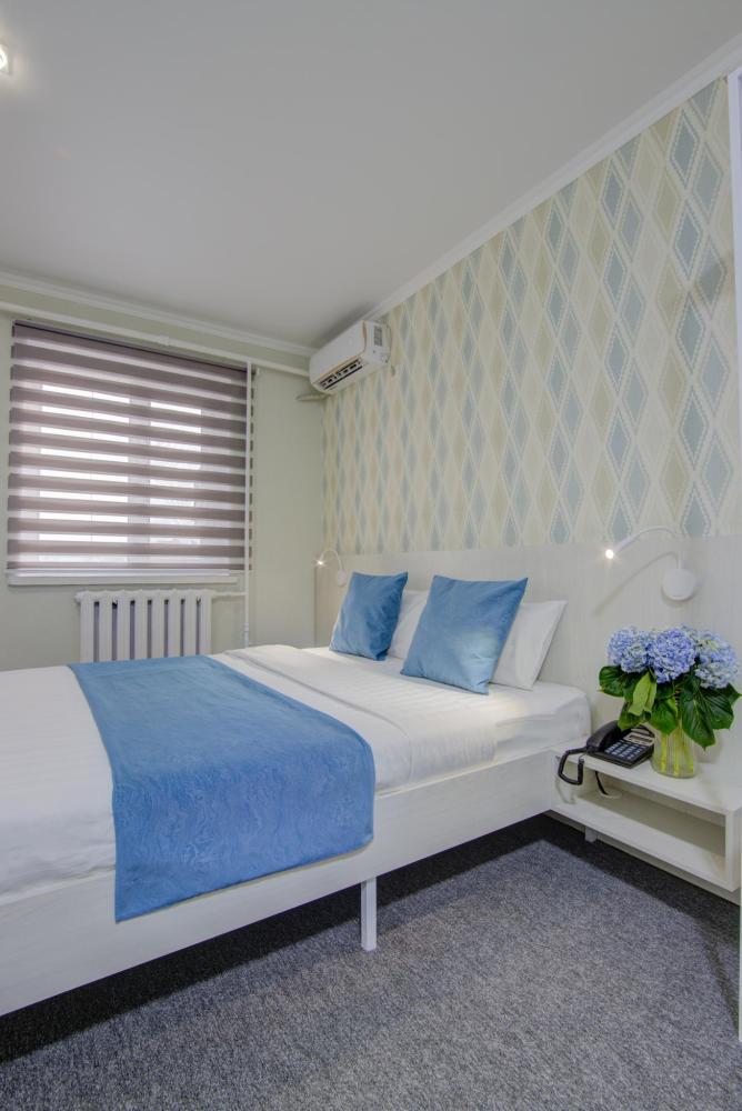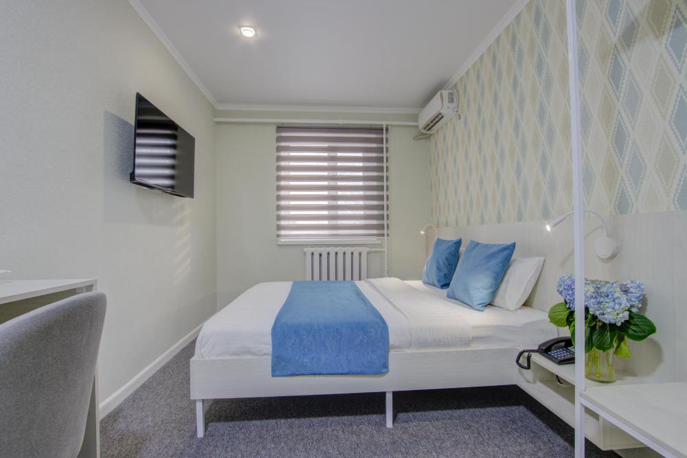 Номер двухместный с одной кроватью, номера оформлены в разных красочных тонах. Номер с общей ванной комнатой