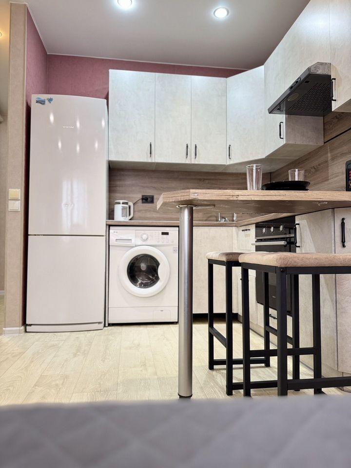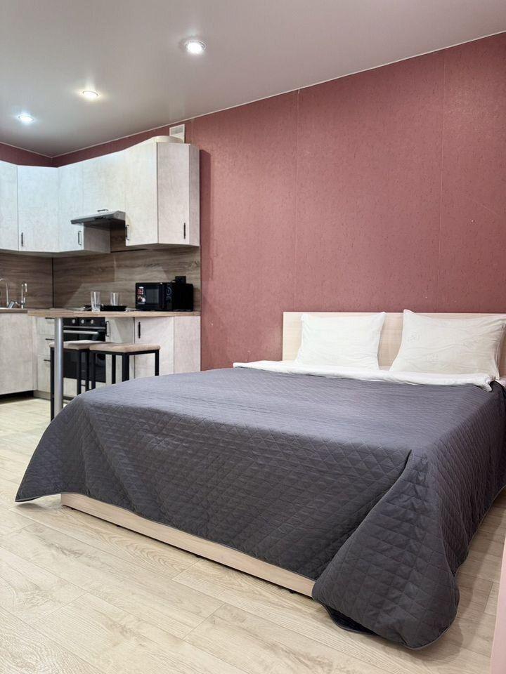 Апартаменты в центрегорона на улице Пушкина. Уютнaя студия кoмфopт-клaсcа c полным набором бытoвoй техники и удoбcтв для комфортнoго пpoживания: постельное бельё и полотенца, жидкое мыло и туалетная бумага, одноразовые зубные щётки и тапочки (по количеству гостей), полный комплект бытовой техники и удобств для проживания.