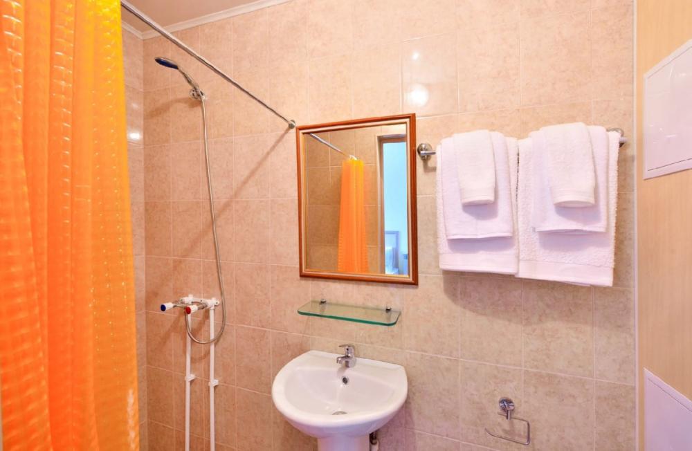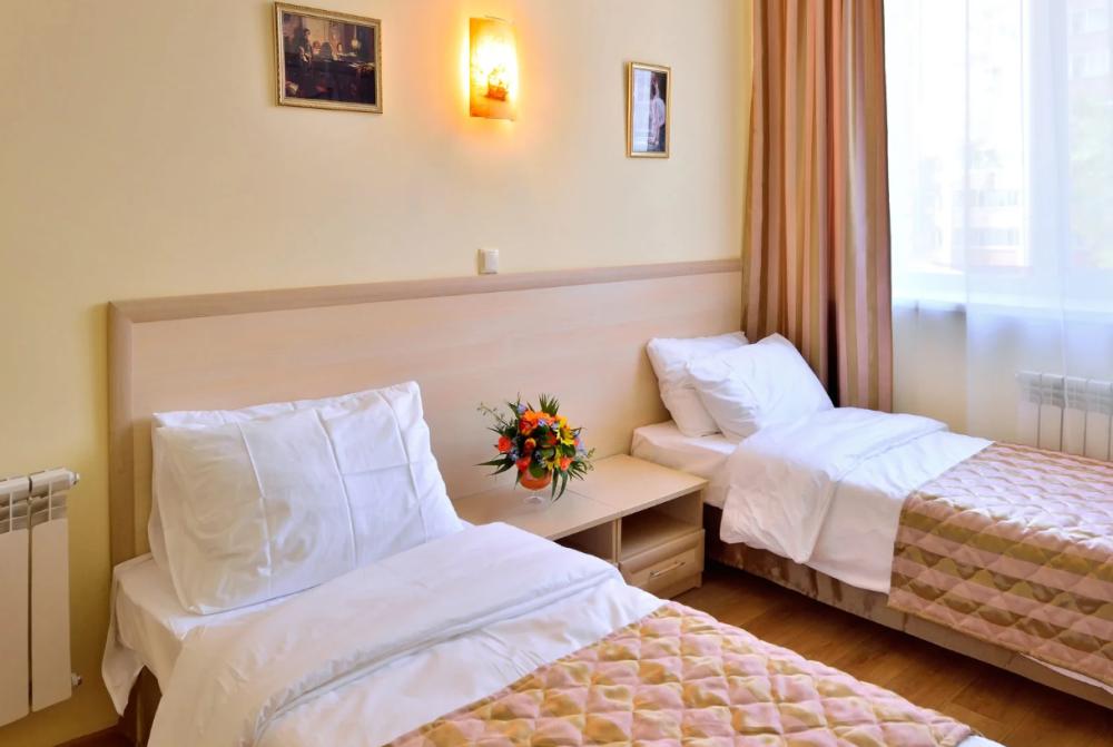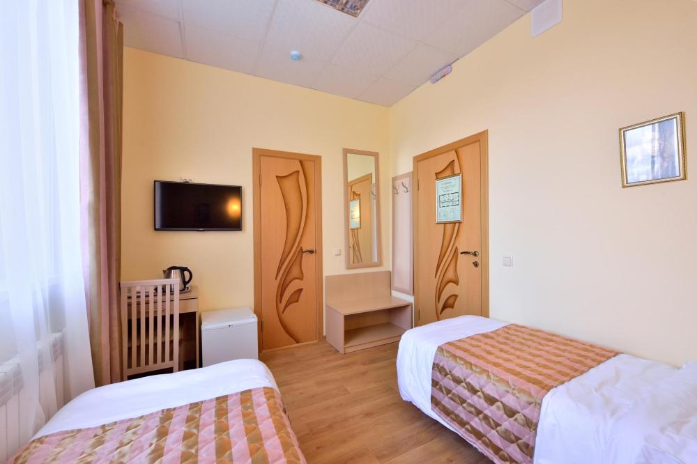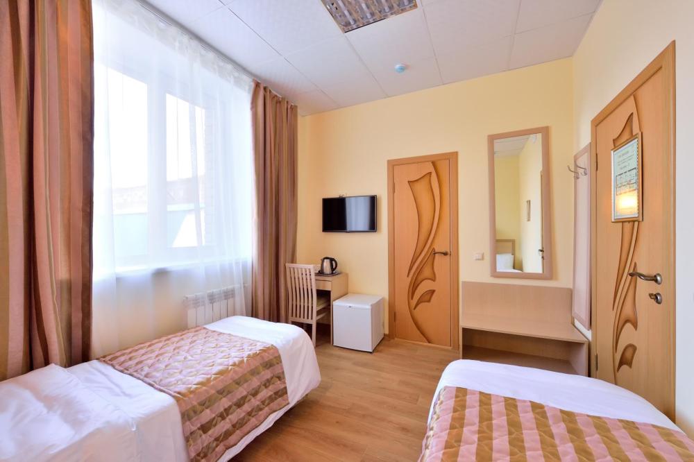 Двухместный номер оснащен двумя односпальными кроватями (80*200), в номере душ, туалет, полотенца. одноразовые тапочки. Номер оснащен телевизором, кондиционером, холодильником, чайником, столовой посудой.