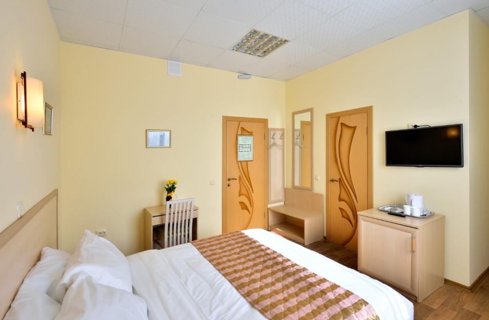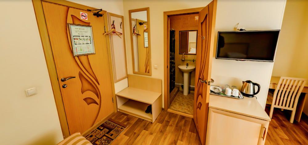 Двухместный номер оснащен двухспальной кроватью (160*200), в номере душ, туалет, полотенца. одноразовые тапочки. Номер оснащен телевизором, кондиционером, холодильником, чайником, столовой посудой.