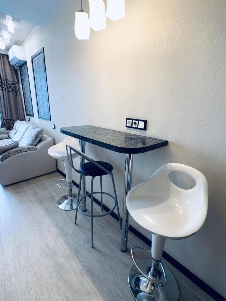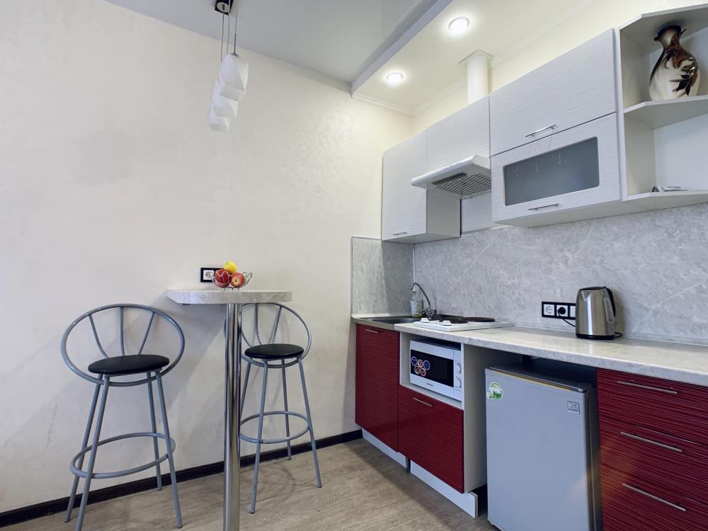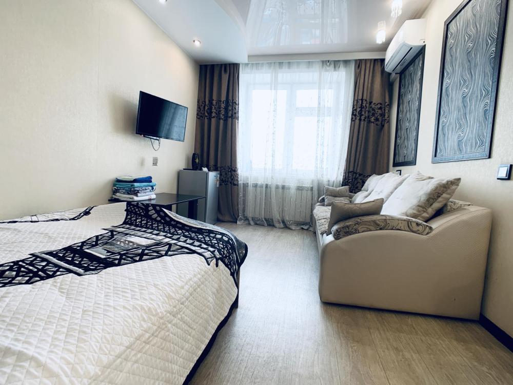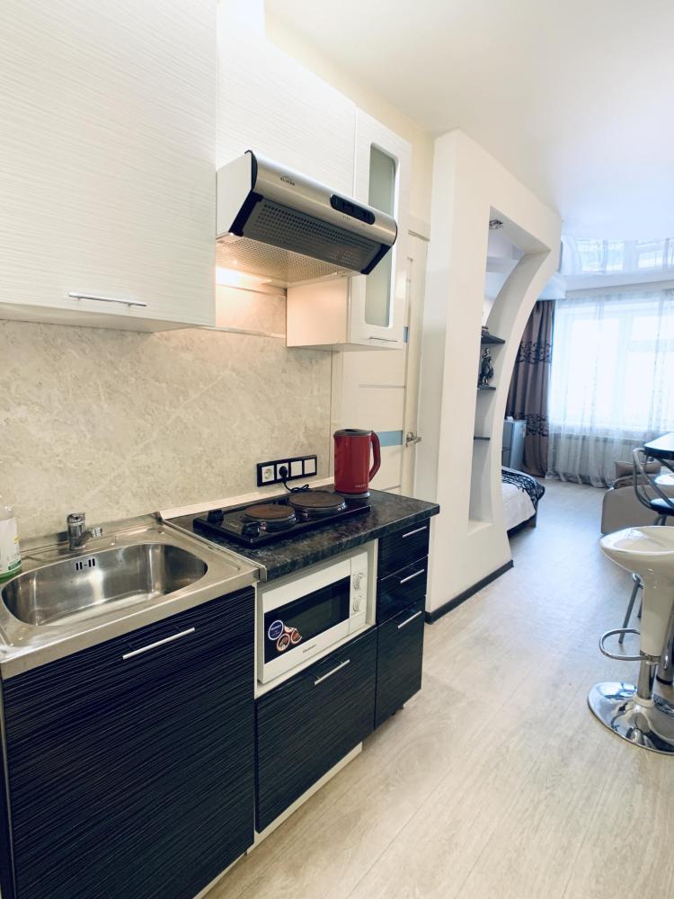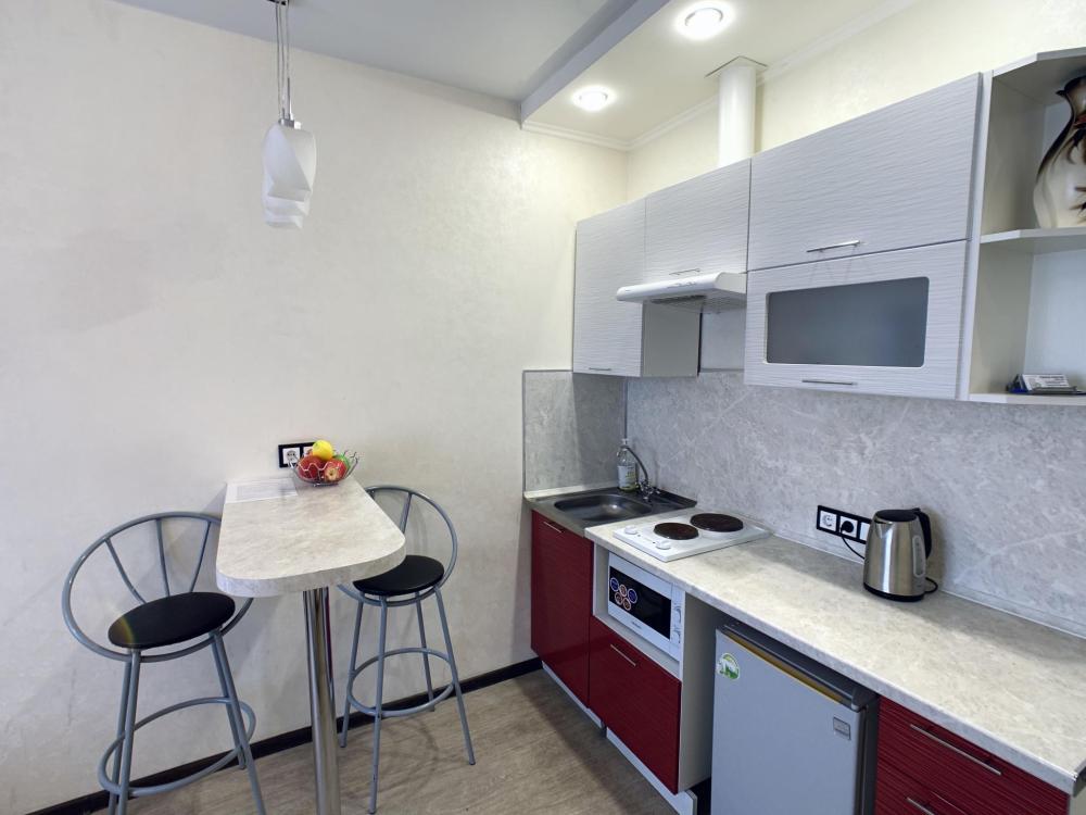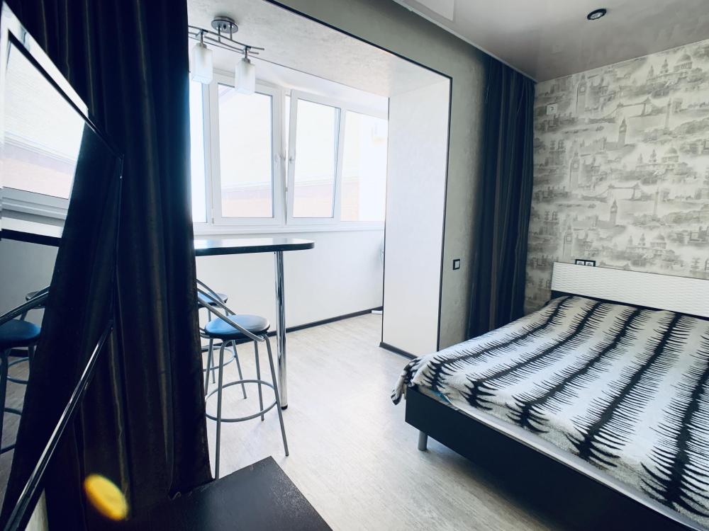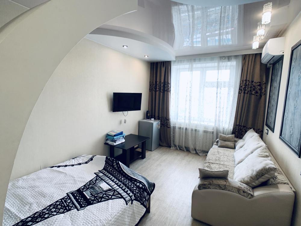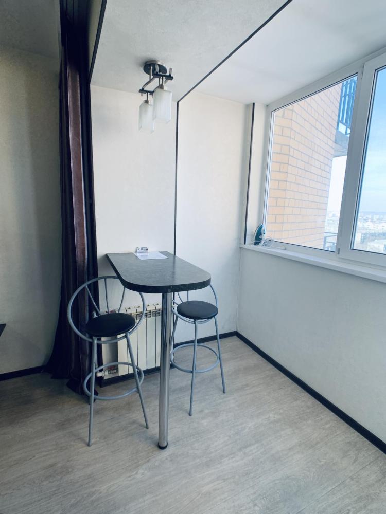 Апартаменты находятся в самом центре города на 12 этаже. В апартаментах есть высокоскоростной Wi-Fi, цифровое телевидение, кухня со столовыми принадлежностями, бытовой техникой. А так же гладильная доска, утюг, сушилка для белья, фен для сушки волос, стиральная машина автомат. Выдается чистое постельное белье и полотенца