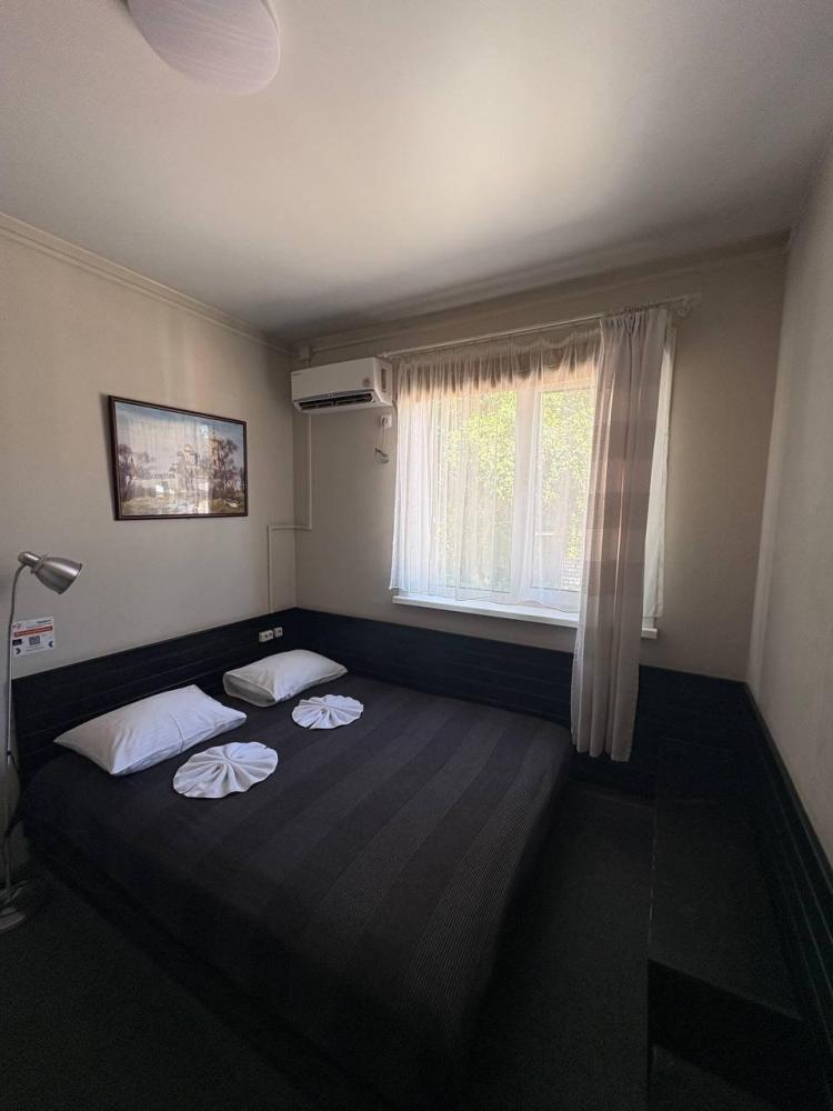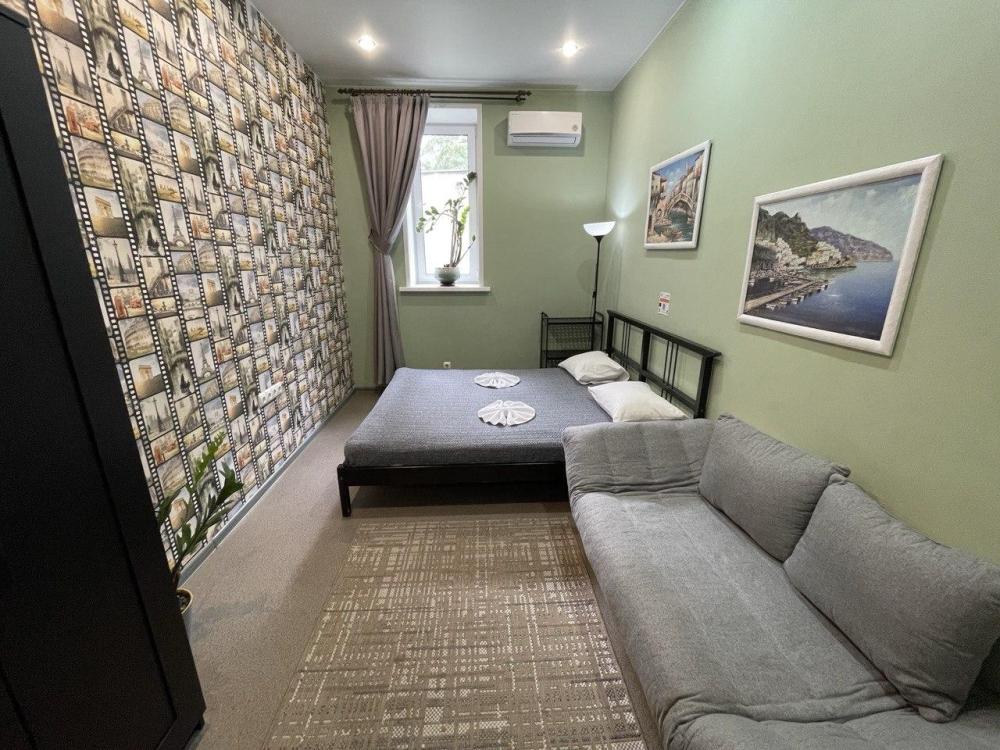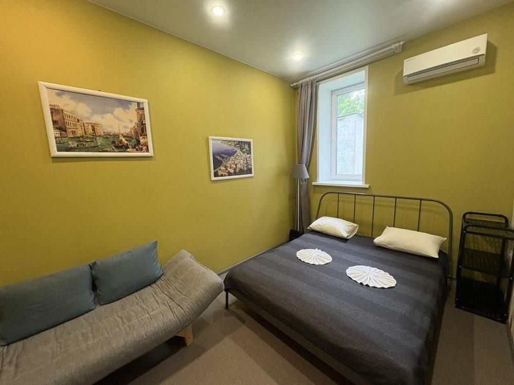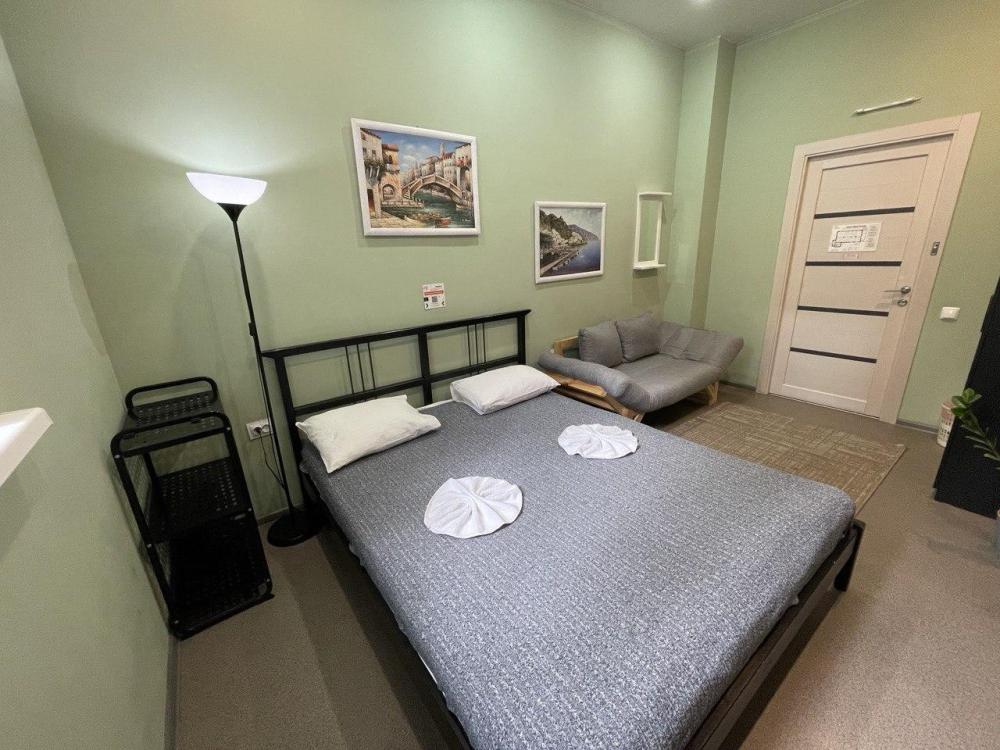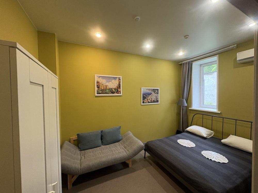 Двухспальная кровать и дполнительный диван-кровать, прикроватные тумбочки, столик для работы, гардеробный шкаф. Удобства на этаже.