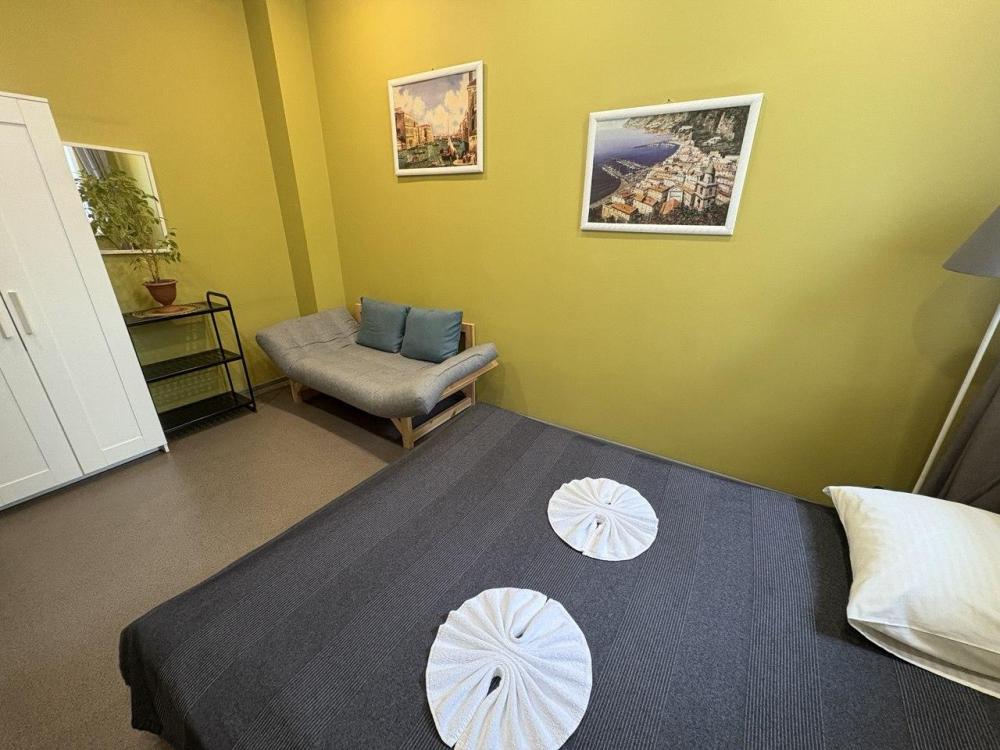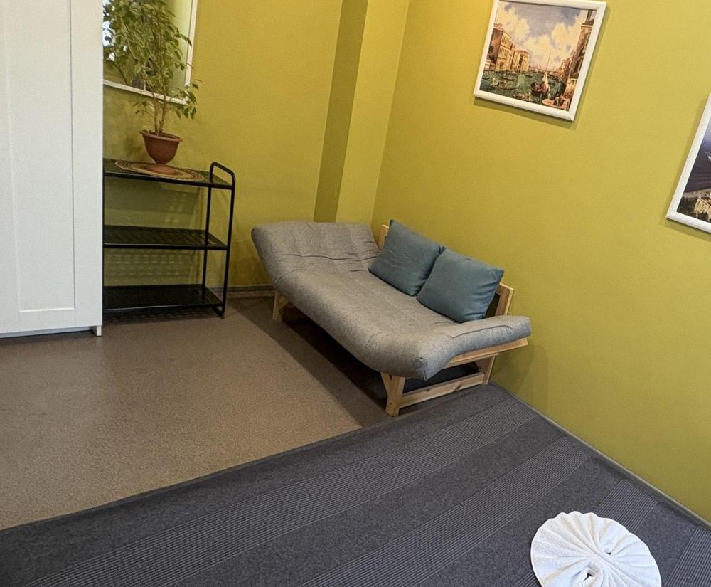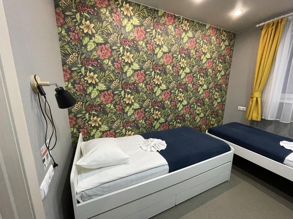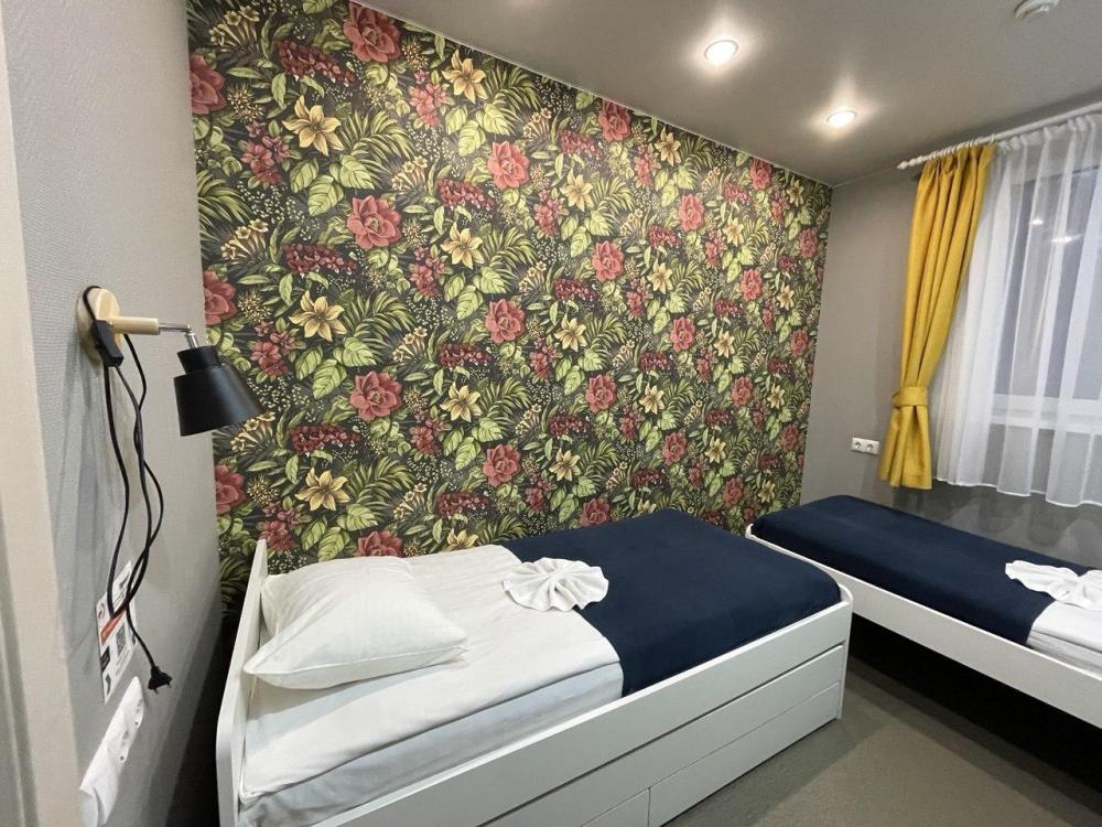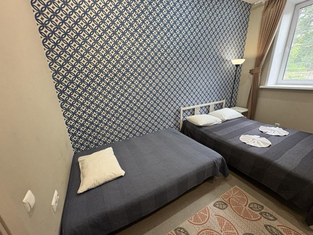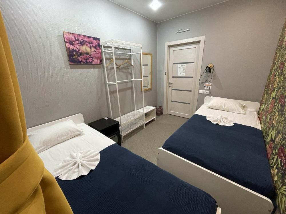 2 односпальные кровати + выдвижное спальное место. прикроватные столики, открытый гардероб. Удобства на этаже.