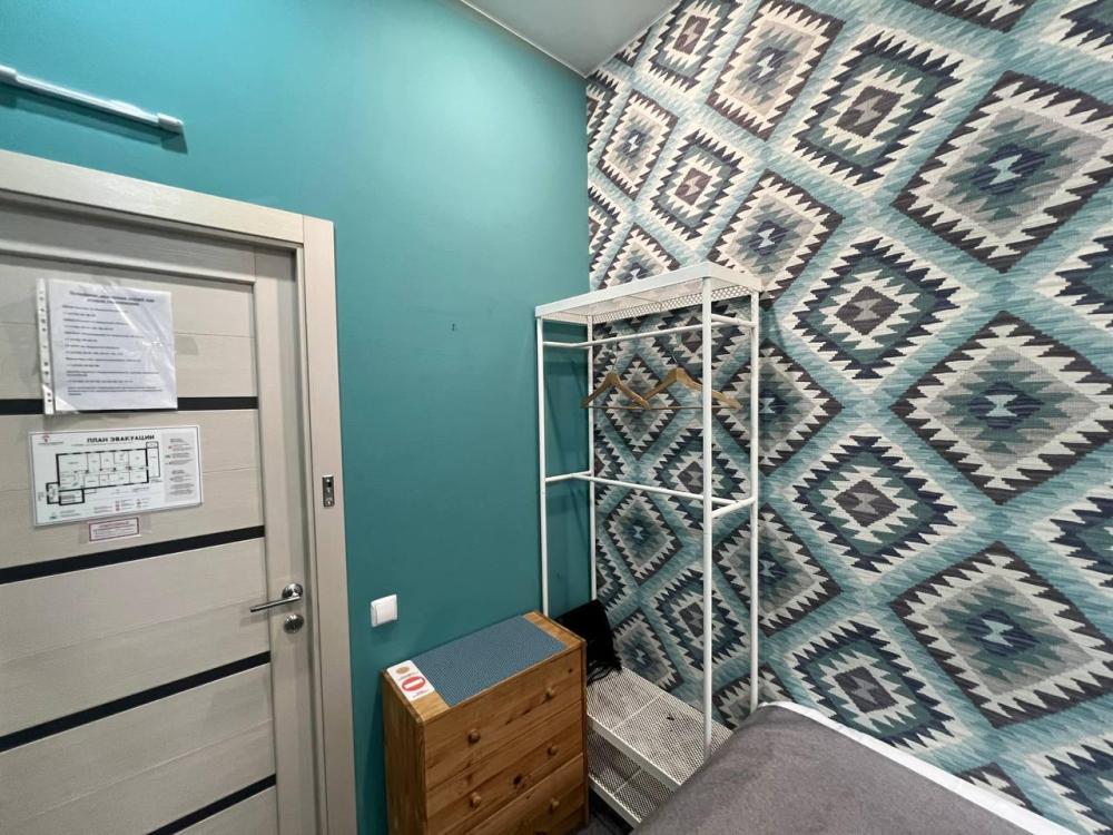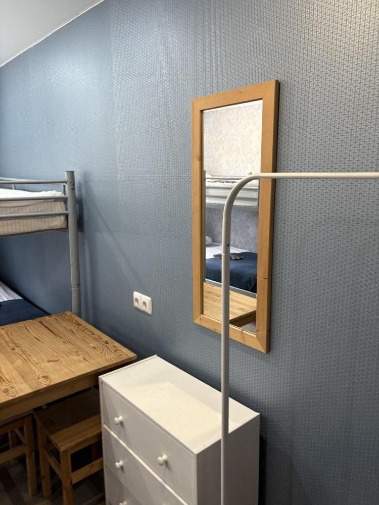В номере: три двухъярусные кровати. Зеркало, стол, несколько стульев, вешалка для одежды и так же полка для одежды
