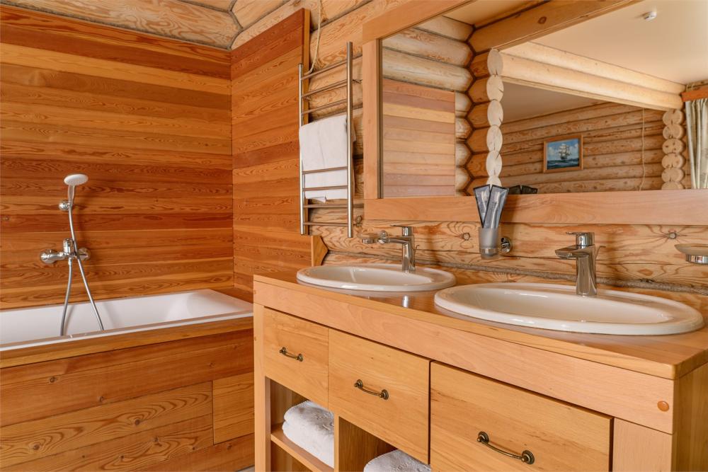 Комфортабельный, уютный, светлый двухэтажный сруб из зимнего архангельского леса, с прекрасным видом. С просторной гостиной с камином и кухонной зоной со всем необходимым для приготовления пищи. Две изолированные спальни. Санузел на каждом этаже.
