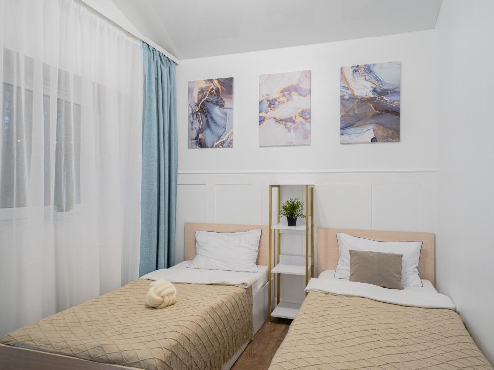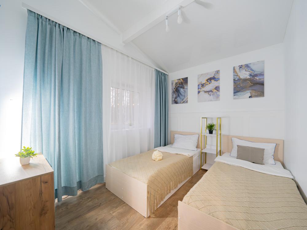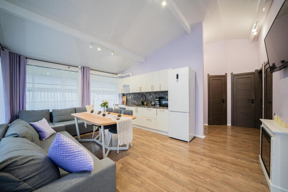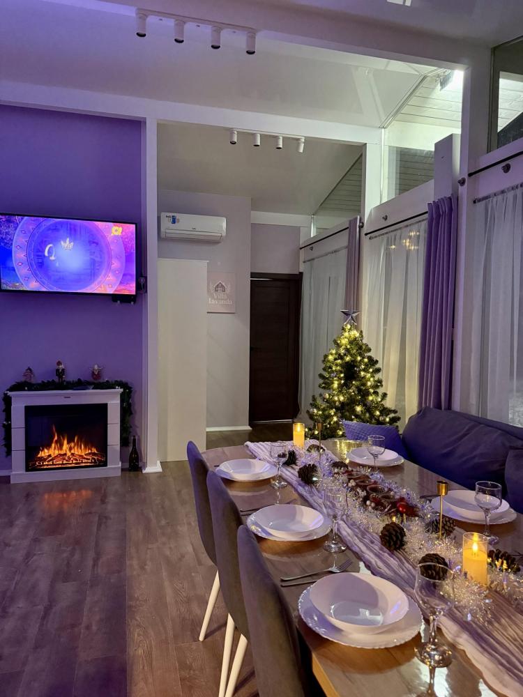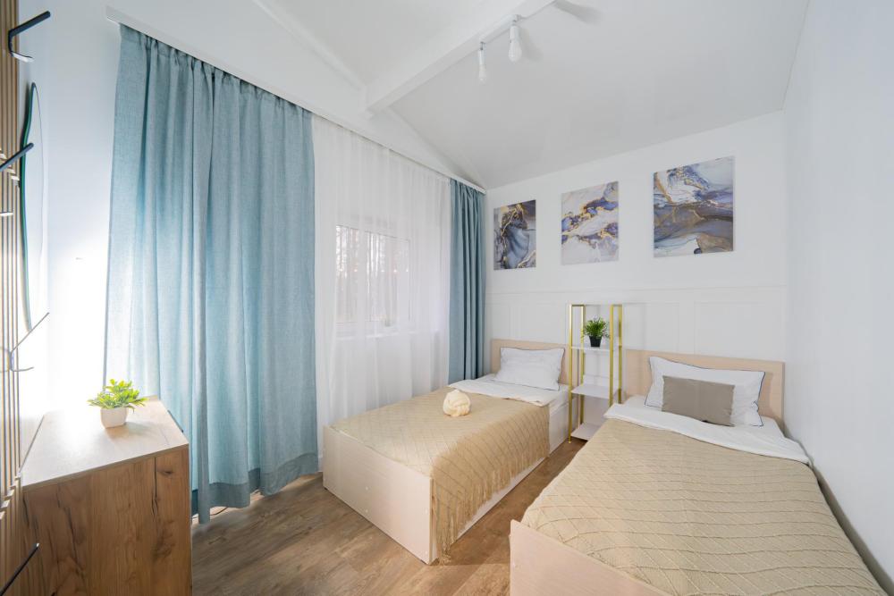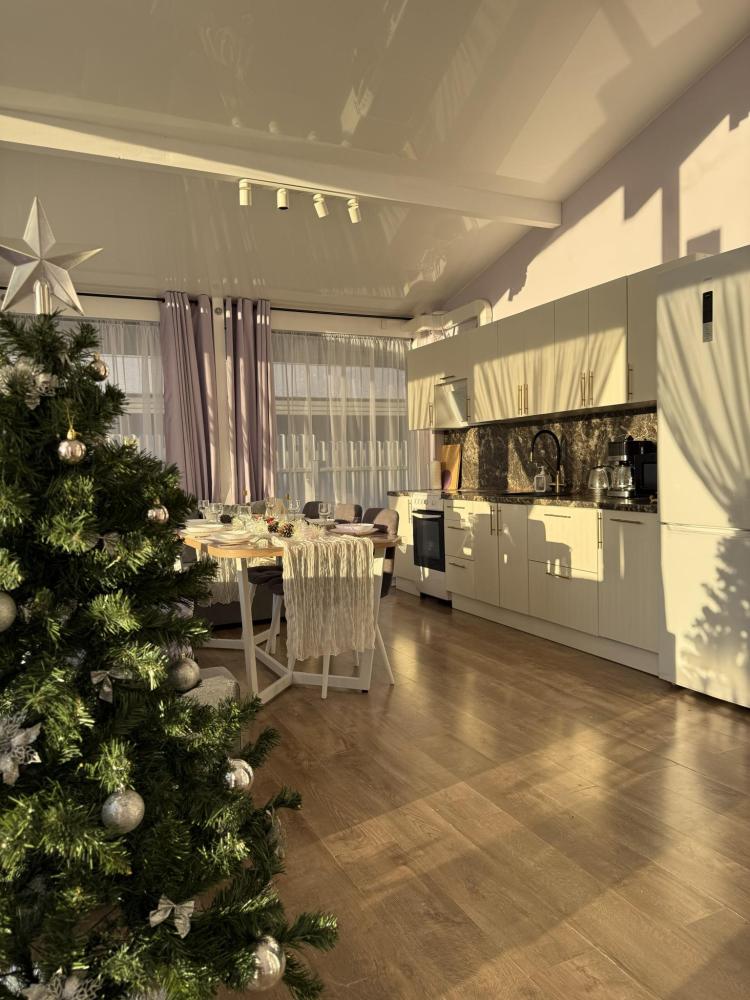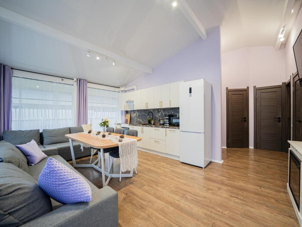 На участке расположены: одноэтажный дом с панорамными окнами 70 кв. м., парковка на 3 автомобиля с видеонаблюдением, зеленая лужайка перед домом, мангальная зона с садовой мебелью. Большая кухня-гостиная 30 м2 с электрокамином, а также высокими потолками, создающими неповторимую сказочную атмосферу уюта. Оснащение кухни: микроволновая печь, электроплита с духовым шкафом и вытяжкой, посудомоечная машина, чайник, холодильник, капельная кофемашина, полный набор посуды — тарелки, стаканы, бокалы, кастрюли, сковородки, разделочные доски и столовые приборы; таблетки для посудомоечной машины и стиральный порошок, а также чистящие и моющие средства предоставляются бесплатно. В кухне-гостиной имеется 2 раздвижных больших дивана Икеа. Телевизор со спутниковой антенной и множеством каналов, а также возможностью подключения своей караоке-системы. Кондиционер на случай жаркой погоды. Раздельный санузел с полотенцами, средствами гигиены (мыло, гель для душа), феном, теплым полом, бойлером на 100 литров и стиральной машинкой. Душевая кабина с современной душевой системой и тропическим душем. Две спальни с двуспальными кроватями King size, размером 180*200, матрасами Аскона, чистым постельным бельем и шкафами для одежды. Одна спальня с двумя односпальными кроватями, размером 90*200 и комодом. Также в доме: безлимитный WI-FI, детская кроватка предоставляется по запросу, настольные игры для и детские игрушки с книгами. Ватрушка и снегокат в отдельном гостевом хоз.блоке.