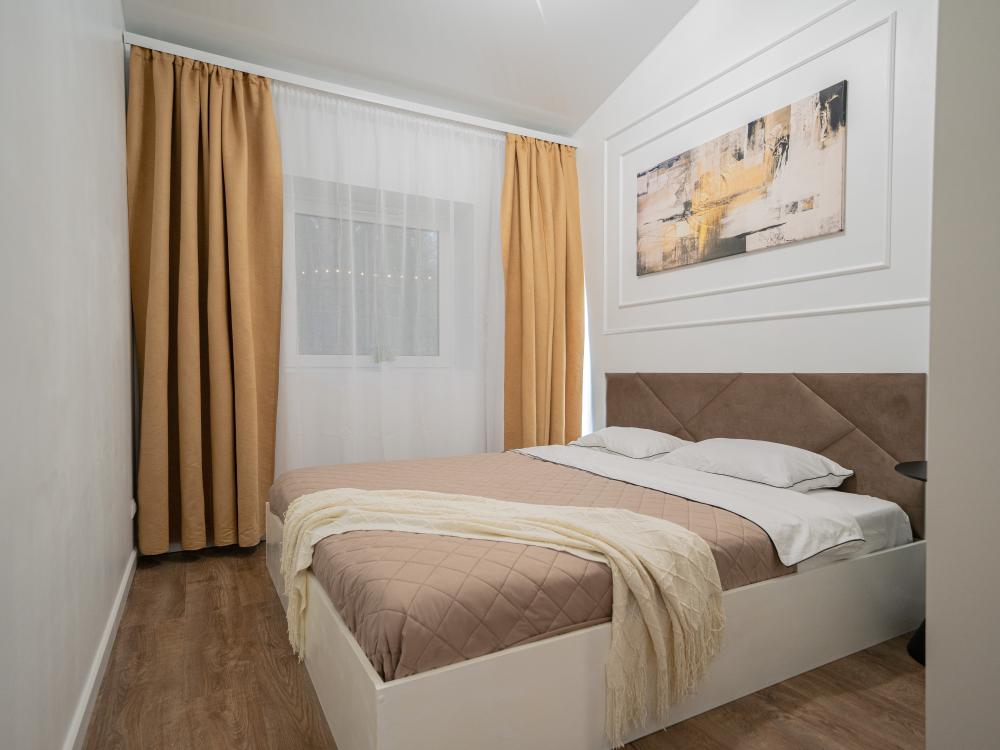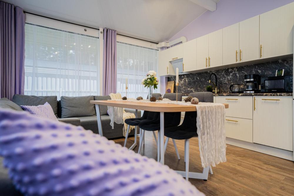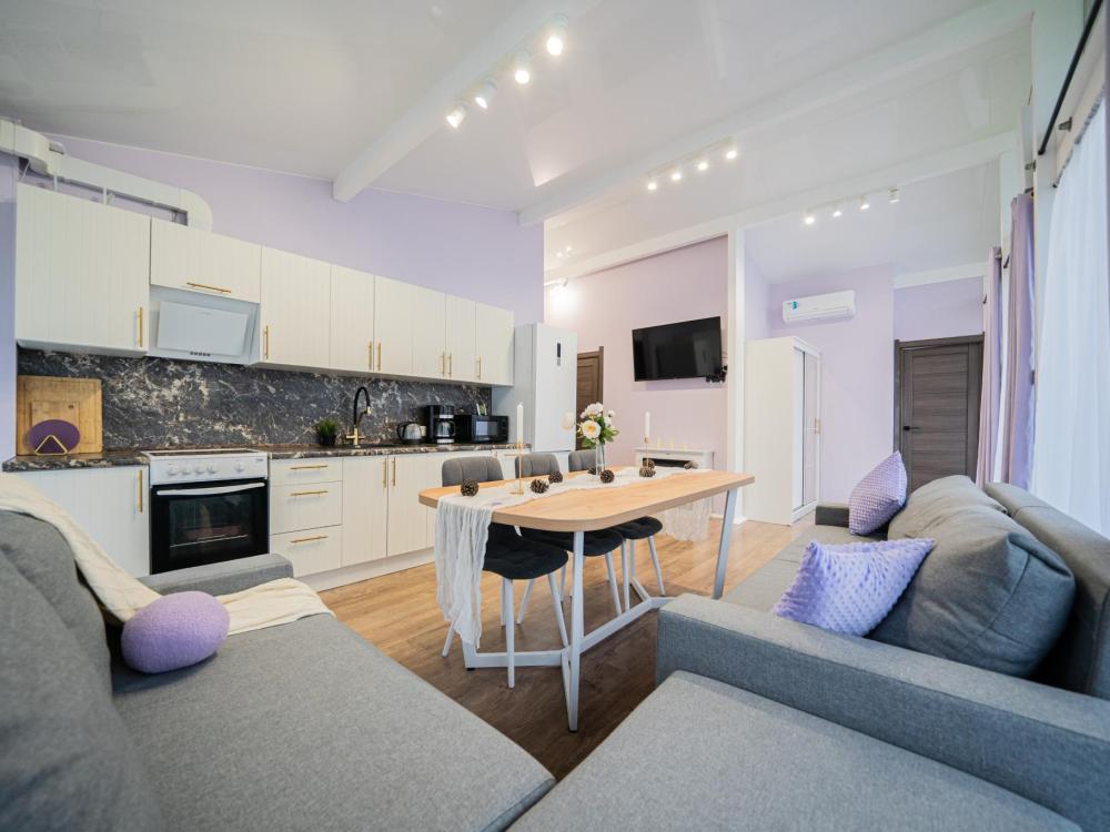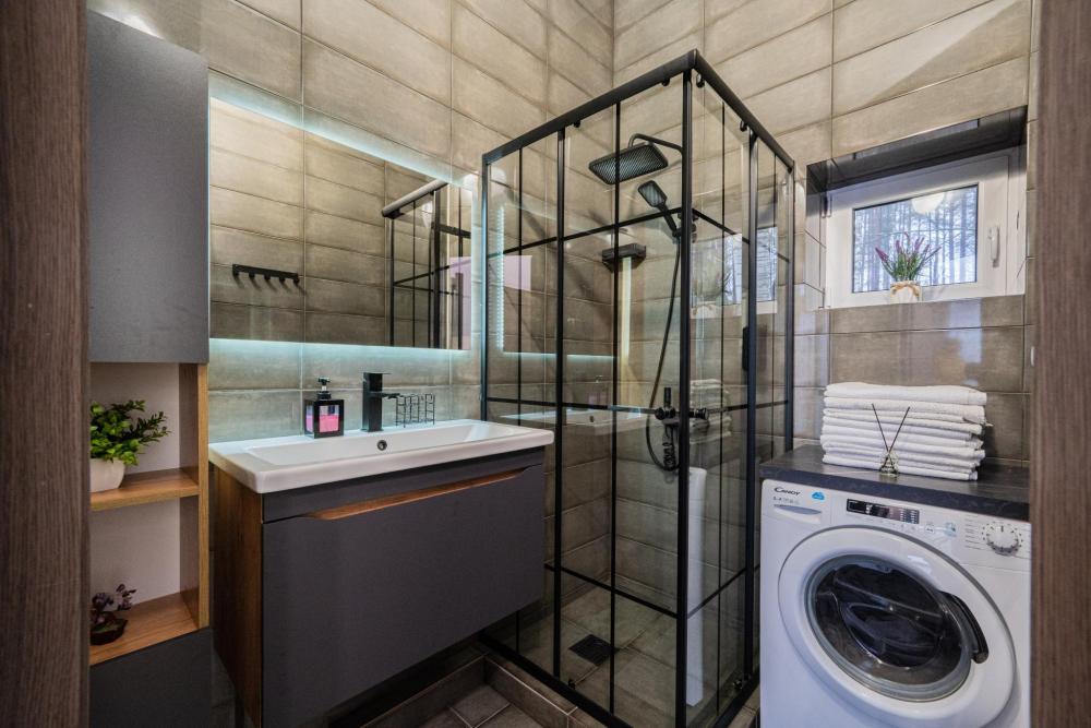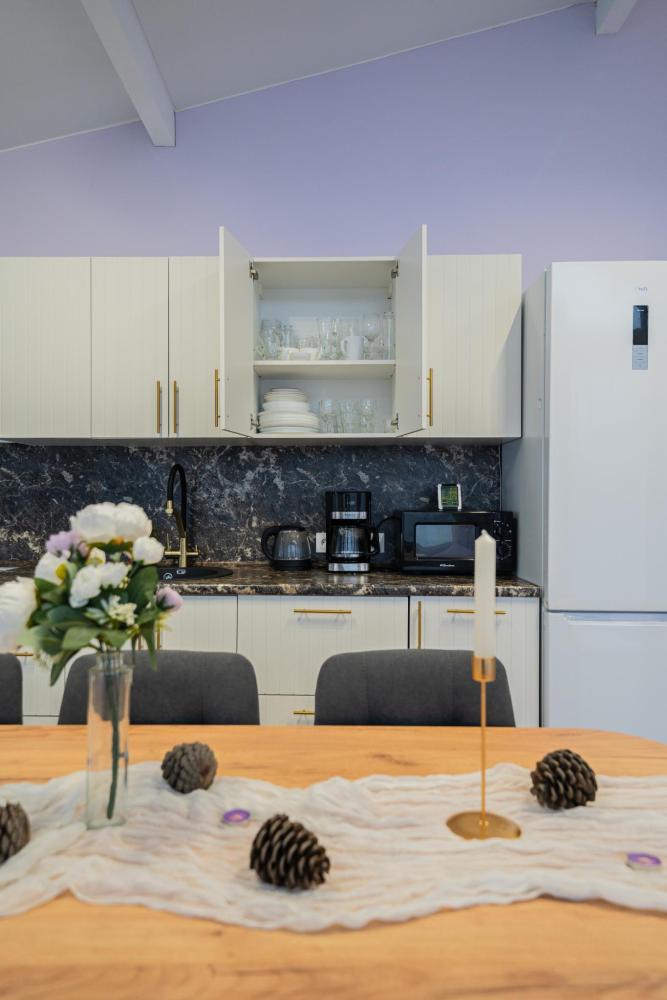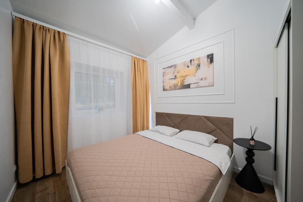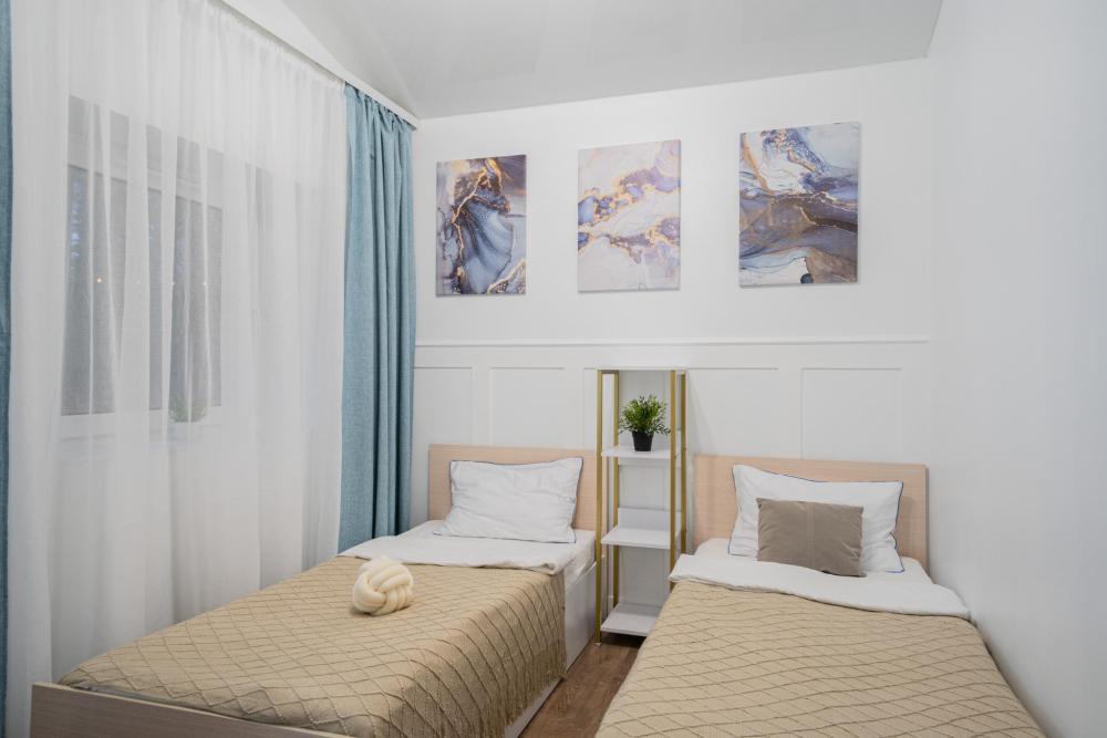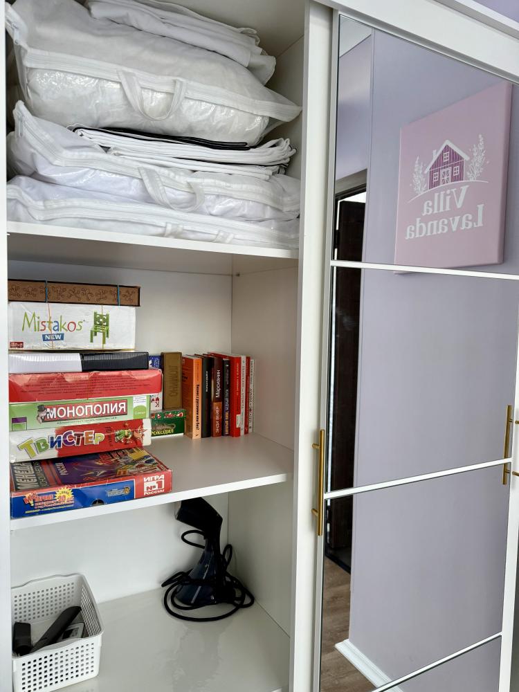 На участке расположены: одноэтажный дом с панорамными окнами 70 кв. м., парковка на 3 автомобиля с видеонаблюдением, зеленая лужайка перед домом, мангальная зона с садовой мебелью. Большая кухня-гостиная 30 м2 с электрокамином, а также высокими потолками, создающими неповторимую сказочную атмосферу уюта. Оснащение кухни: микроволновая печь, электроплита с духовым шкафом и вытяжкой, посудомоечная машина, чайник, холодильник, капельная кофемашина, полный набор посуды — тарелки, стаканы, бокалы, кастрюли, сковородки, разделочные доски и столовые приборы; таблетки для посудомоечной машины и стиральный порошок, а также чистящие и моющие средства предоставляются бесплатно. В кухне-гостиной имеется 2 раздвижных больших дивана Икеа. Телевизор со спутниковой антенной и множеством каналов, а также возможностью подключения своей караоке-системы. Кондиционер на случай жаркой погоды. Раздельный санузел с полотенцами, средствами гигиены (мыло, гель для душа), феном, теплым полом, бойлером на 100 литров и стиральной машинкой. Душевая кабина с современной душевой системой и тропическим душем. Две спальни с двуспальными кроватями King size, размером 180*200, матрасами Аскона, чистым постельным бельем и шкафами для одежды. Одна спальня с двумя односпальными кроватями, размером 90*200 и комодом. Также в доме: безлимитный WI-FI, детская кроватка предоставляется по запросу, настольные игры для и детские игрушки с книгами. Ватрушка и снегокат в отдельном гостевом хоз.блоке.