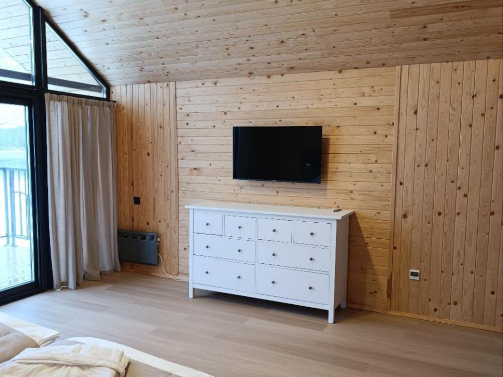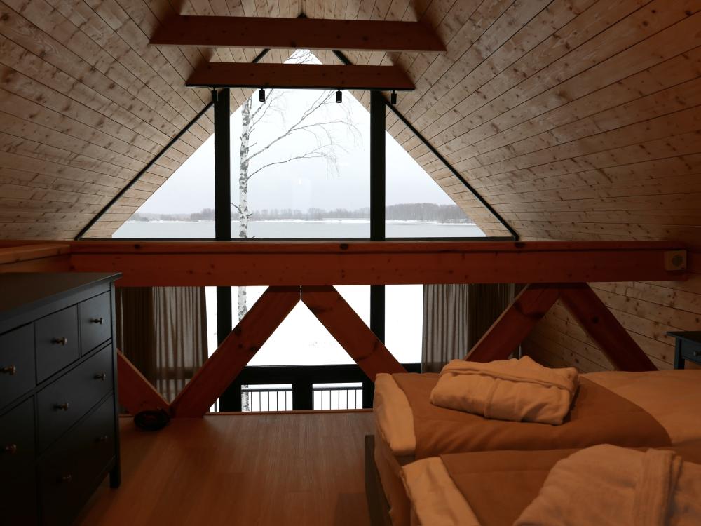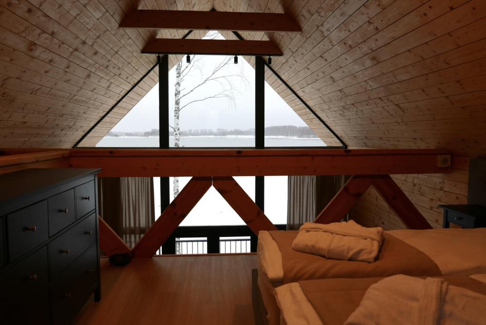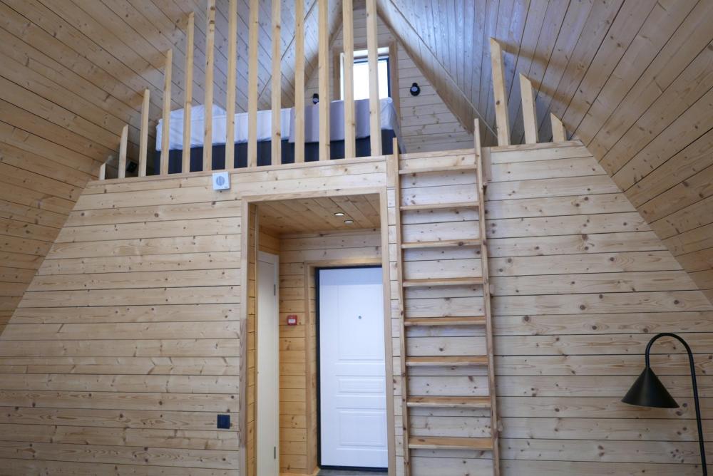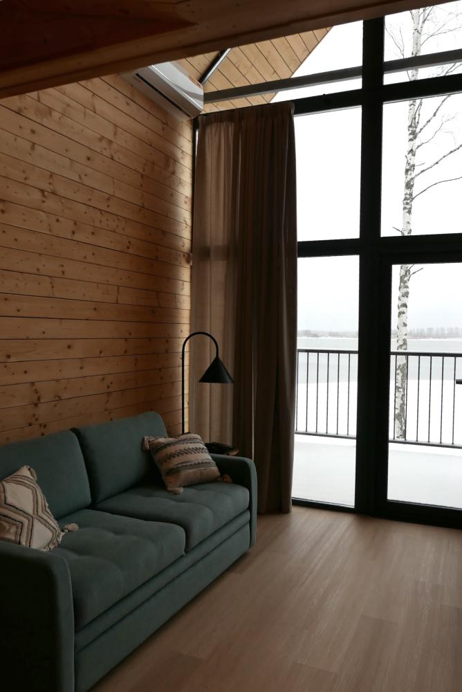 Современный А-фрейм с панорамными окнами и открытой террасой с видом на Рыбинское водохранилище. В А-фрейме: 6 комфортабельных односпальных кроватей трансформеров, при необходимости объединяются в двуспальные, микроволновая печь, электрический чайник, холодильник, кондиционер, санузел с душем. Гостям предоставляется постельное белье и полотенца.