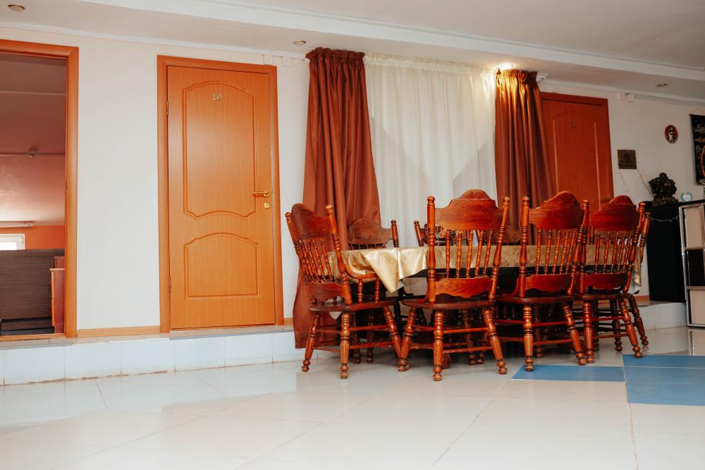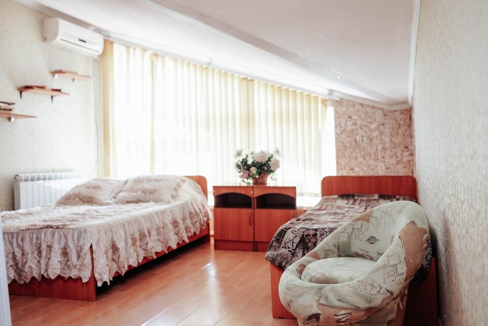 В номере: две односпальные кровати, прикроватные тумбочки, телевизор, шкаф. Санузел на этаже.