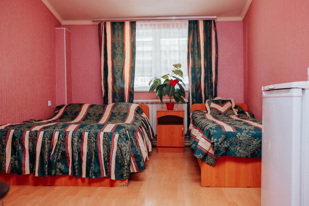 В номере: две односпальные кровати, прикроватные тумбочки, телевизор, холодильник, стол, удобства в номере.