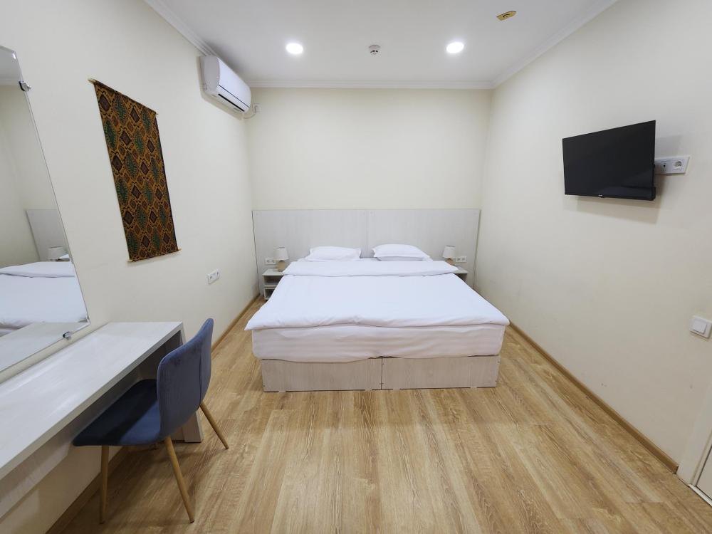 Номер оснащен следующими удобствами: кондиционер, чайник, тумба,2 односпальные кровати, шкаф, холодильник, телевизор, туалетные принадлежности, зеркало, душ.