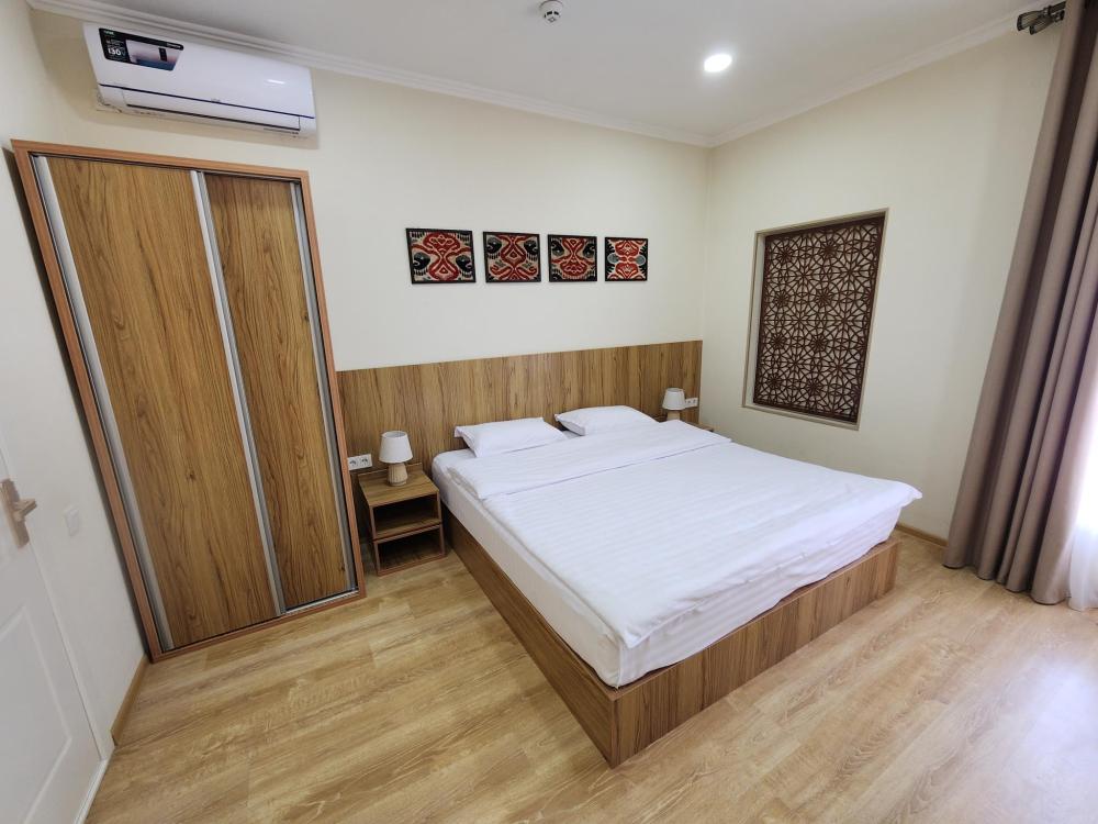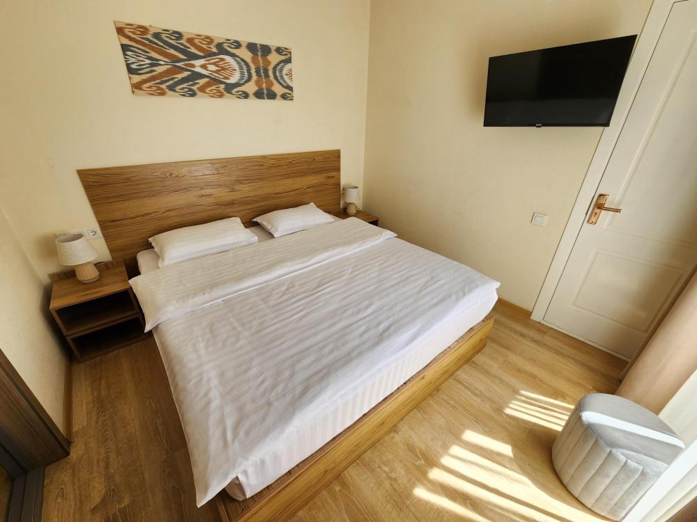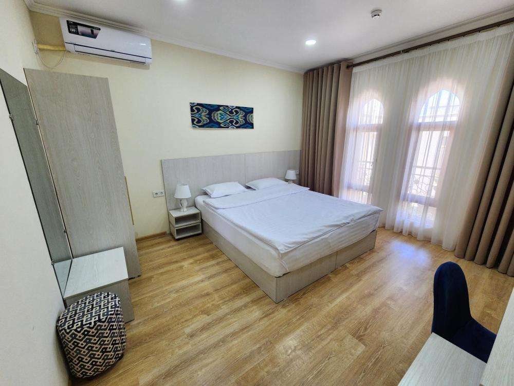 Номер оснащен следующими удобствами: кондиционер, тумба, одна большая кровать, шкаф, холодильник, телевизор, туалетные принадлежности, зеркало, душ.