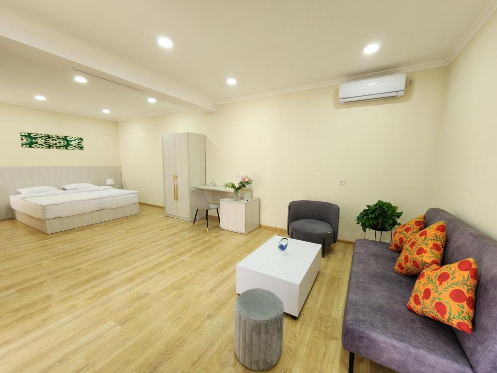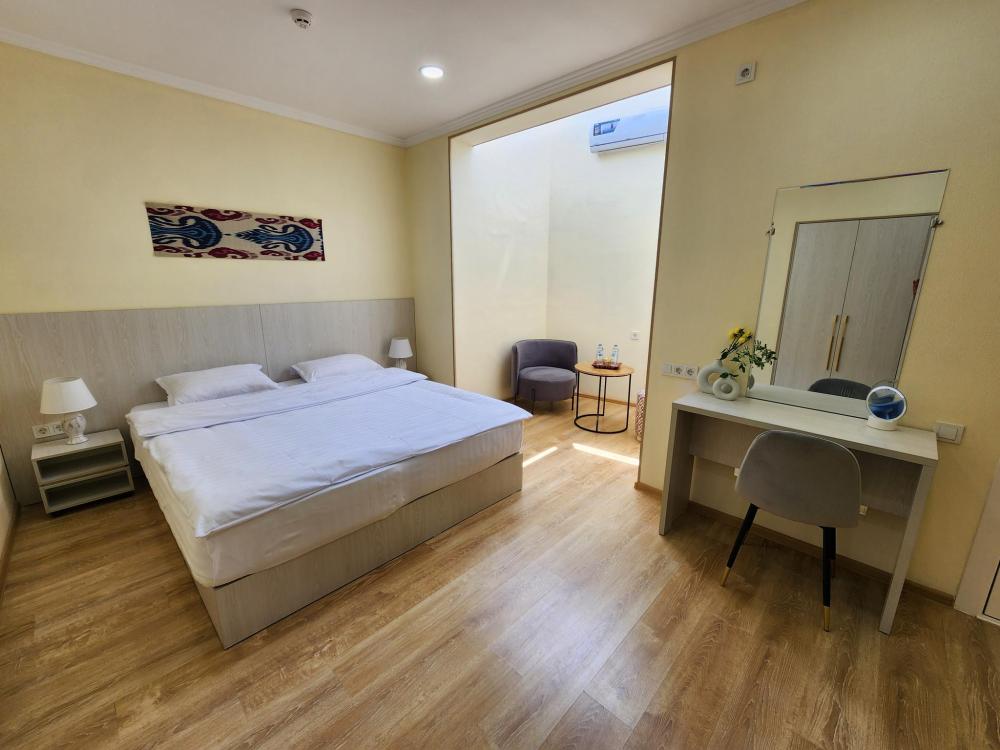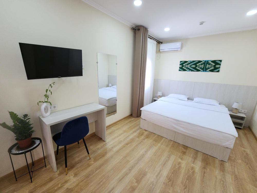 Номер оснащен следующими удобствами: кондиционер, тумба, одна большая спальные кровать, шкаф, холодильник, телевизор, туалетные принадлежности, зеркало, душ.