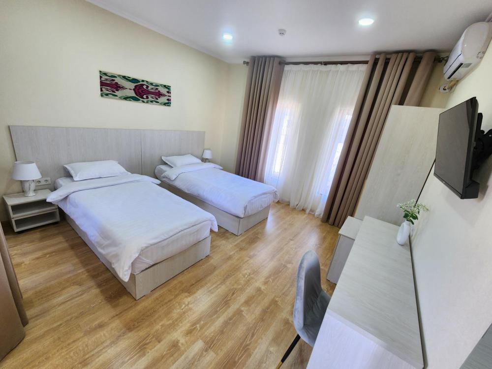 Номер оснащен следующими удобствами: кондиционер, тумба, стол, 2 односпальные кровати, шкаф, холодильник, телевизор, туалетные принадлежности, зеркало, душ.