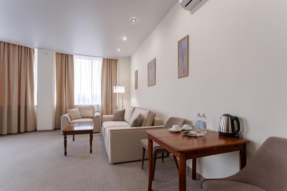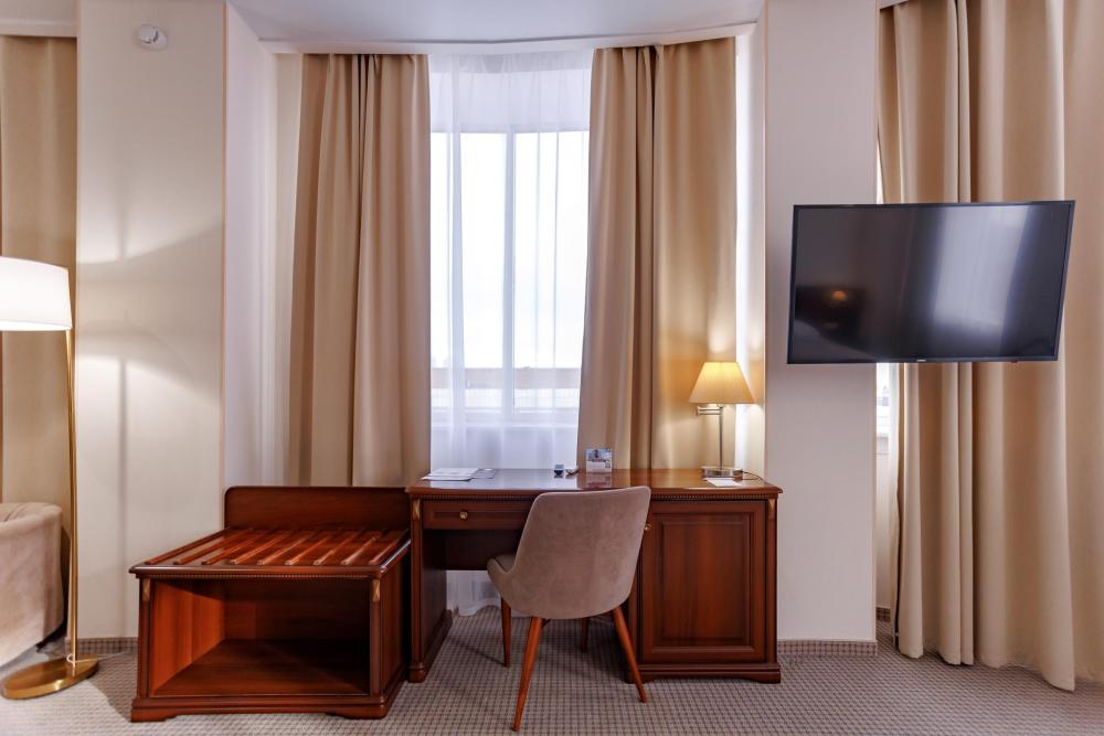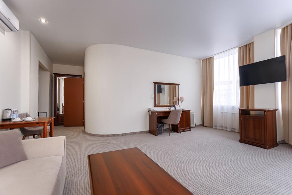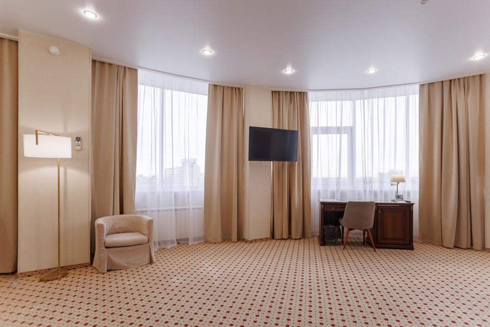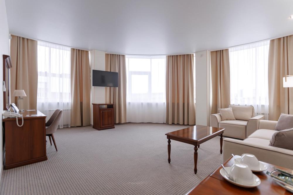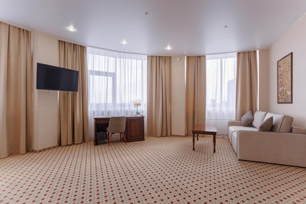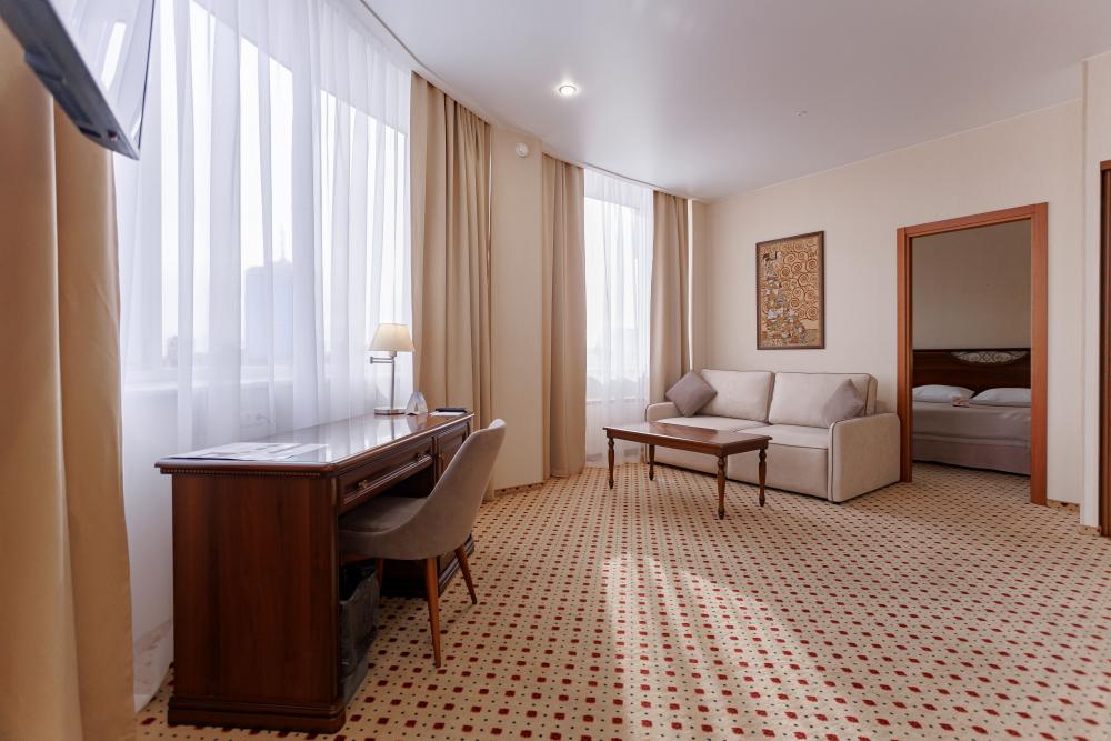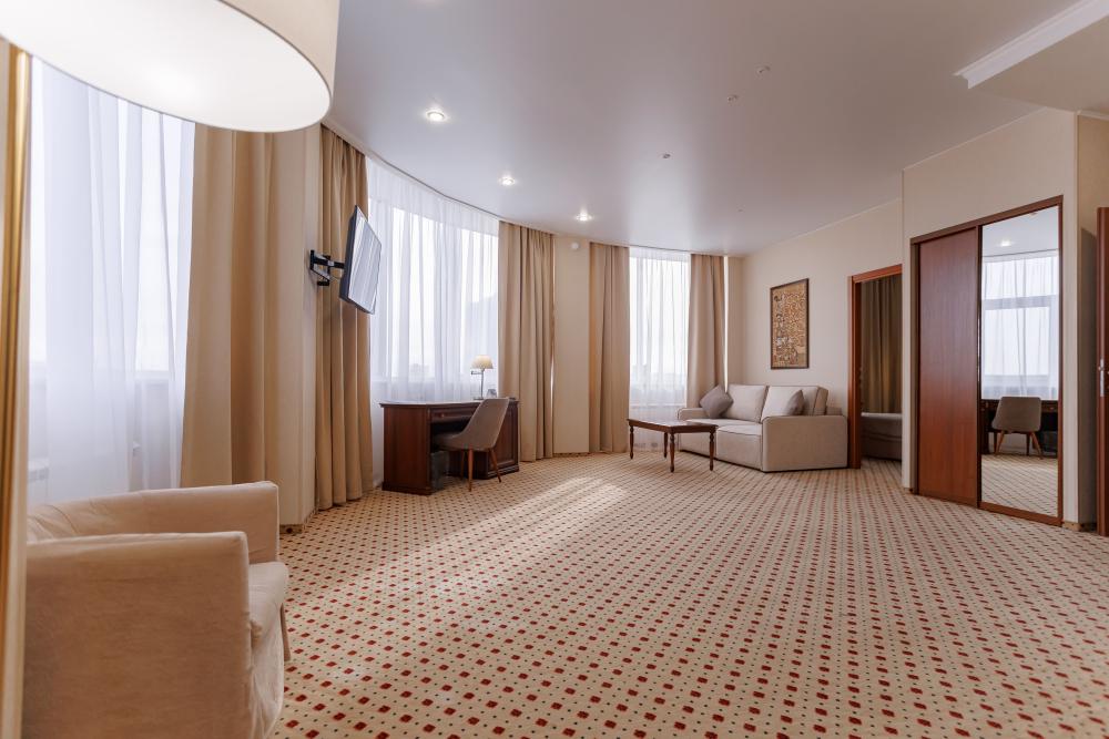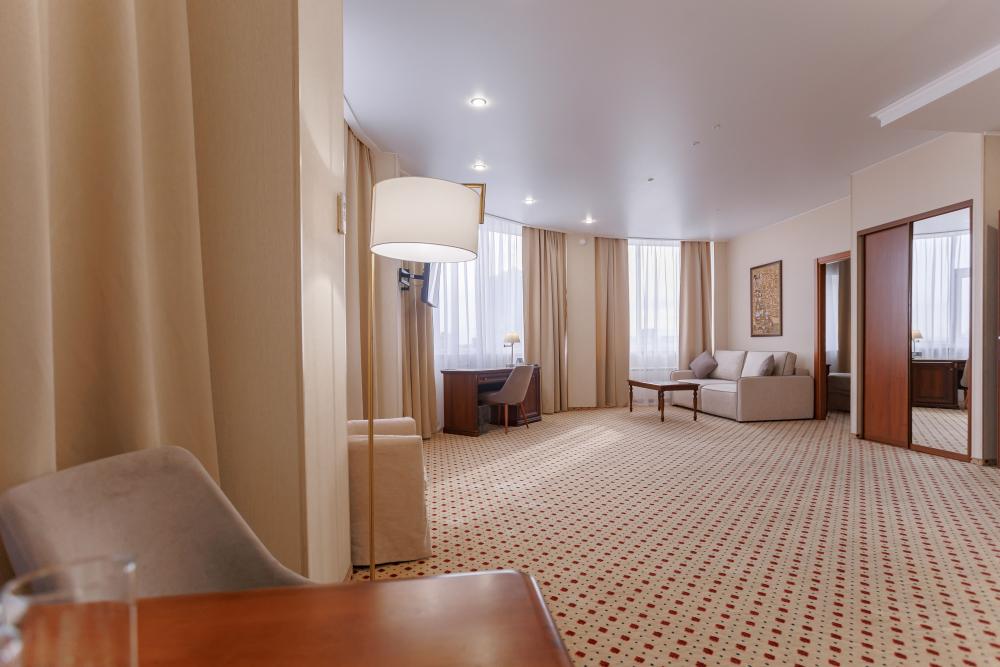 Панорамный двухкомнатный люкс оформлен в классических, сдержанных тонах. Большие панорамные окна делают этот номер идеальным для ценителей роскошных и просторных интерьеров. Номер площадью 60 кв.м., состоящий из спальни и гостиной с обеденной зоной. В номере большая двуспальная кровать 180х200 см, рабочее место, мягкая кожаная мебель, санузел с паровой душевой кабиной. Панорамные окна создают впечатление роскоши и комфорта.