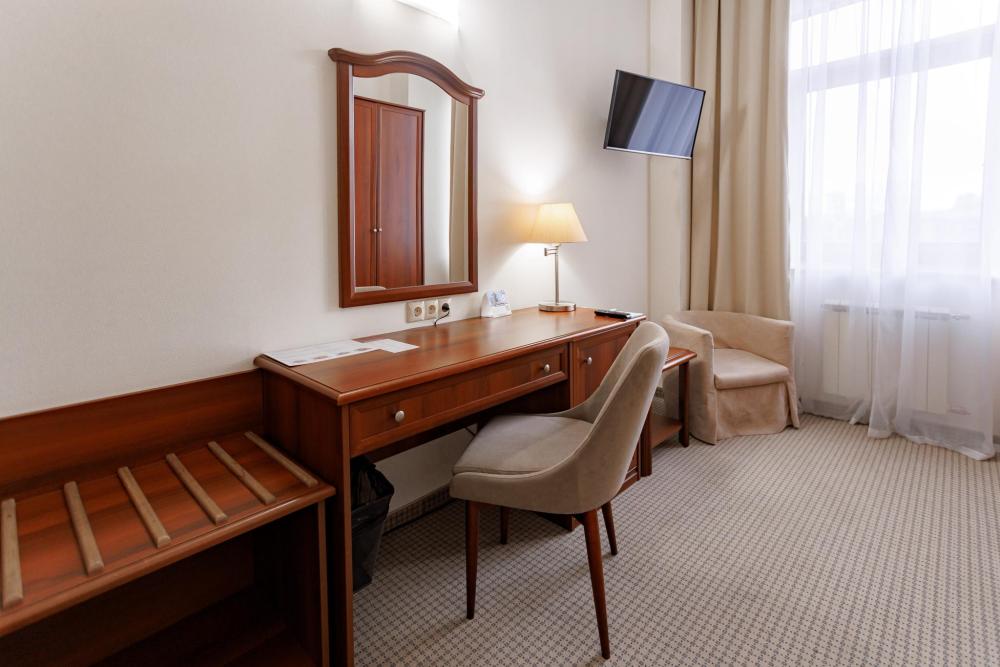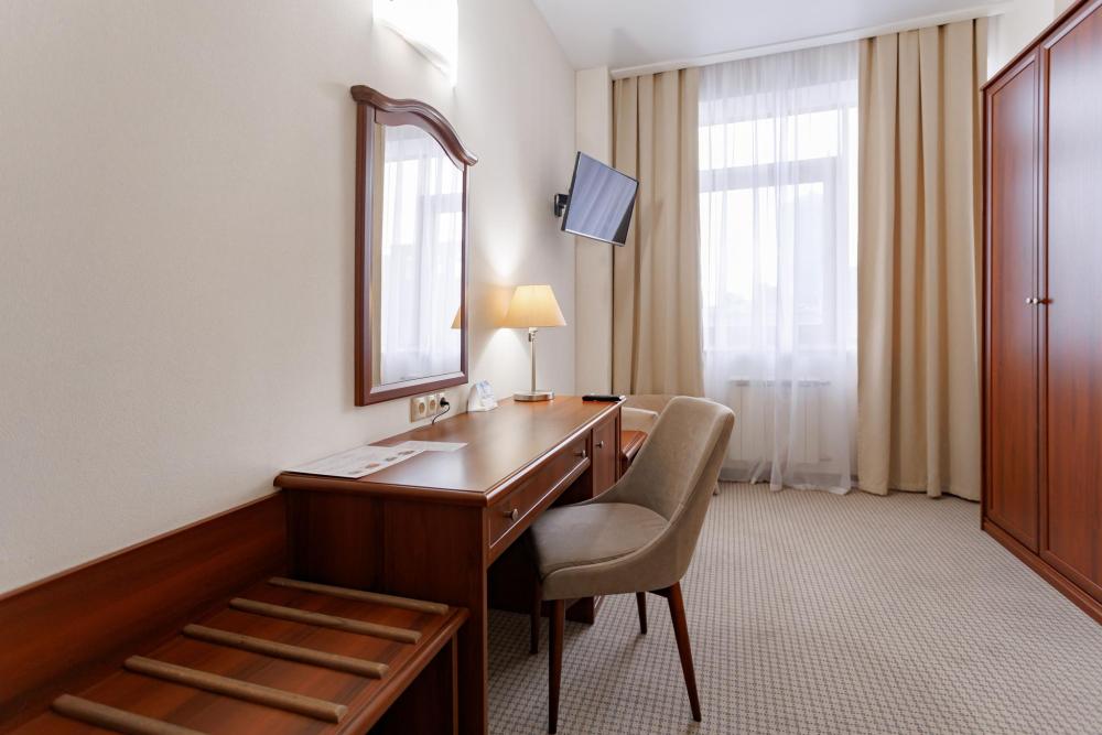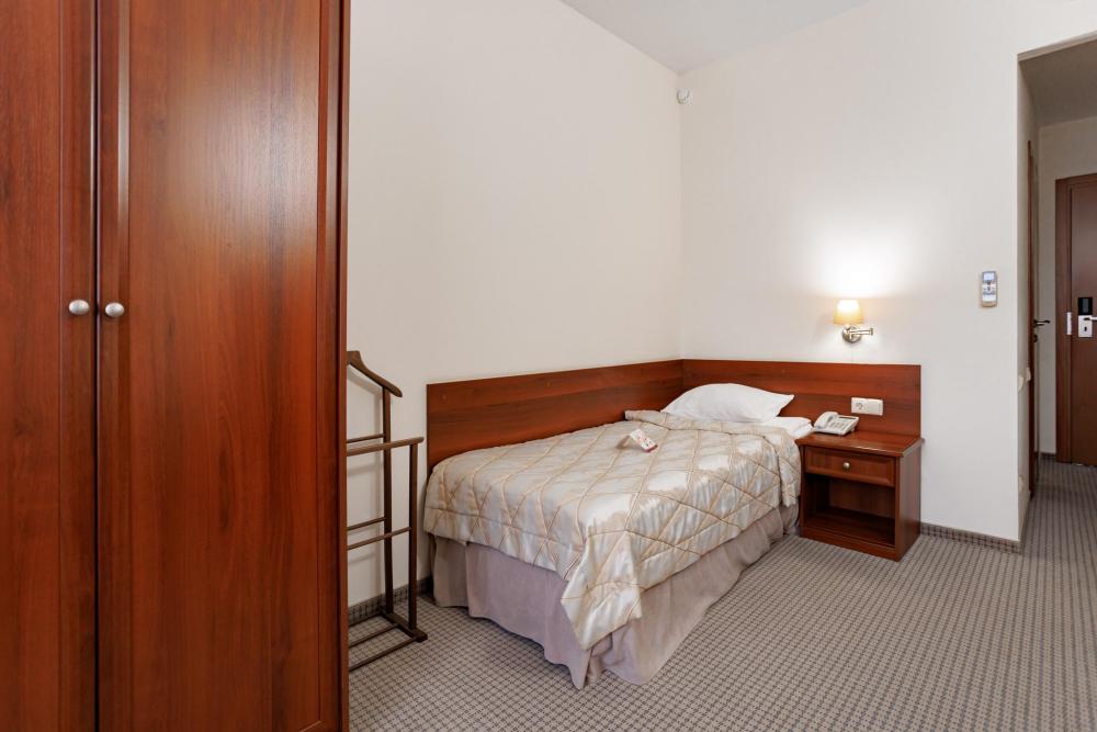 Комфортабельный, уютный одноместный номер общей площадью 17 кв. метров. Оптимальный вариант для деловой поездки. Номер оснащен ванной комнатой, шкафом для одежды, рабочим местом, ЖК телевизором, душевой кабиной, мини баром, кондиционером. Размер кровати 90*200 см. В стоимость номера входит завтрак (шведский стол), парковка, бесплатное пользование Wi-Fi, пользование тренажерным залом, сауной, предоставление услуг городской, междугородней и международной телефонной связи, чайные принадлежности и косметический набор.