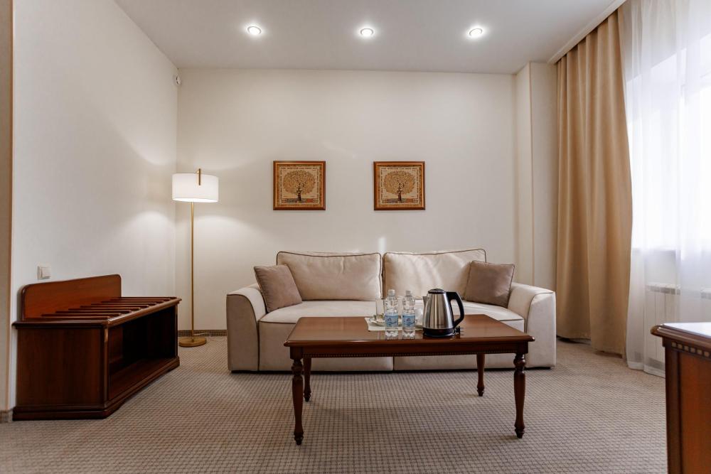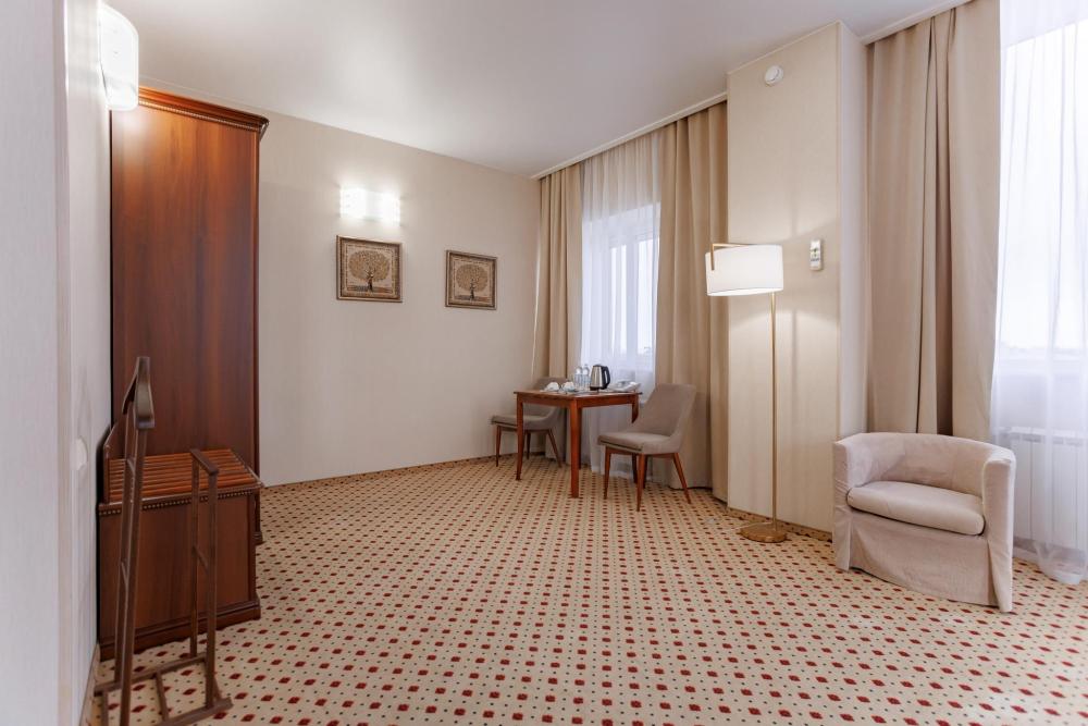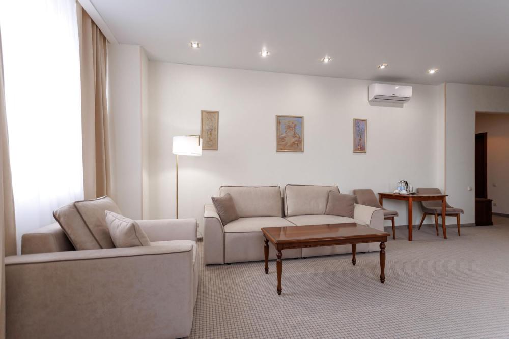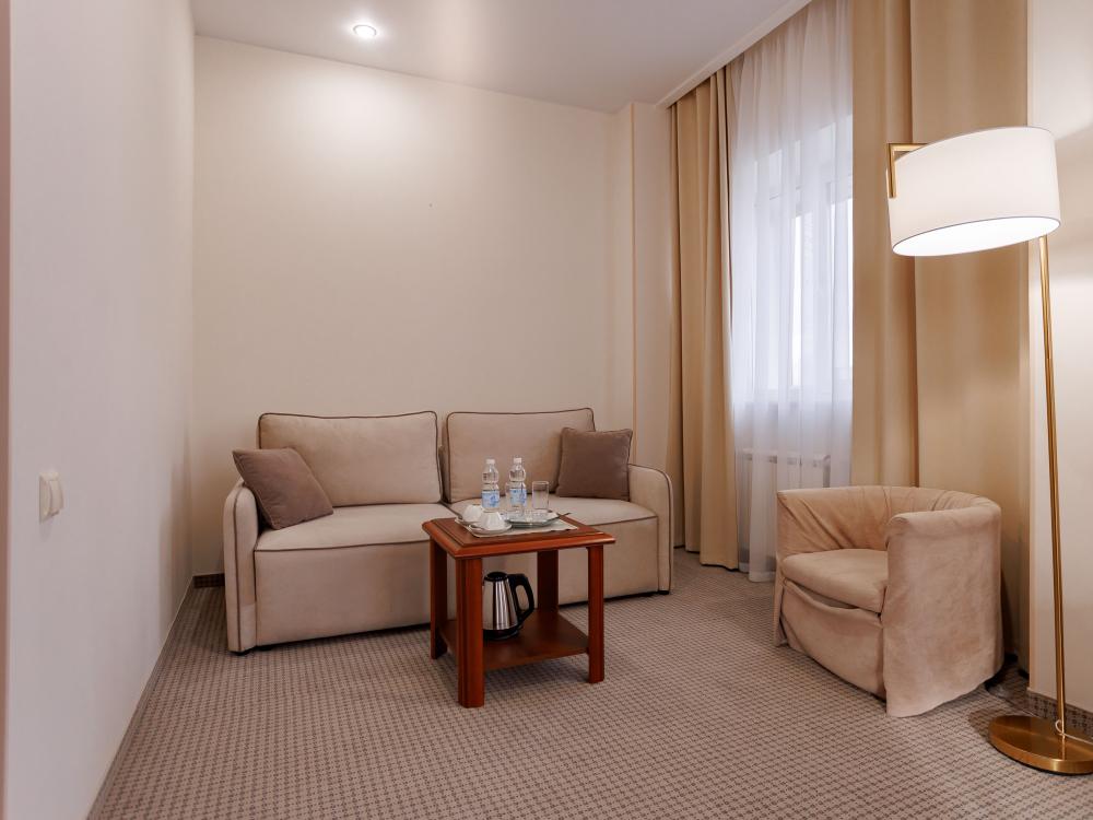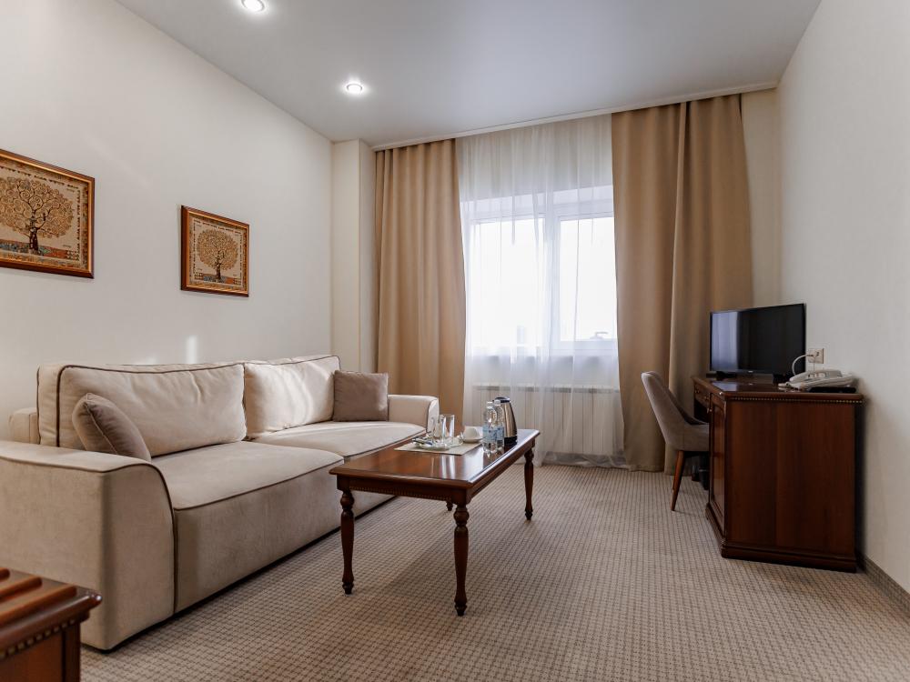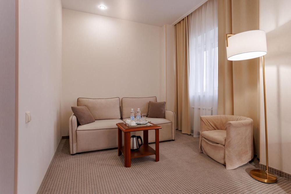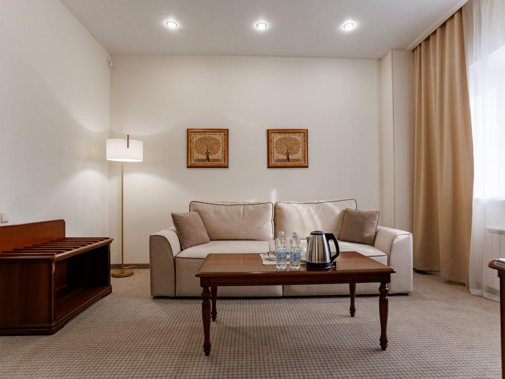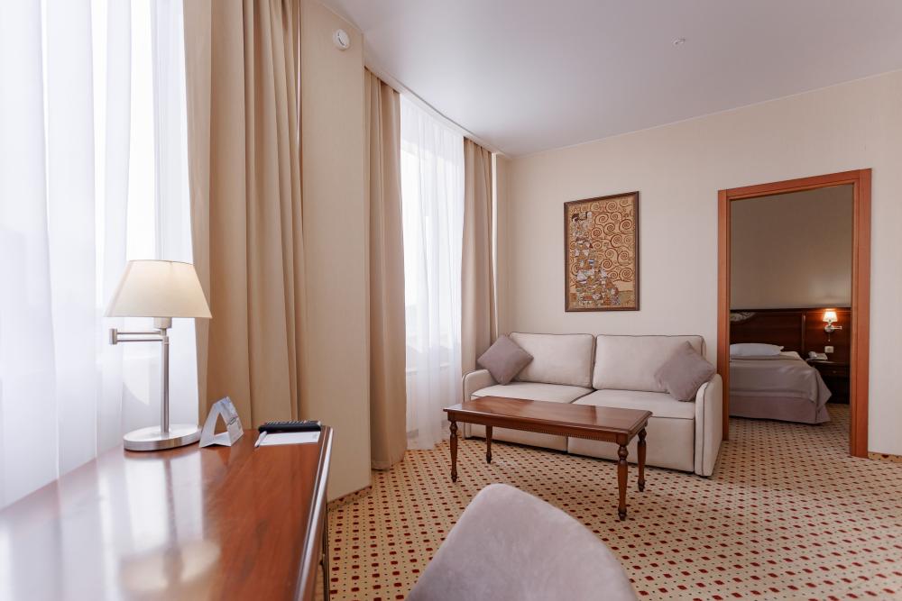 Двухкомнатный номер категории Люкс выбирают, прежде всего, из за презентабельной обстановки, изысканного дизайна, удобной планировки. В двухкомнатном люксе может комфортно разместится от 1 до 4 гостей благодаря двуспальной кровати (180*200 см.) в спальне и раздвижному дивану в гостиной. Также диван удобно использовать для отдыха и деловых переговоров. Удобный письменный стол и обеденная зона с чайным набором дают возможность разместиться с комфортом, а также пригласить друзей или партнеров. Ванная комната оборудована душевой кабиной или джакузи.