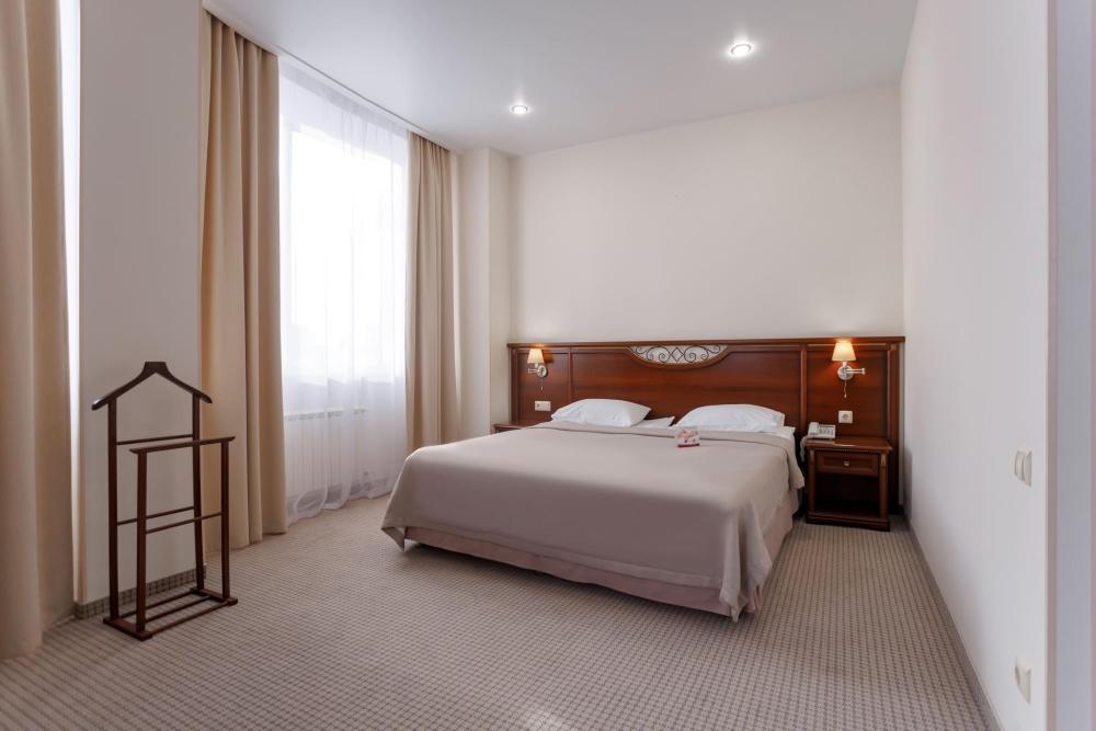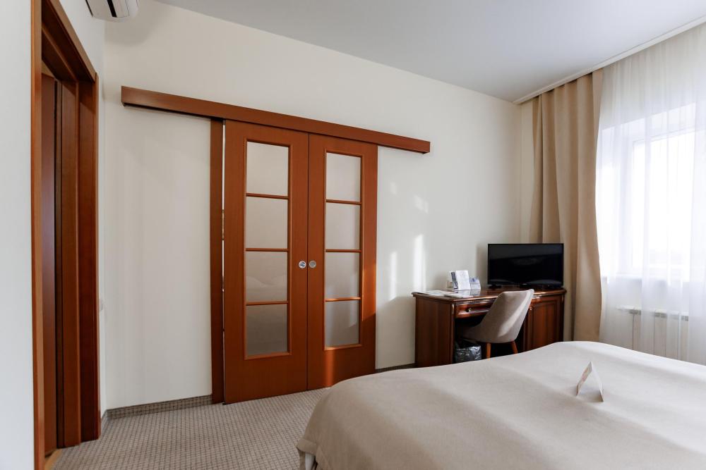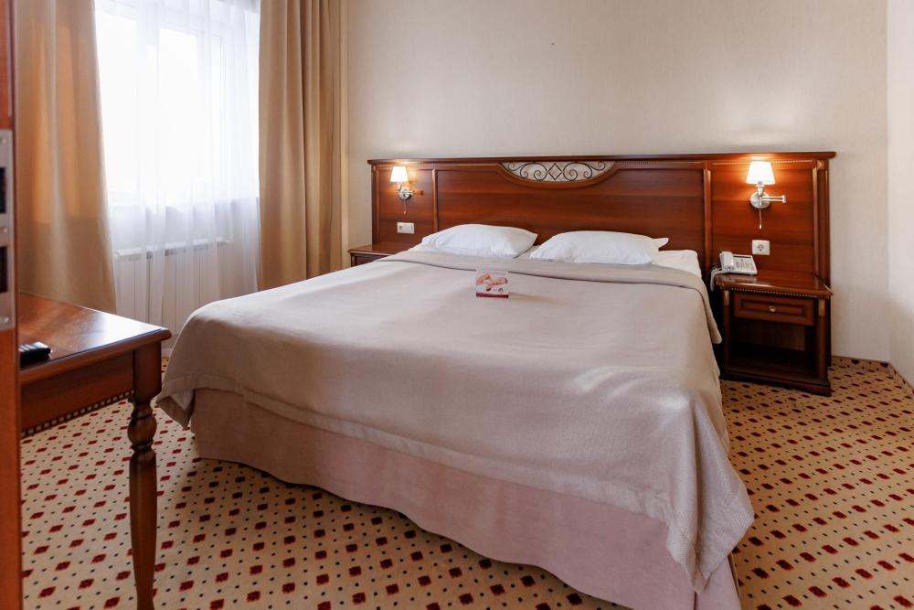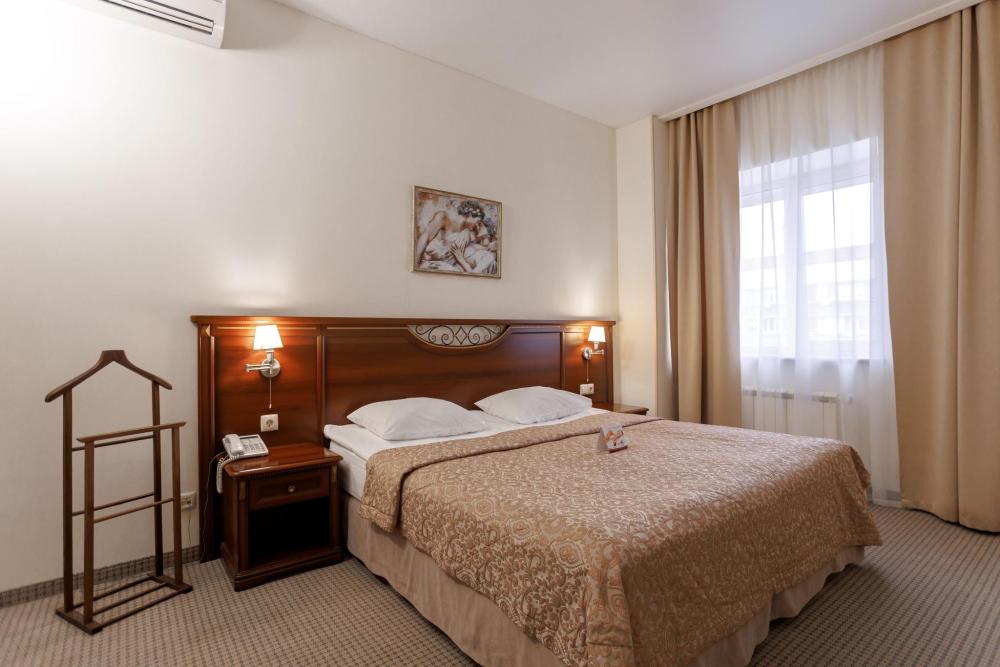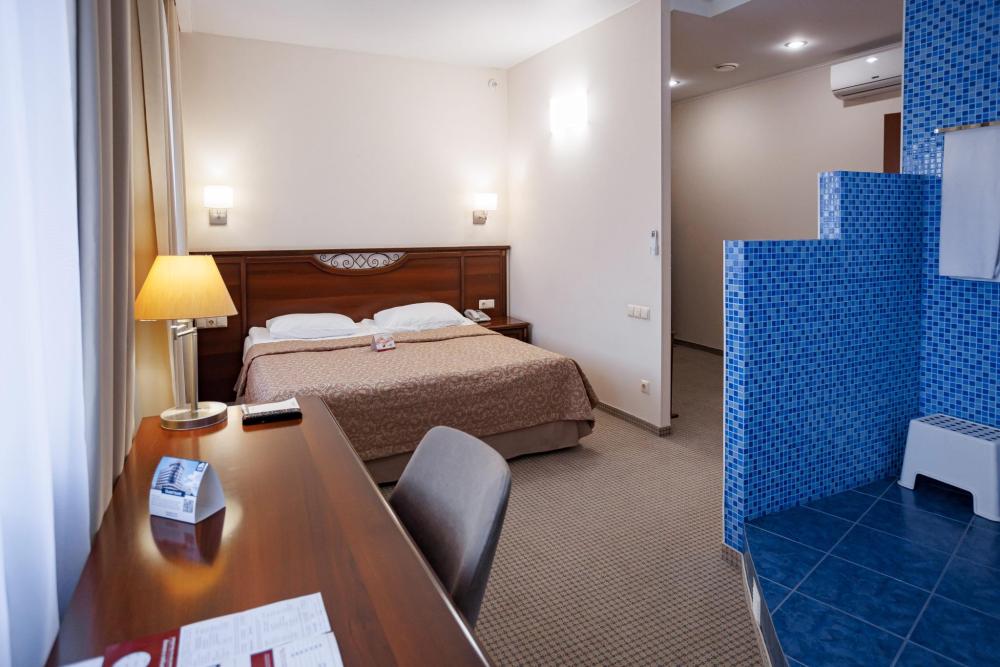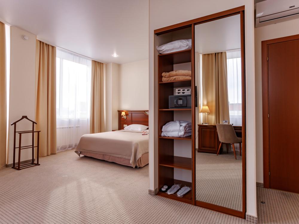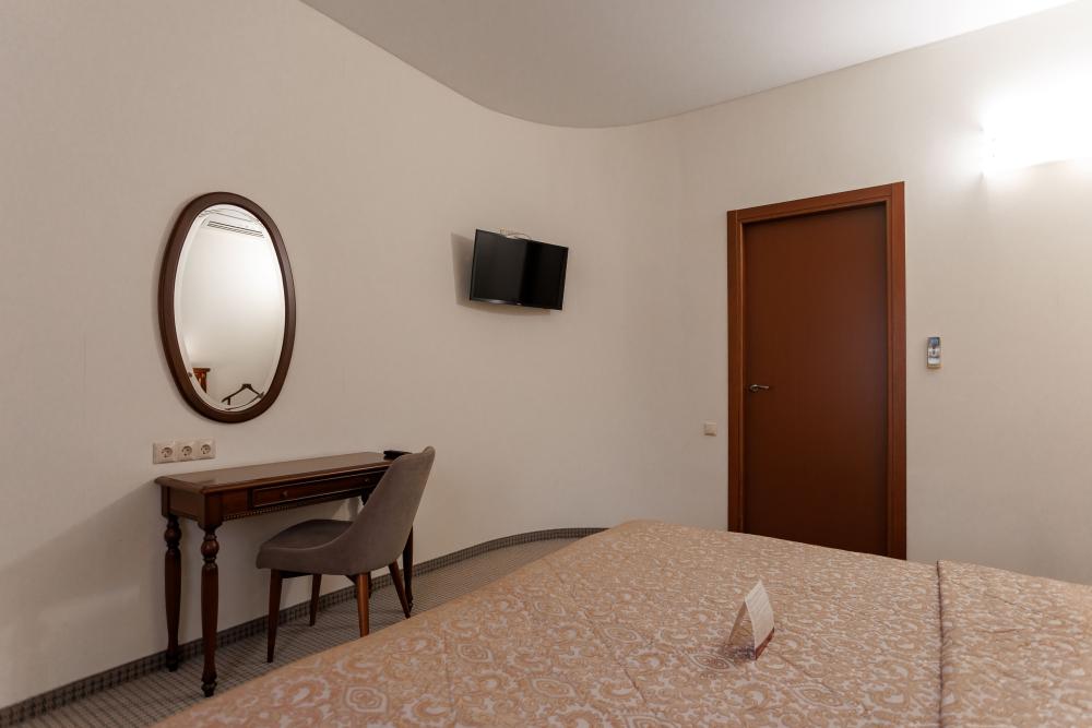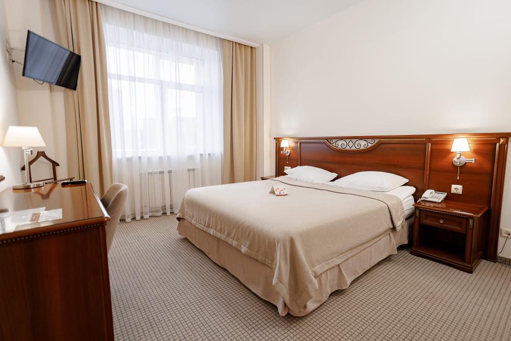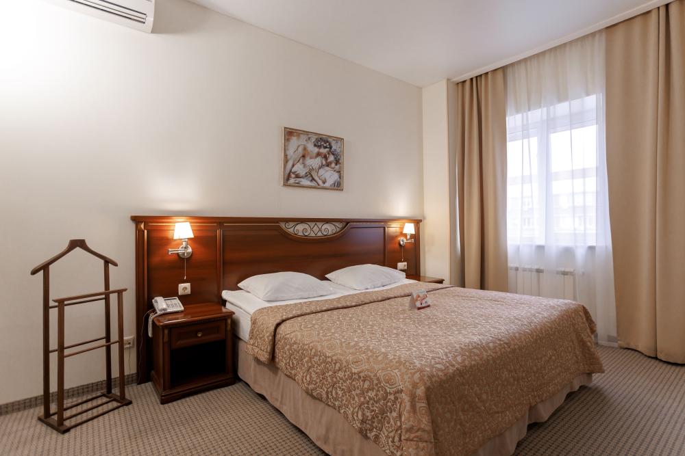 Просторный двухместный номер площадью 24 кв.м позволит вам почувствовать себя, как дома. Стильный интерьер с преобладанием бежевого и кремового оттенков заряжает положительной энергией, поддерживая атмосферу безмятежного отдыха. Оптимальный вариант проживания одного или двоих гостей. Это один из самых востребованных номеров нашего отеля. Номер оснащен ванной комнатой, шкафом для одежды, рабочим местом, 32” ЖК телевизором, душевой кабиной, мини баром, кондиционером. Размер кровати 180*200 см. В стоимость номера входит завтрак (шведский стол), парковка, бесплатное пользование Wi-Fi, пользование тренажерным залом, сауной, предоставление услуг городской, междугородней и международной телефонной связи. В номере для комфортного отдыха гостей предусмотрено наличие чайных принадлежностей и косметического набора.