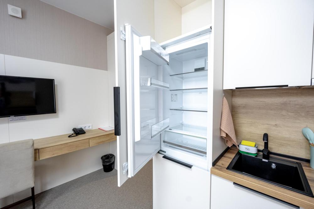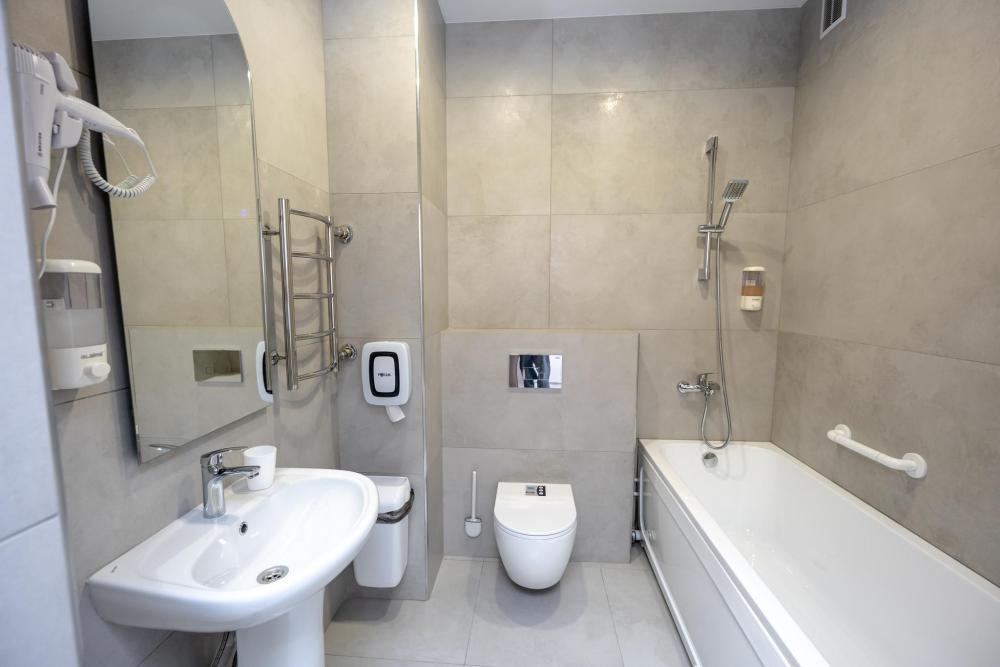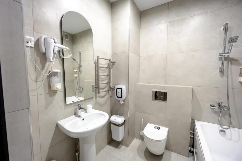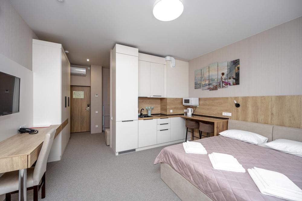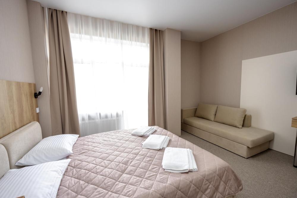 Номер стандарт общей площадью 25 кв.м. для размещения до 3-х гостей (с учетом дополнительного места). Для комфортного проживания гостей номер оснащен всем необходимым: двухспальная кровать, диван, телевизор, холодильник, чайник, микроволновая печь, столовые приборы и посуда, ванная комната, фен, набор полотенец.