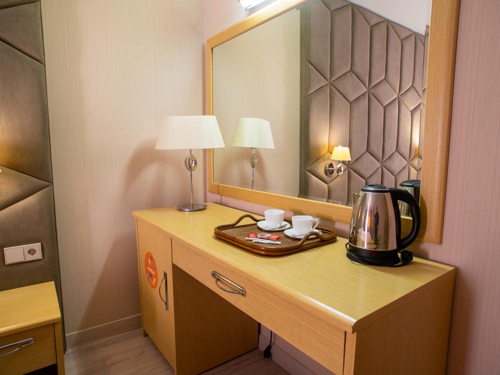 Номер категории «Standart twin» номер с двумя односпальными кроватями. В нём есть все необходимое для полноценного комфортного отдыха. К вашим услугам: -кондиционер -Wi-Fi -ванная комната (ванна/душ, туалет); -круглосуточная подача горячей и холодной воды; -отопление в холодное время года; - ЖК телевизор (более 300 каналов); -холодильник. чайник; -постельное белье из натуральных тканей; -письменный стол, два стула; -гостевой набор мини парфюмерии;