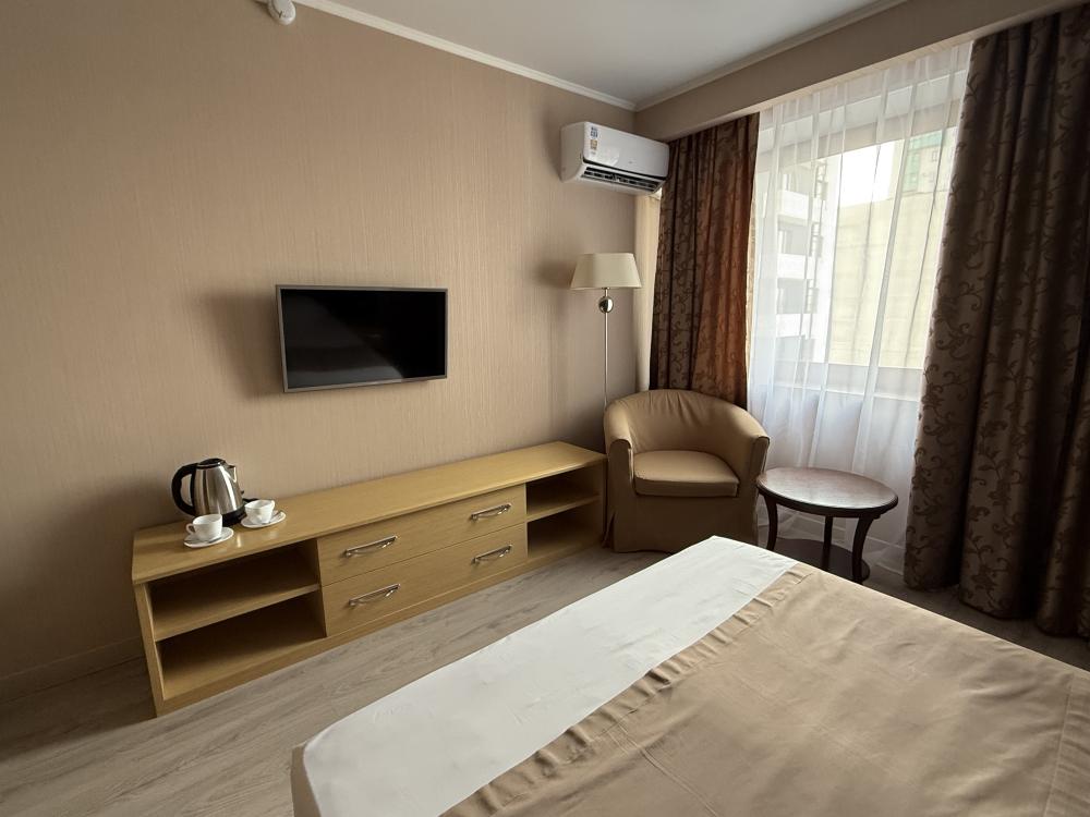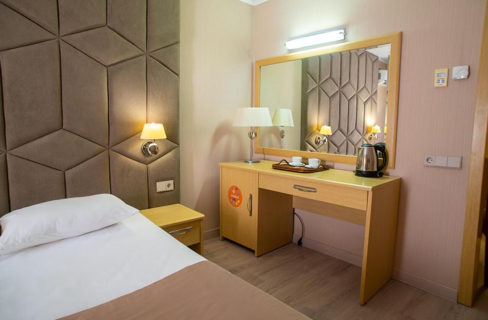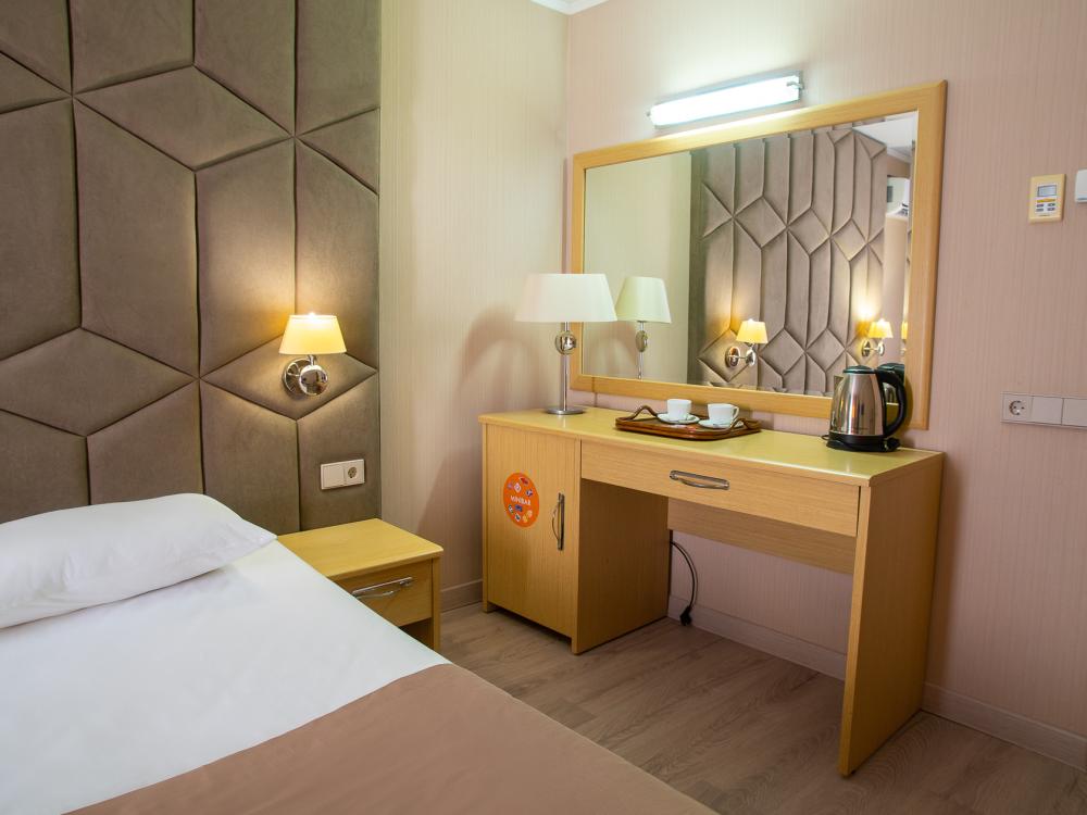 Номер категории «Standart» номер с односпальной кроватью. В номере есть все необходимое для полноценного комфортного отдыха. К вашим услугам: -кондиционер -Wi-Fi -ванная комната (душ, туалет); - ЖК телевизор (более 300 каналов); -холодильник. чайник; -постельное белье из натуральных тканей;
