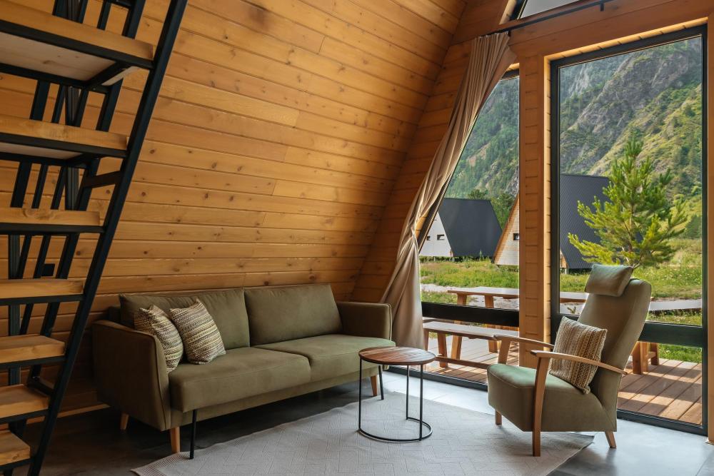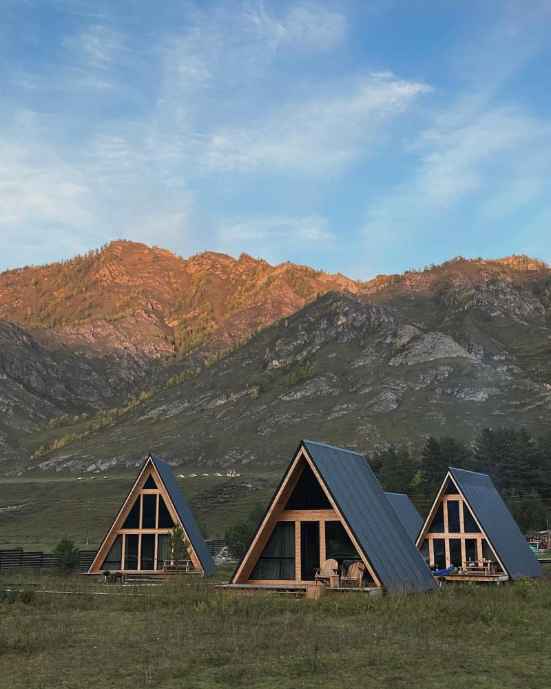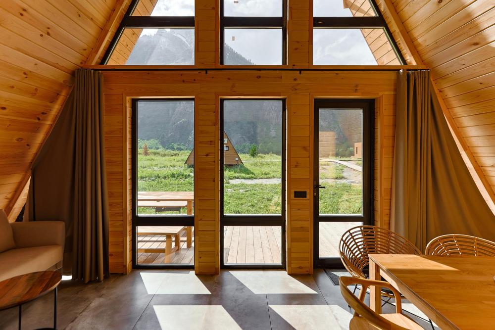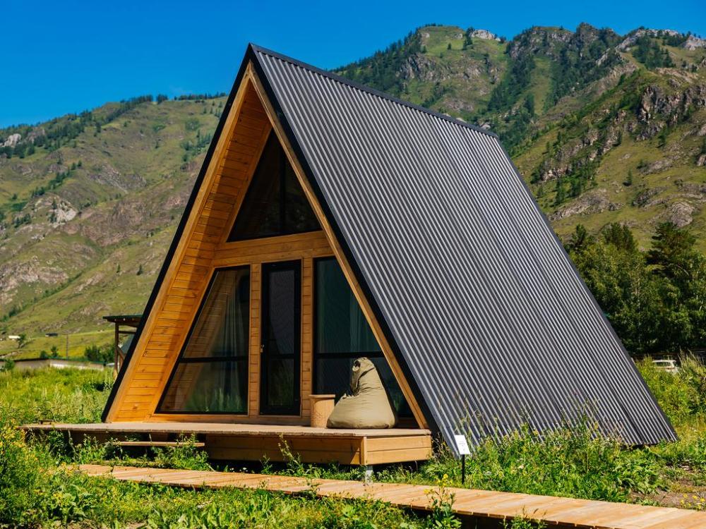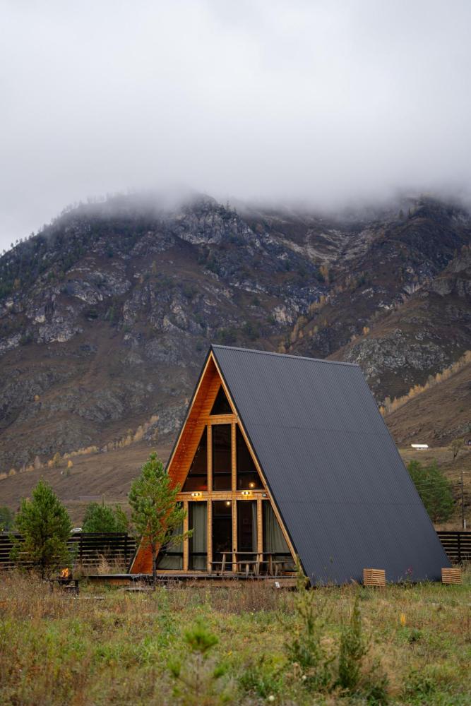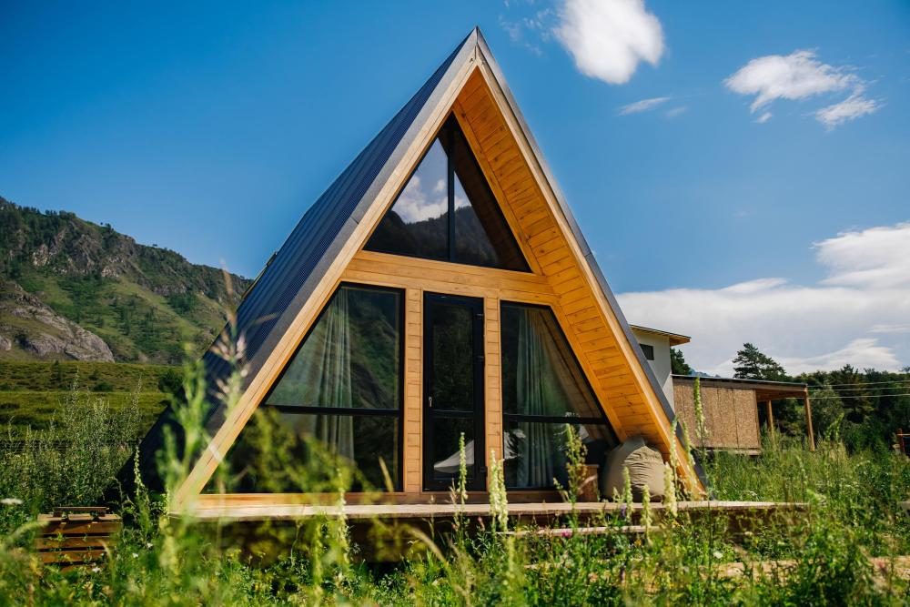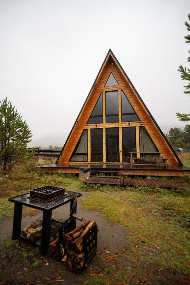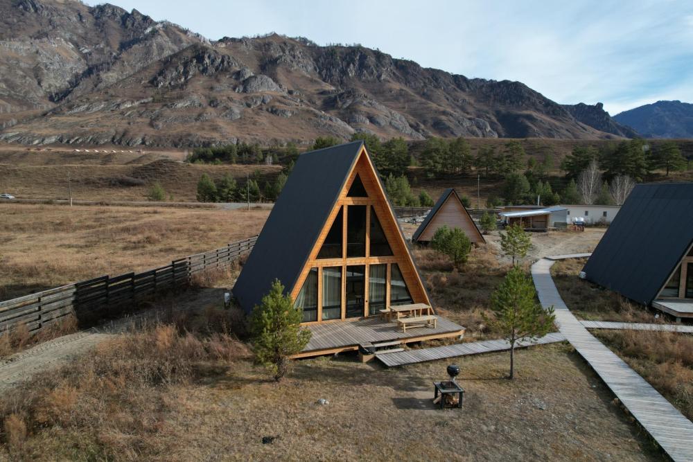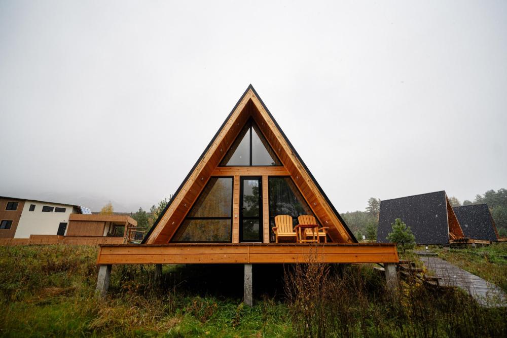 Треугольный тёплый дом, в котором комфортно отдыхать вдвоём или с детьми (есть диван). Находится в отдалении от реки, панорамный вид на горы. Внутри — удобная кровать под крышей, стол, посуда, холодильник с мини-баром, гостиная, сан.узел с душевой кабиной. Перед домом — уютная терраса и зона барбекю.