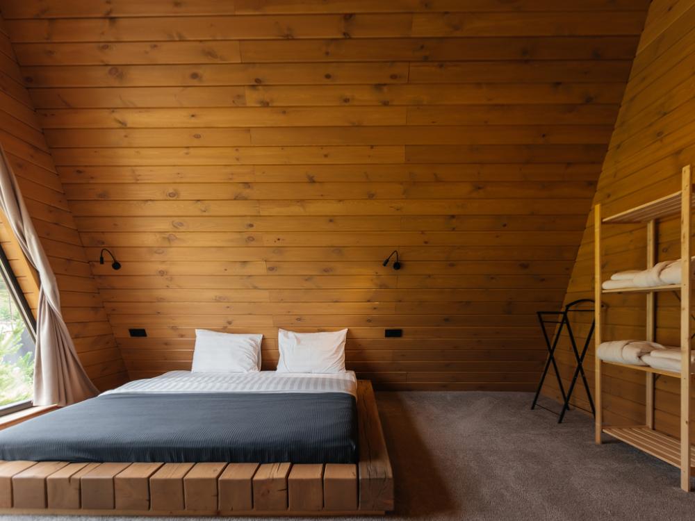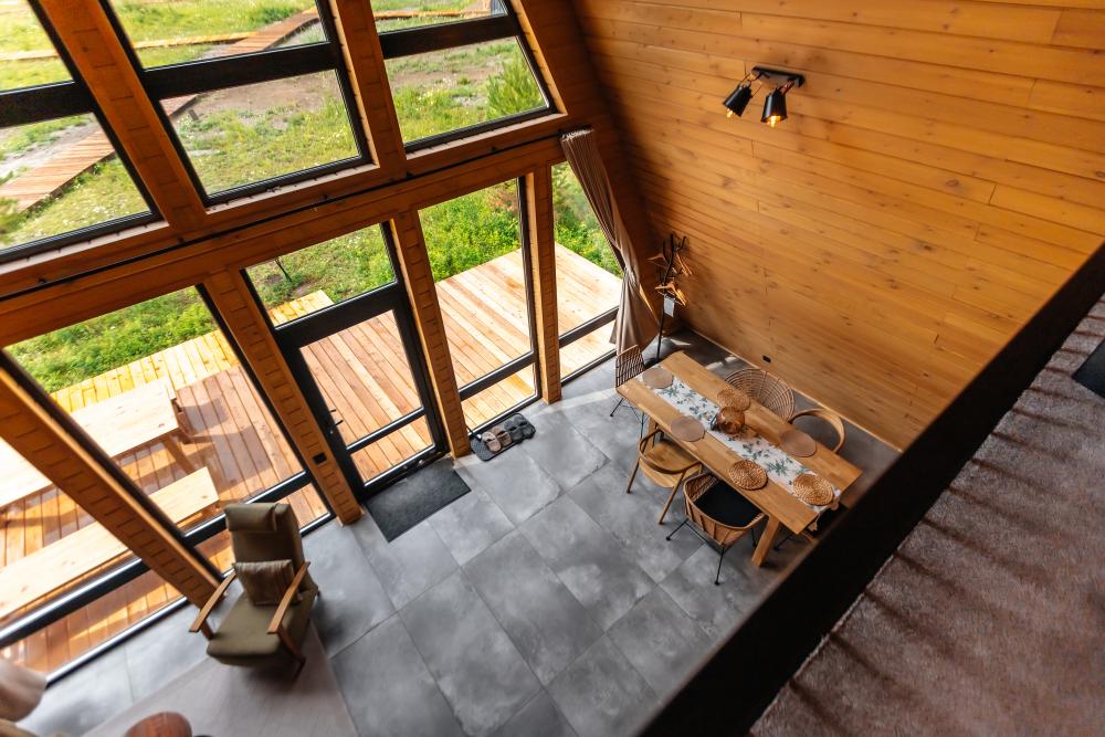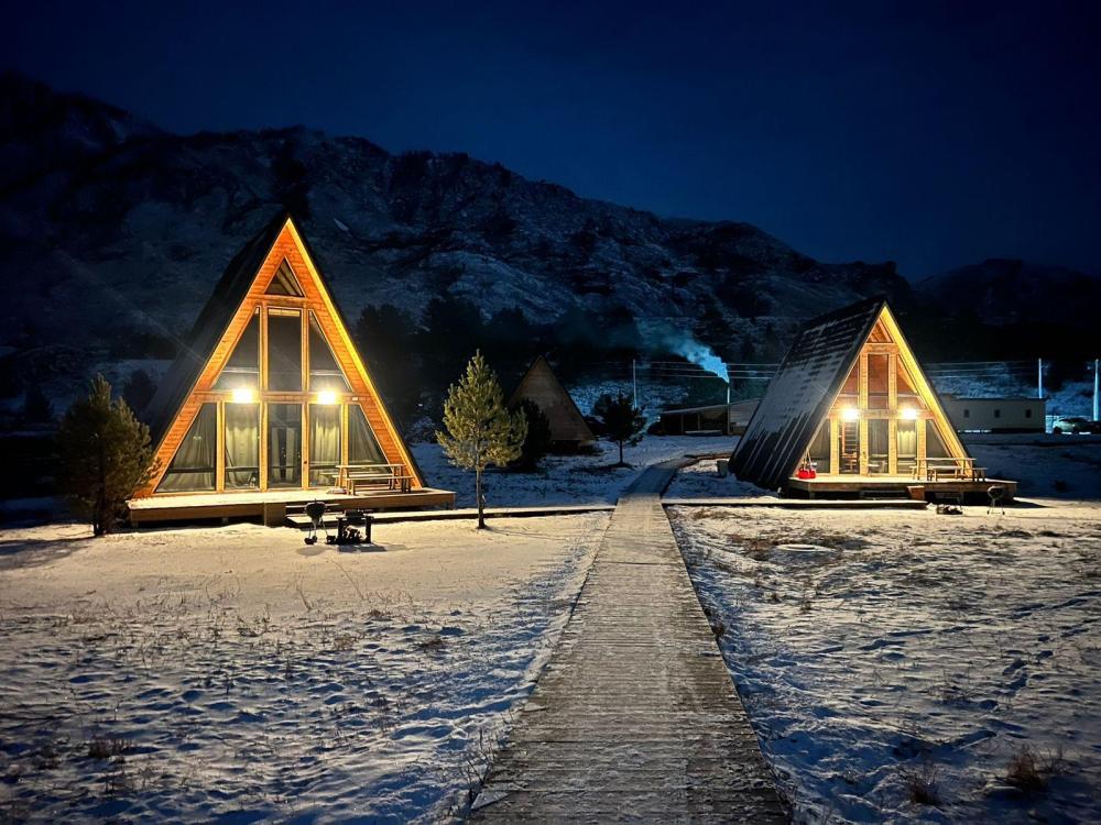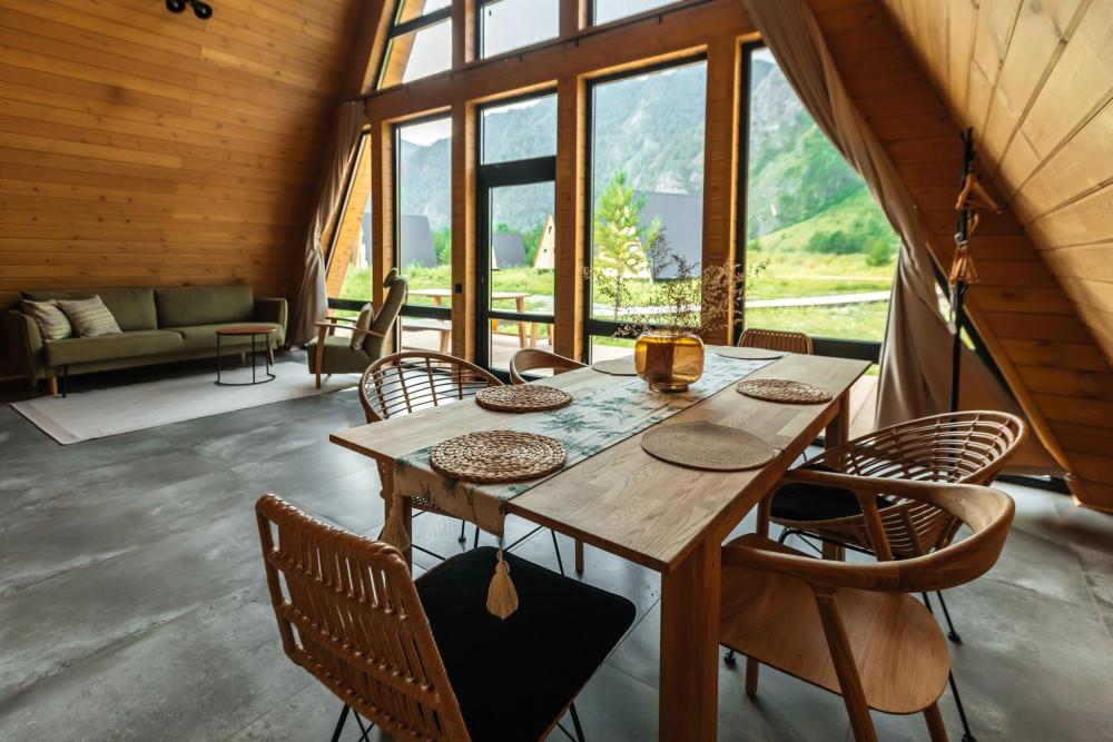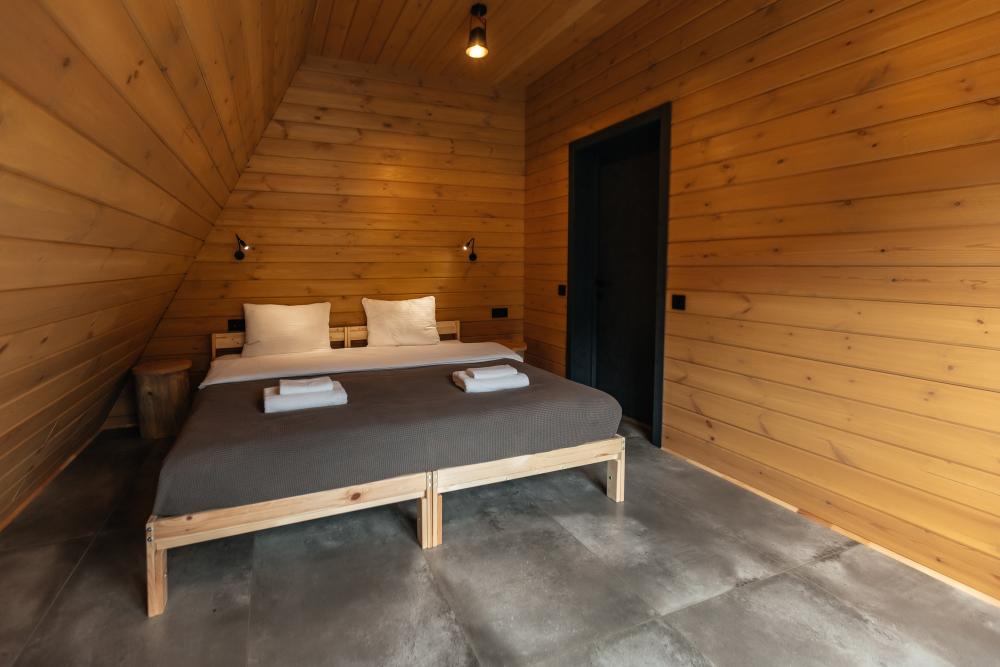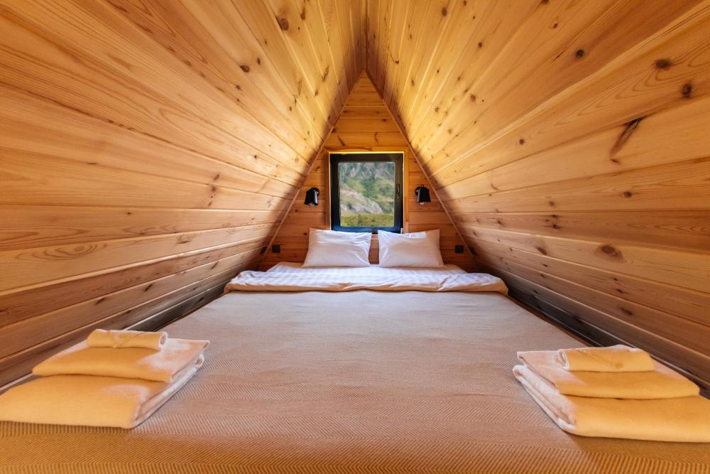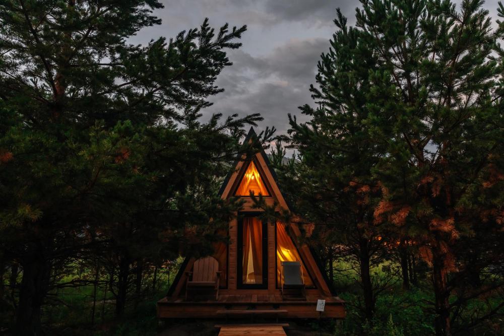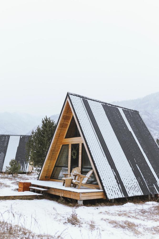 Треугольный тёплый дом, в котором комфортно отдыхать вдвоём или с детьми (есть диван). Находится в отдалении от реки, панорамный вид на горы. Внутри — удобная кровать под крышей, стол, посуда, холодильник с мини-баром, гостиная, сан.узел с душевой кабиной. Перед домом — уютная терраса и зона барбекю.