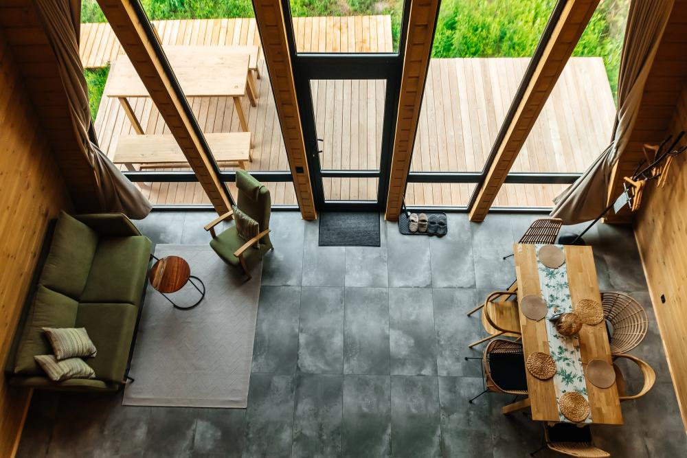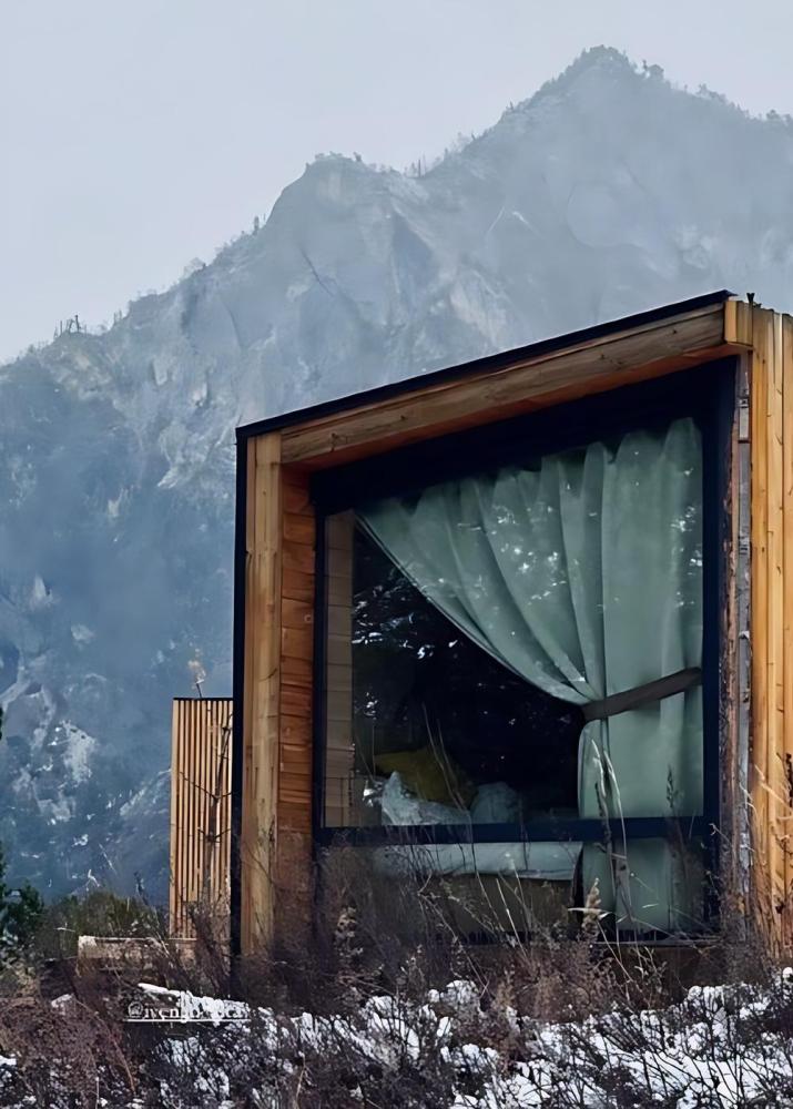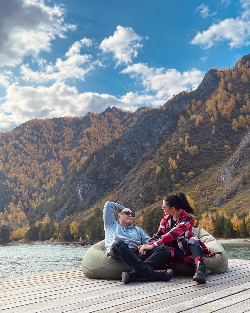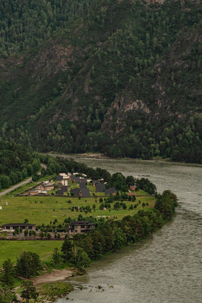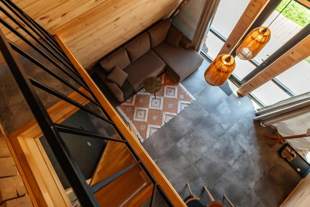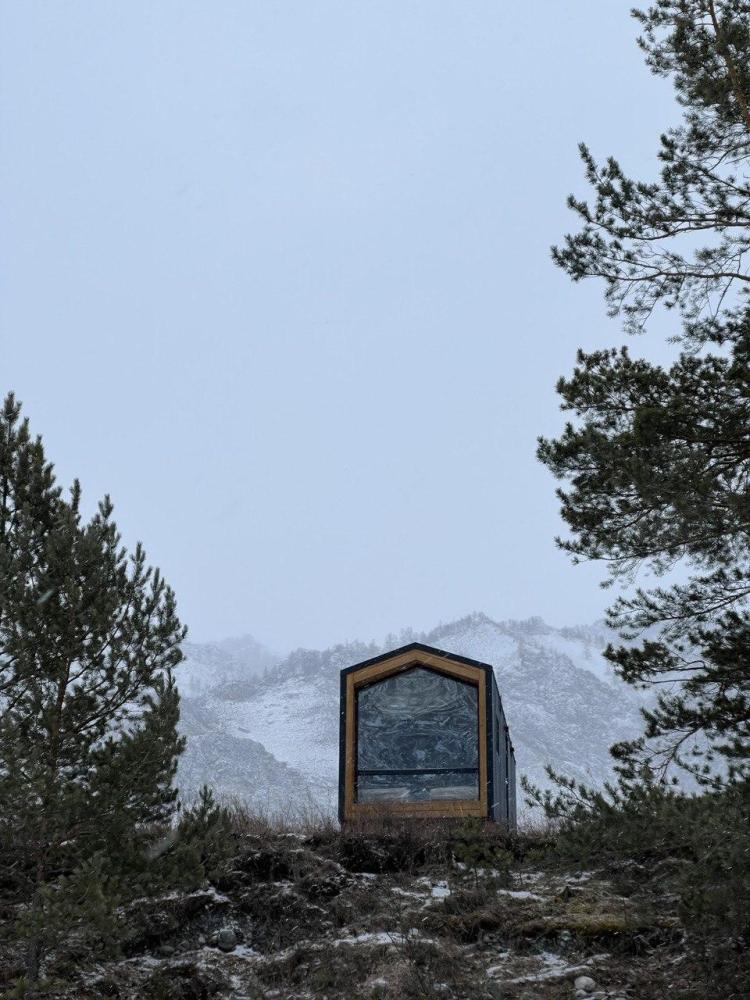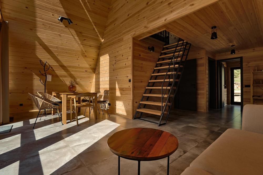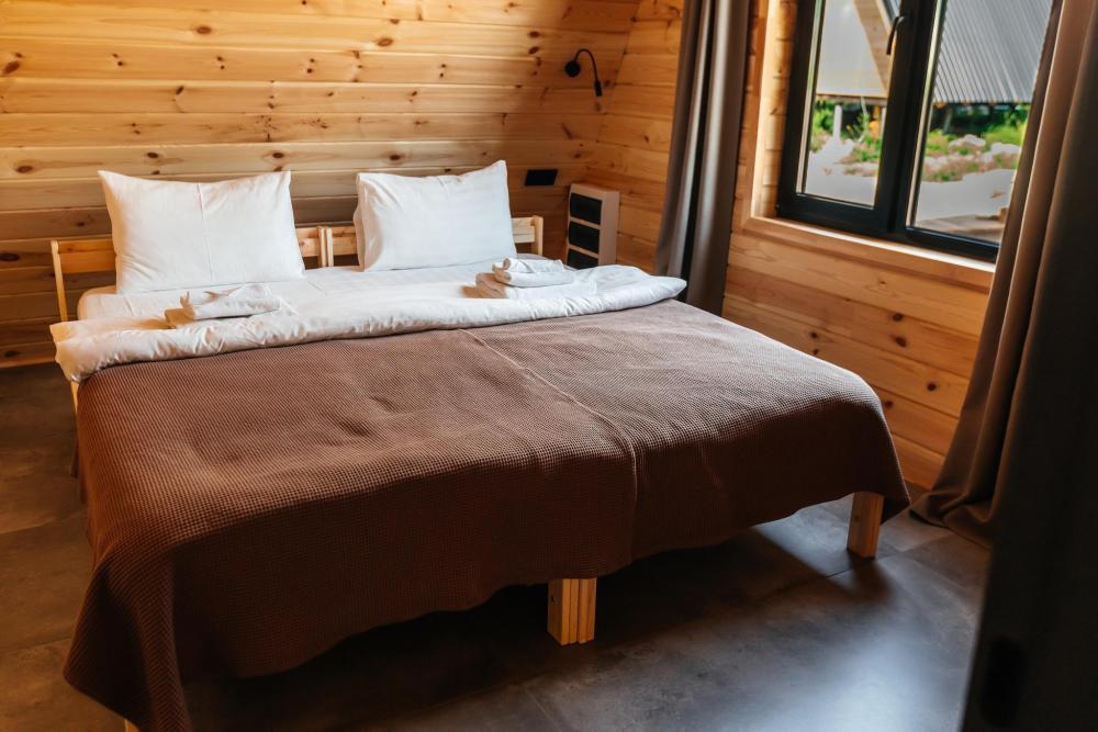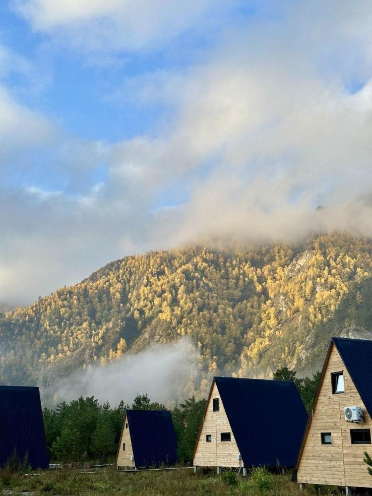 Треугольный тёплый дом, в котором комфортно отдыхать вдвоём или с детьми (есть диван). Находится в отдалении от реки, панорамный вид на горы. Внутри — удобная кровать под крышей, стол, посуда, холодильник с мини-баром, гостиная, сан.узел с душевой кабиной. Перед домом — уютная терраса и зона барбекю.