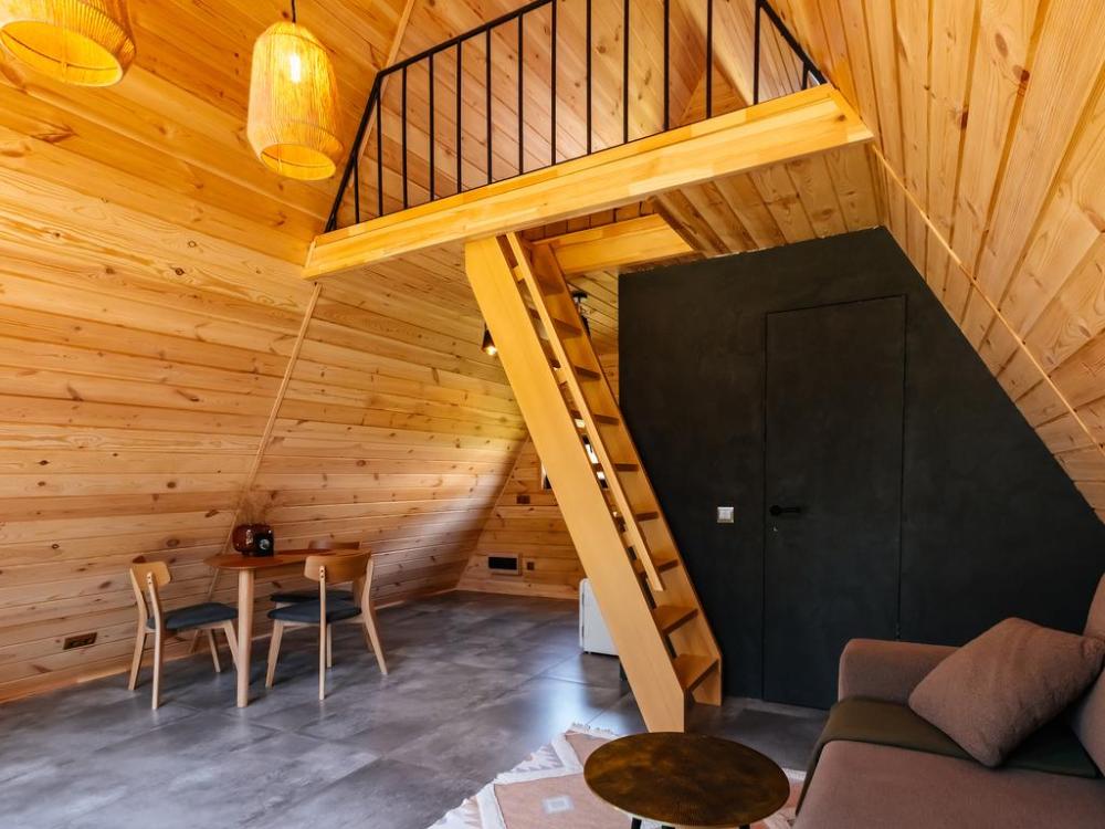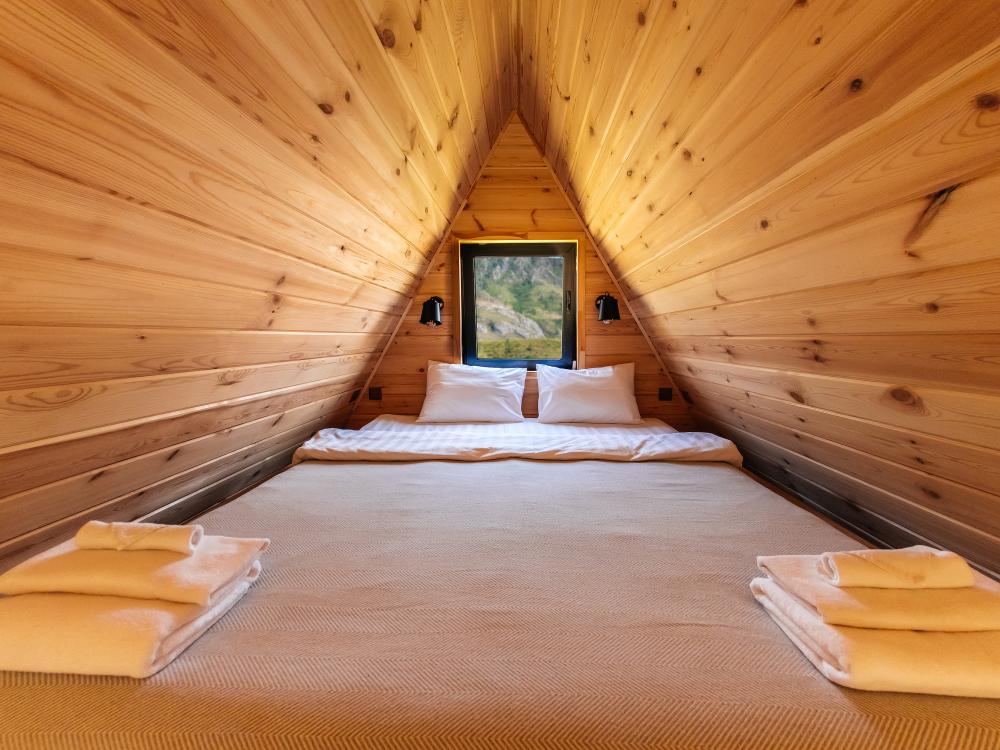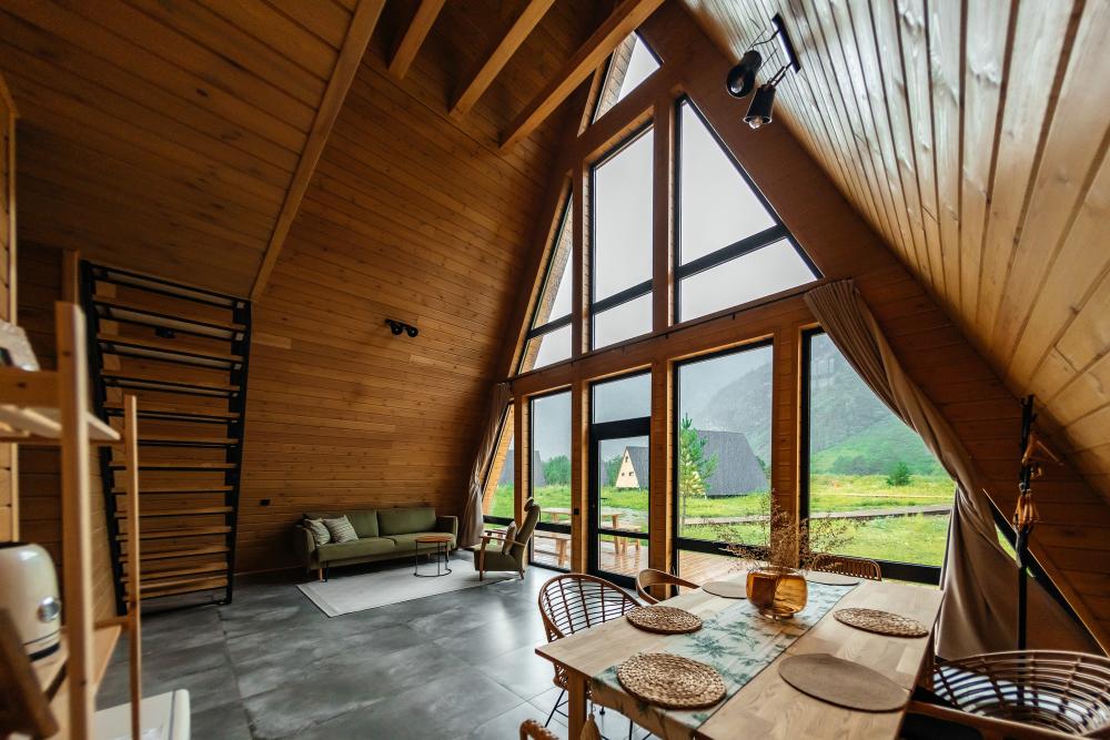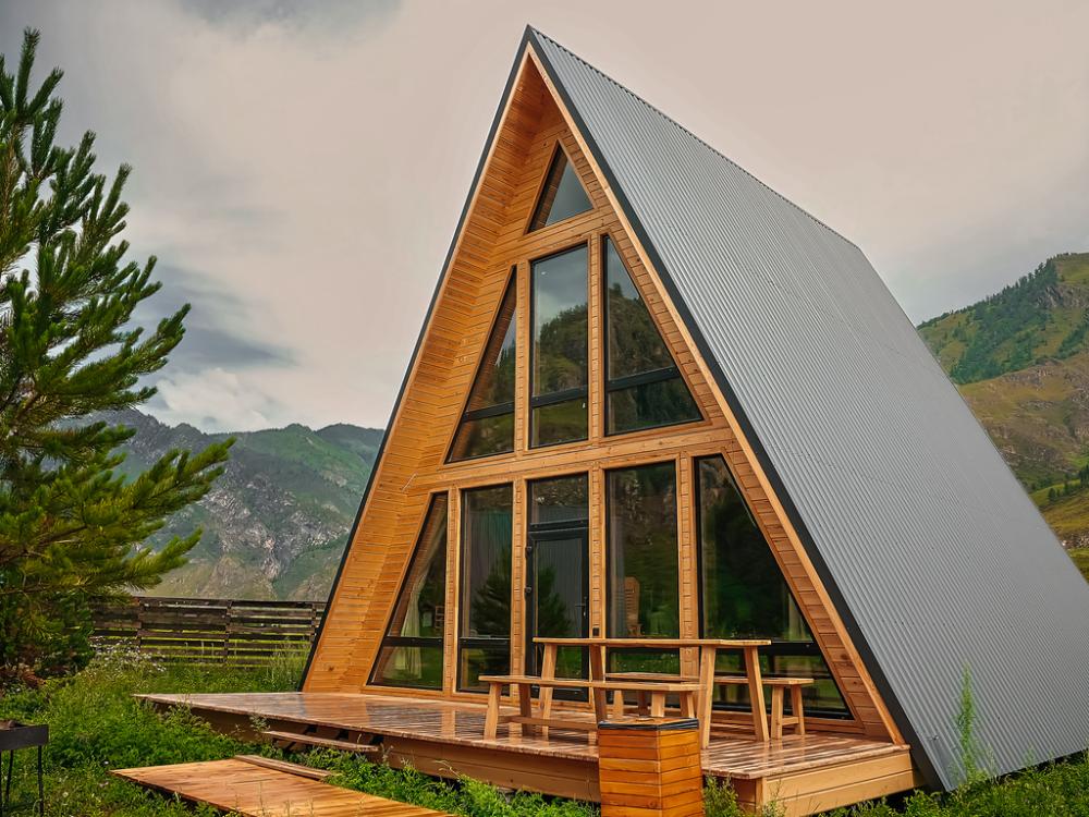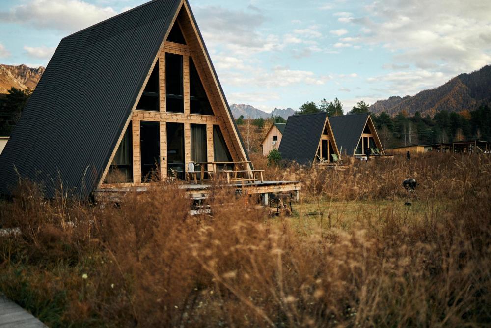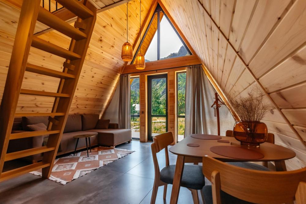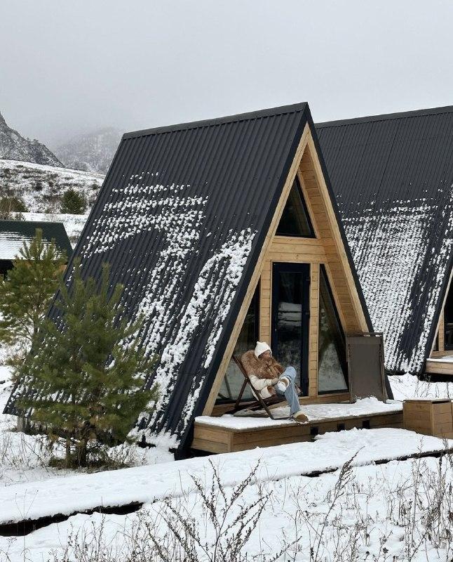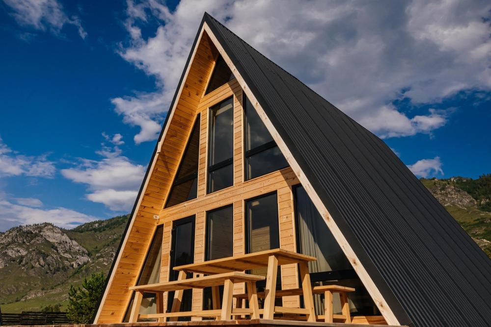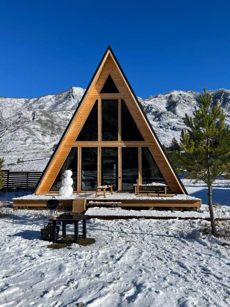 Треугольный тёплый дом, в котором комфортно отдыхать вдвоём или с детьми (есть диван). Находится недалеко от реки, панорамный вид на горы. Внутри — удобная кровать под крышей, стол, посуда, холодильник с мини-баром, гостиная, сан.узел с душевой кабиной. Перед домом — уютная терраса и зона барбекю.