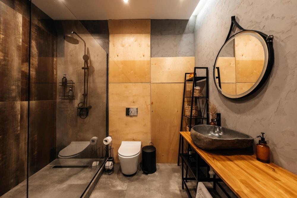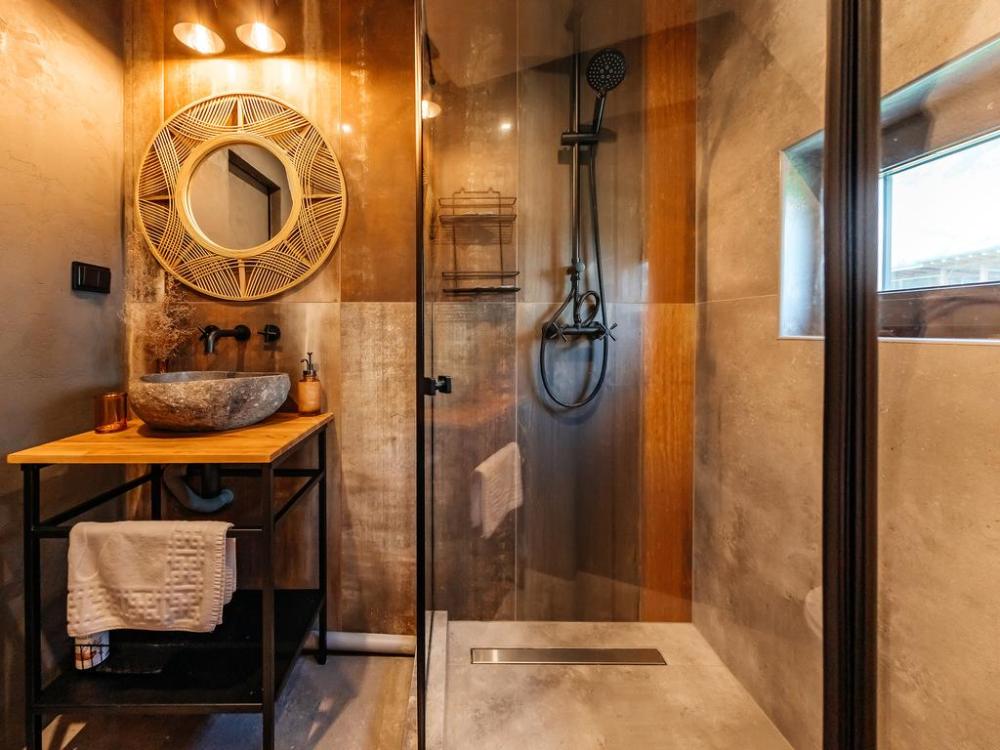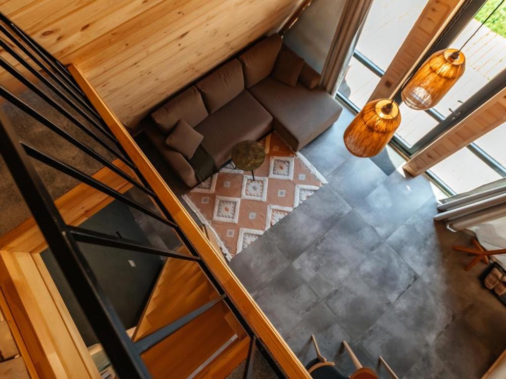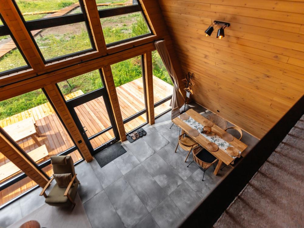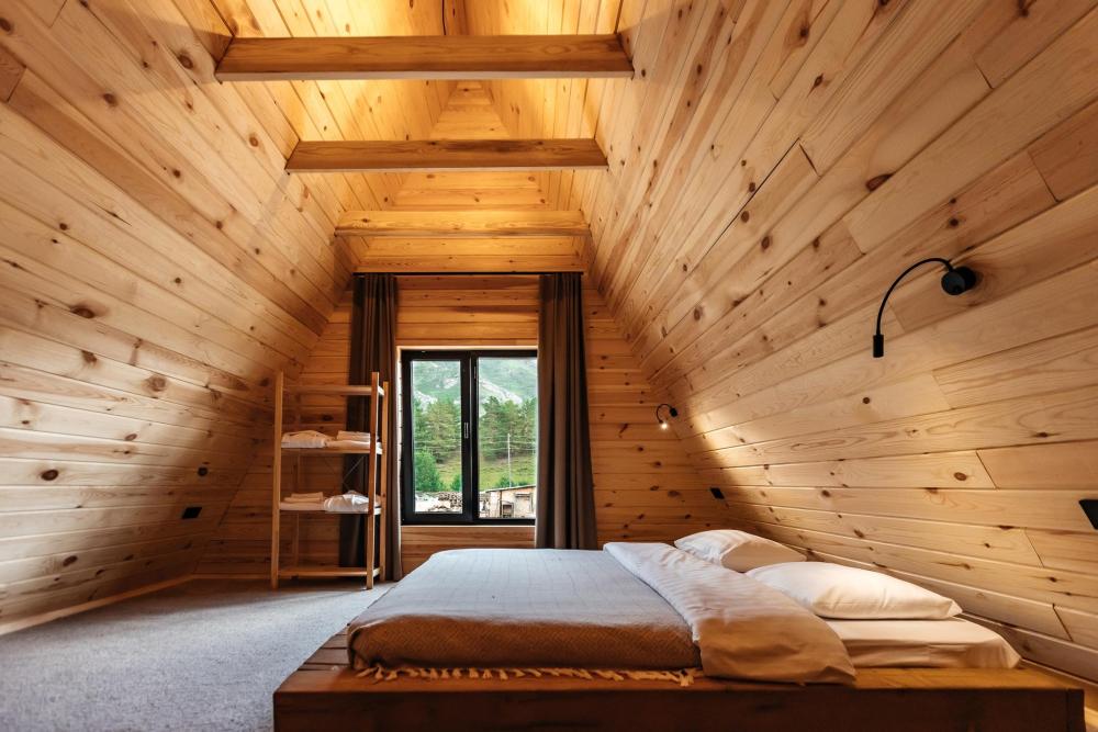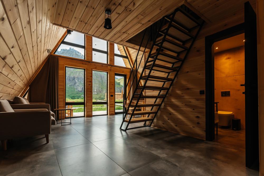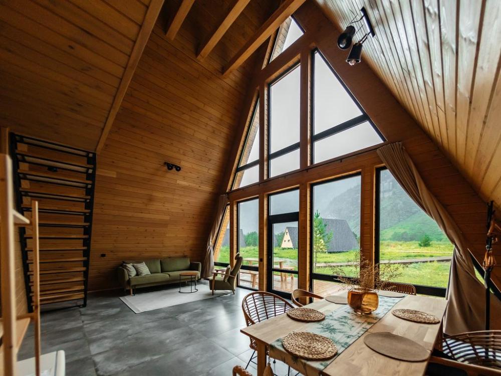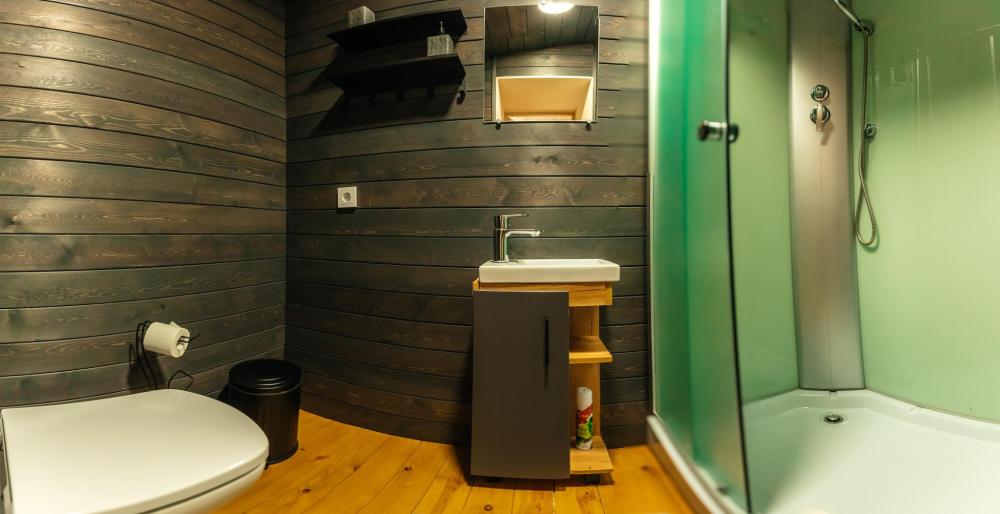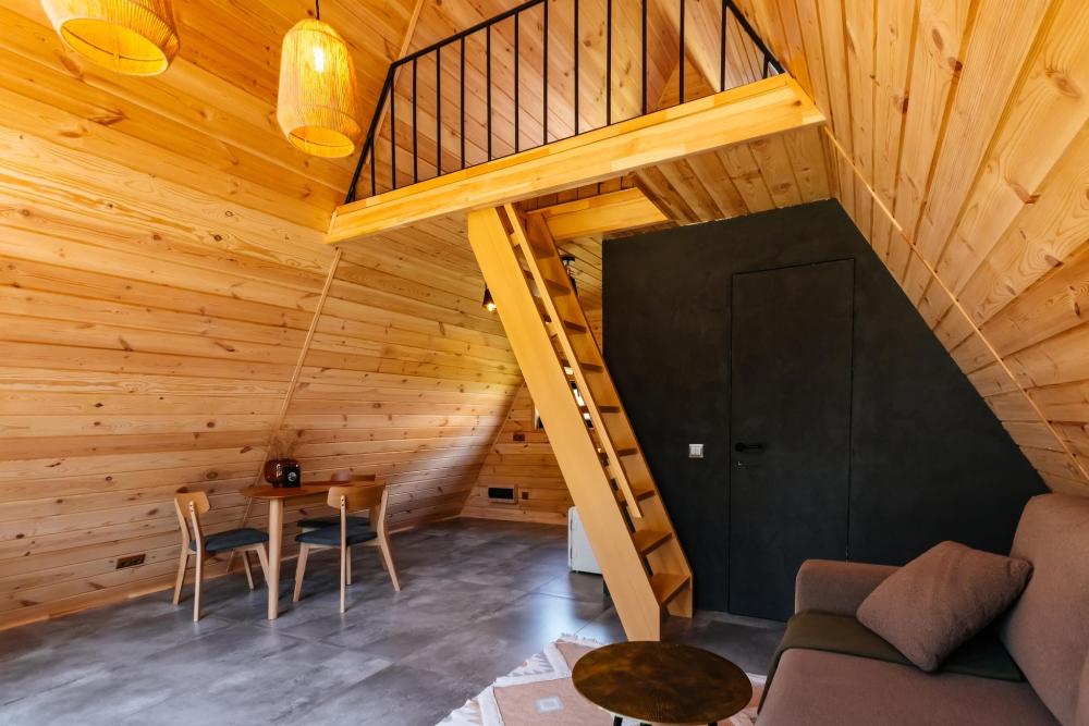 Треугольный тёплый дом, в котором комфортно отдыхать вдвоём или с детьми (есть диван). Находится недалеко от реки, панорамный вид на горы. Внутри — удобная кровать под крышей, стол, посуда, холодильник с мини-баром, гостиная, сан.узел с душевой кабиной. Перед домом — уютная терраса и зона барбекю.