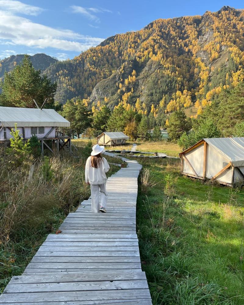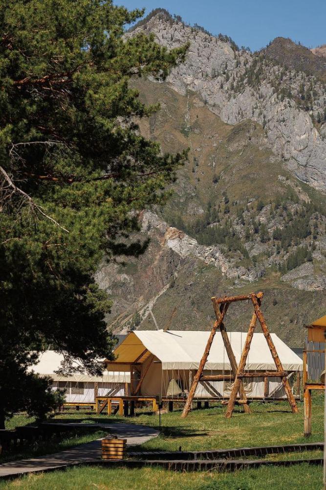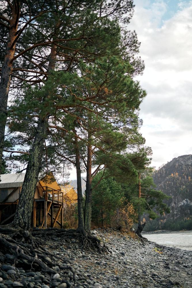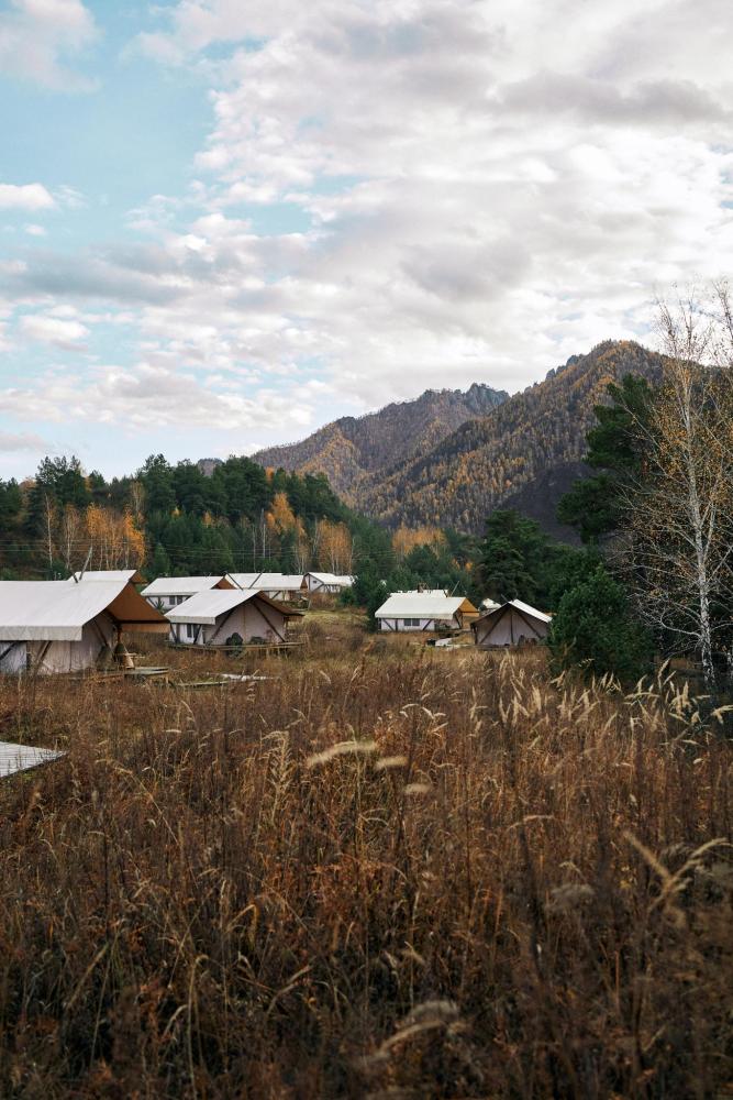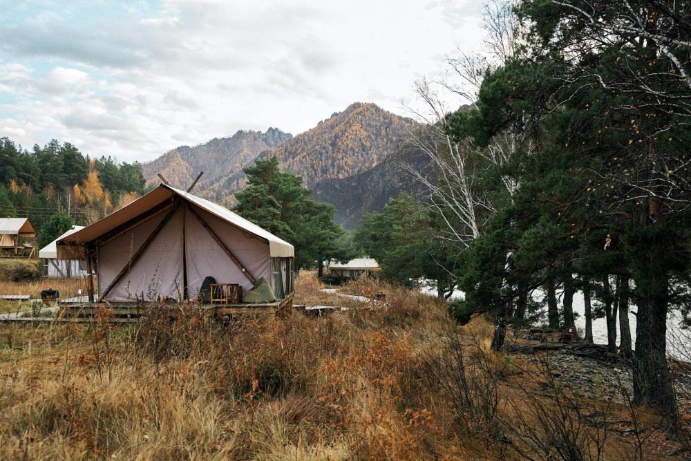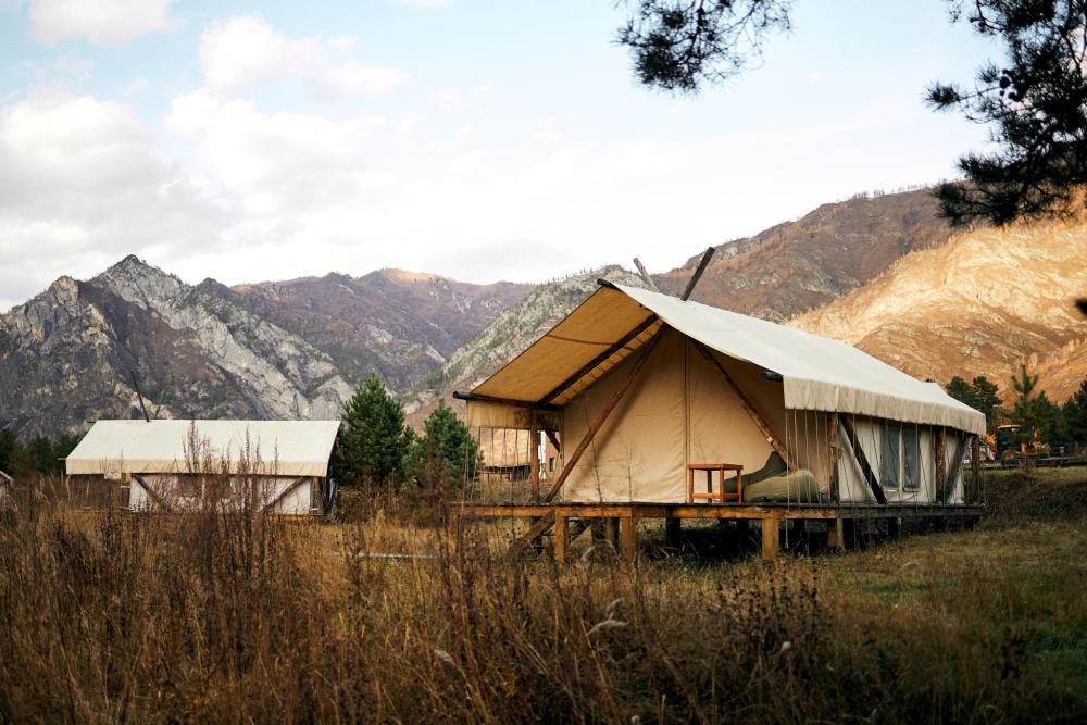В шатре: Двуспальная кровать, Ванная комната (душ, туалет, раковина, зеркало), Гардеробная. Вид на реку и горы.