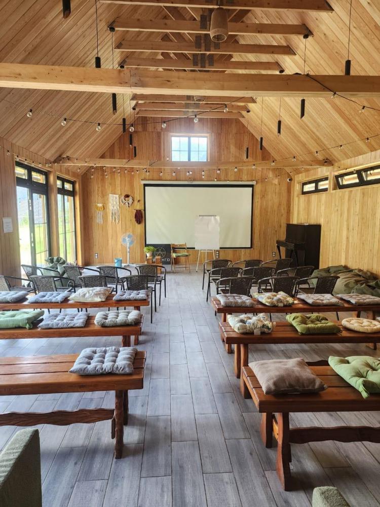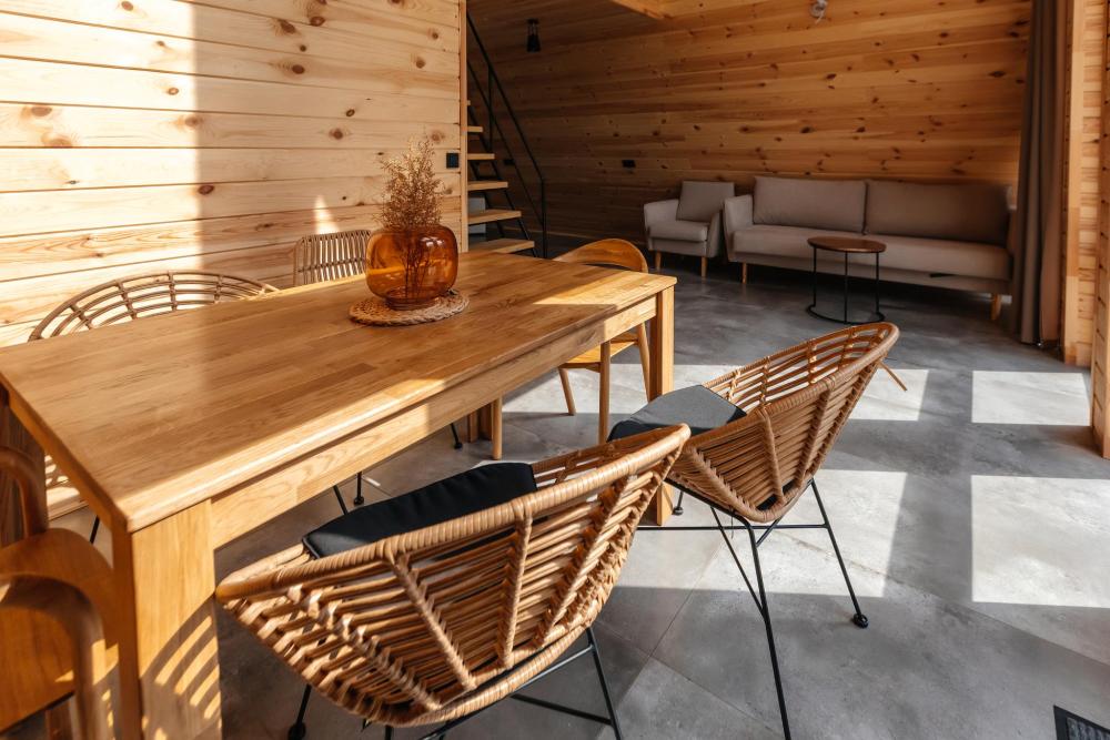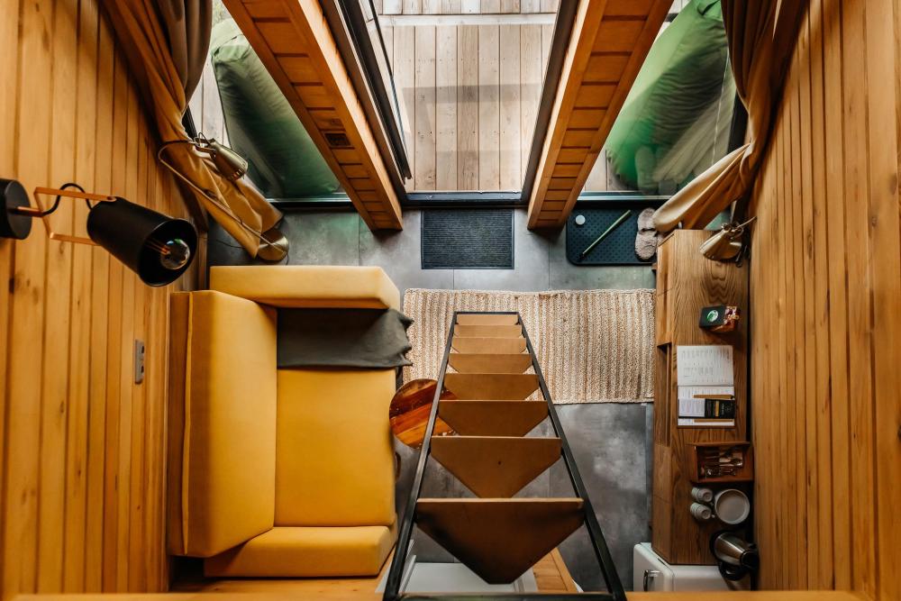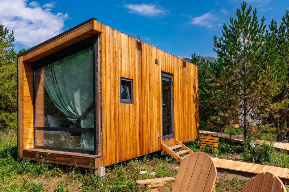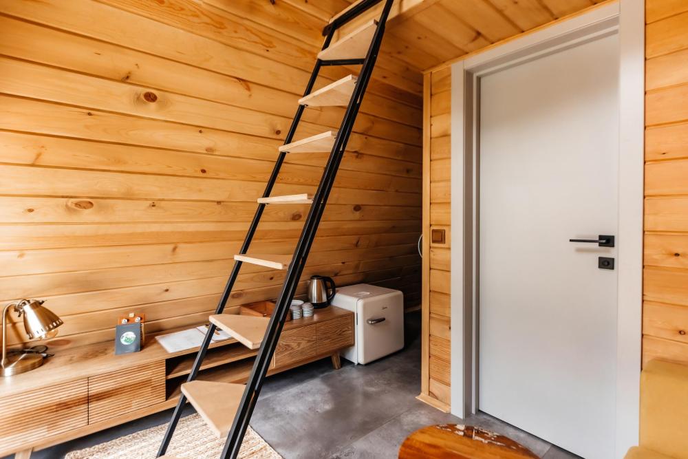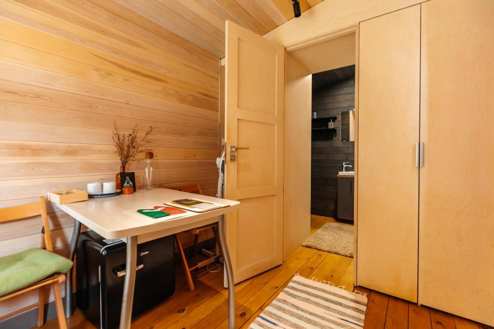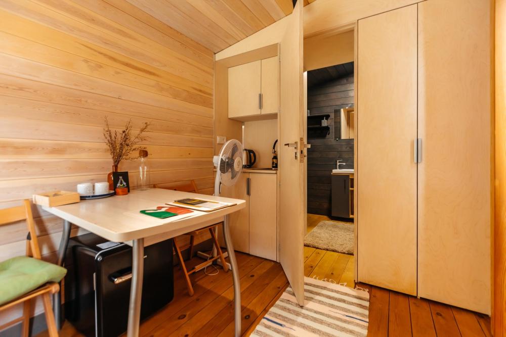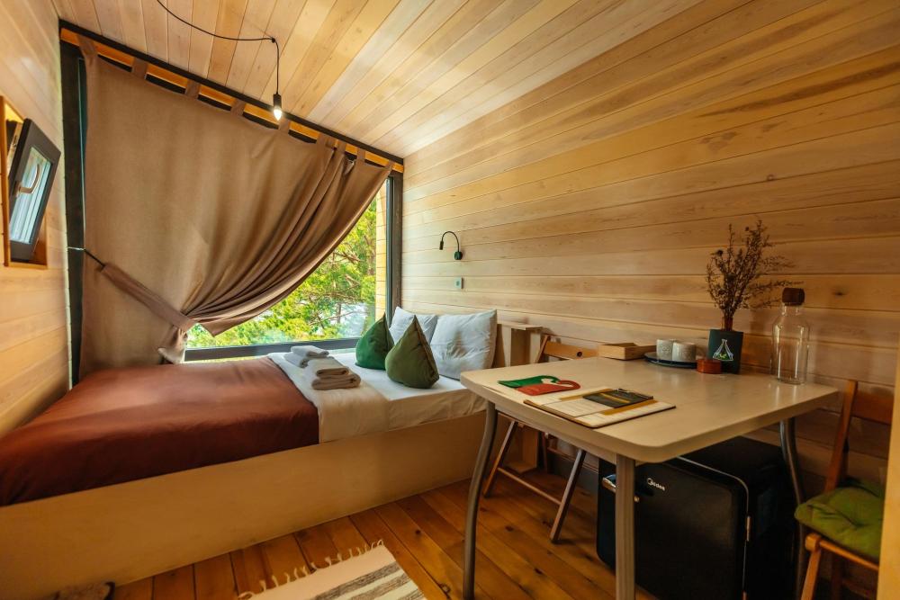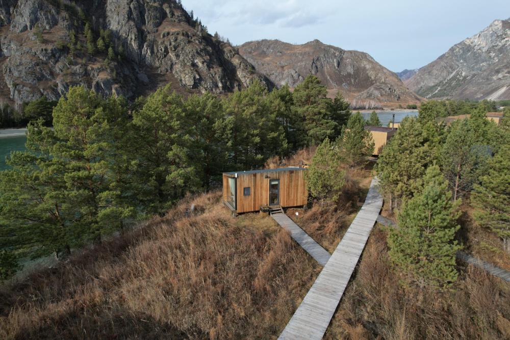 Тёплый небольшой дом прямоугольной формы для двоих с панорамным окном и видом на реку. Внутри — удобная кровать, стол, посуда, чайник, сан.узел с душевой кабиной. Есть своя зона барбекю