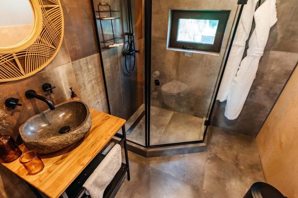 В шатре: Двуспальная кровать, Ванная комната (душ, туалет, раковина, зеркало), Гардеробная. Вид на реку.