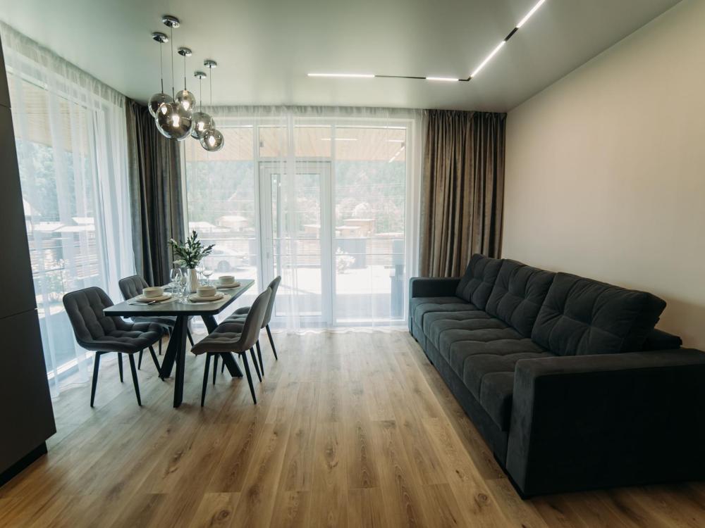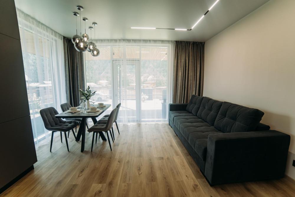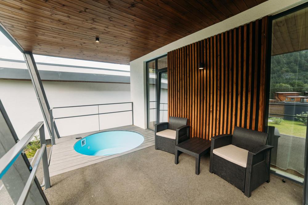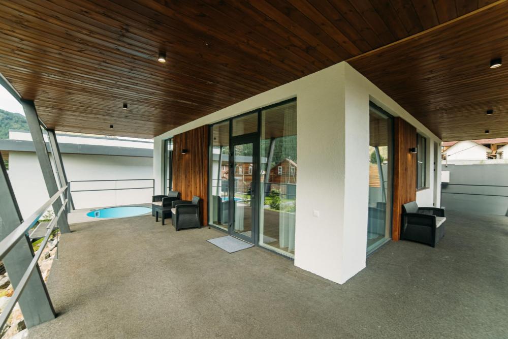 В доме: просторная гостиная с кухонной зоной, 2 спальни с двуспальными кроватями, ванная комната. У каждого дома большая терраса с уличной мебелью, а так же индивидуальная купель. Дом укомплектован: постельное бельё, полотенца, халаты для каждого гостя. Кухонная зона оборудована всем необходимым. В ванной комнате имеются все необходимые средства личной гигиены.