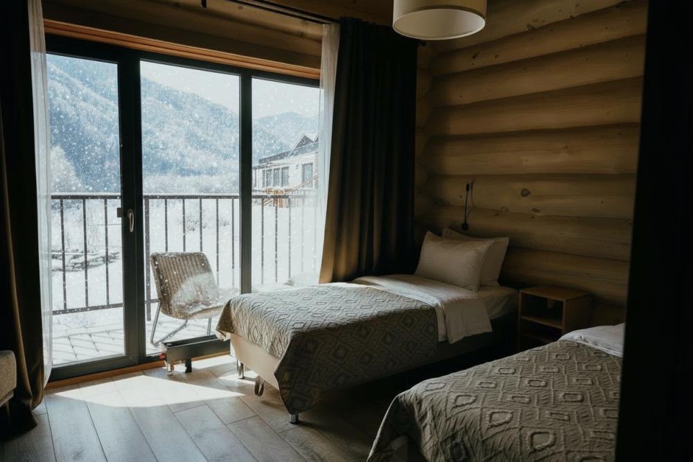 Двухместный номер с двумя односпальными кроватями. Номер оснащен балконом, с которого открывается прекрасный вид на Катунь и горы. Удобства в номере: - высокоскоростной интернет, бесплатный Wi-Fi - две односпальные кровати (90 x 200) - ортопедические матрасы - белоснежное постельное бельё - туалет и душ с термостатом - косметические средства для душа - халаты и махровые полотенца, тапочки, фен - теплый пол - капсульная кофемашина и чайник - питьевая вода из артезианской скважины -кресла и столик на балконе - комплектация мини бара по предварительному запросу