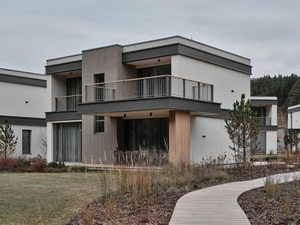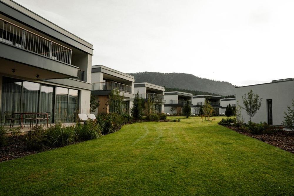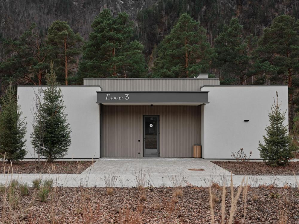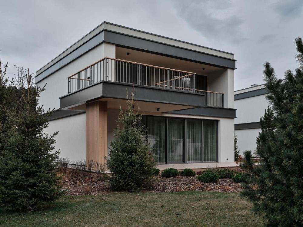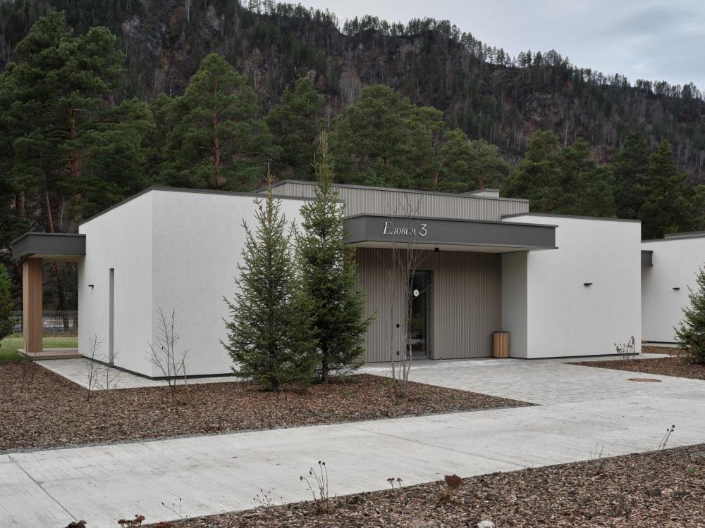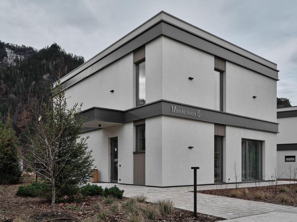 Двухэтажный дом в отдалении с видом на сад и горы. Дома образуют большую благоустроенную территорию. Внутри круглой застройки образуется своя уединенная атмосфера. – Уютная кухня-гостиная и три спальни – Терраса с навесом – Мангальная зона – Панорамный вид – 2 балкона