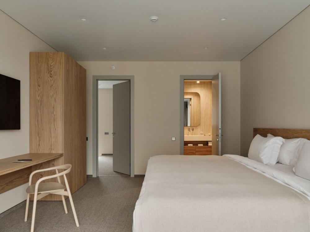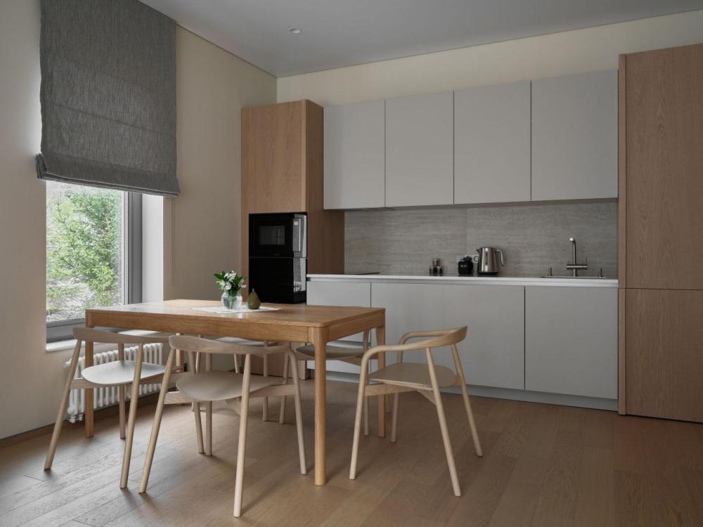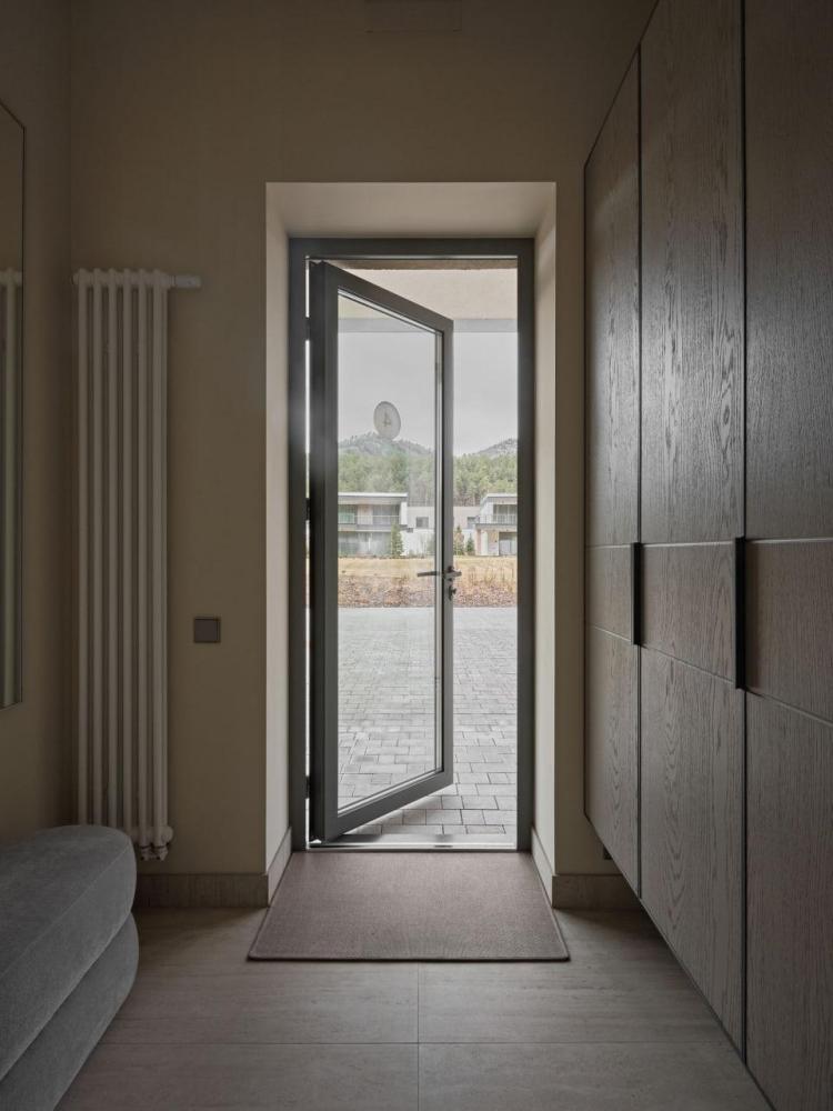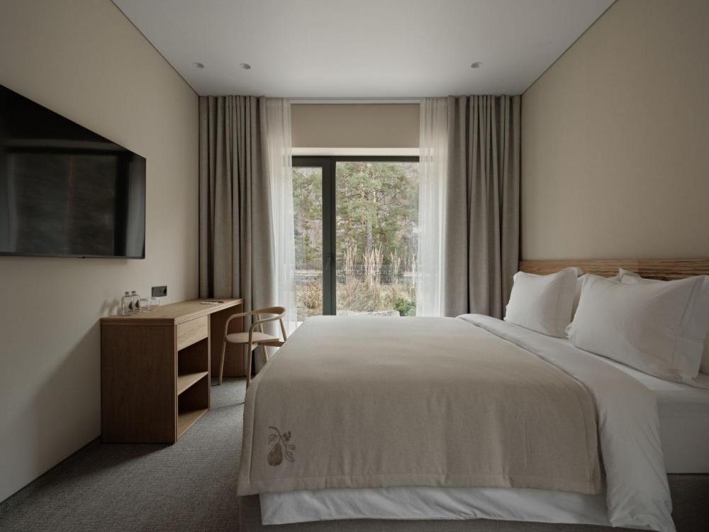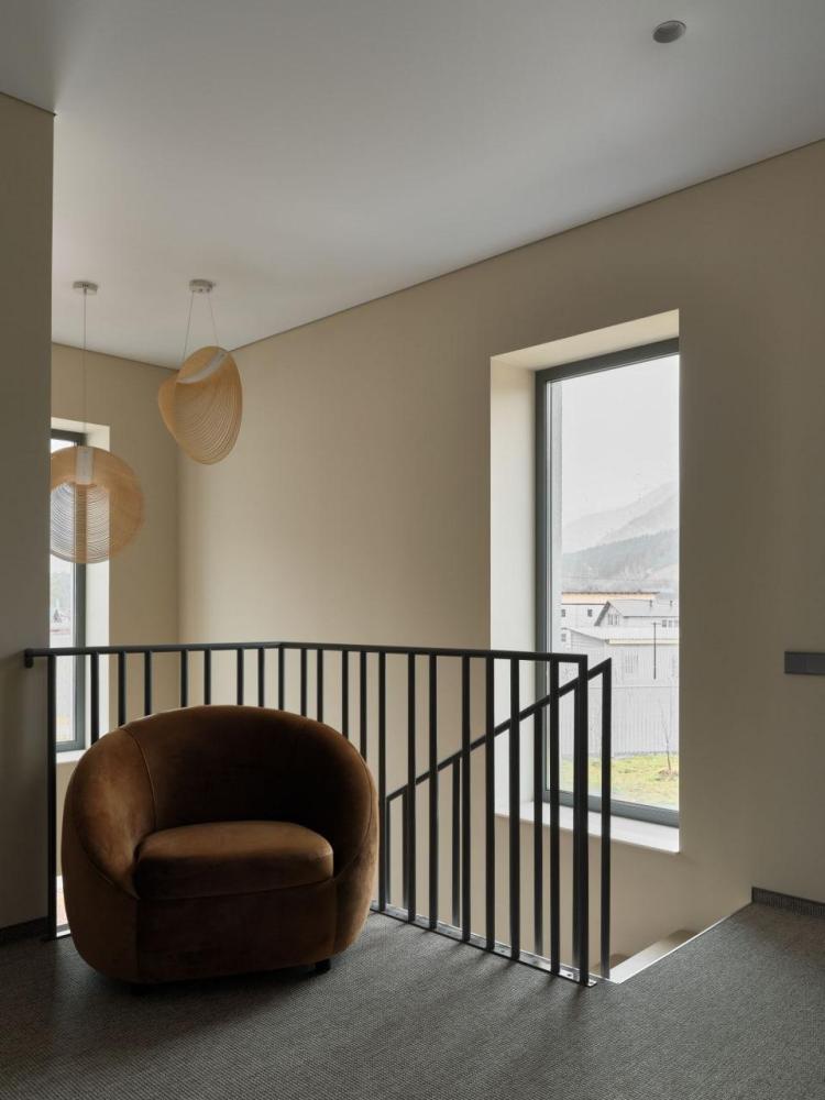 Двухэтажный дом в отдалении с видом на сад и горы. Дома образуют большую благоустроенную территорию. Внутри круглой застройки образуется своя уединенная атмосфера. – Уютная кухня-гостиная и три спальни – Терраса с навесом – Мангальная зона – Панорамный вид – 2 балкона