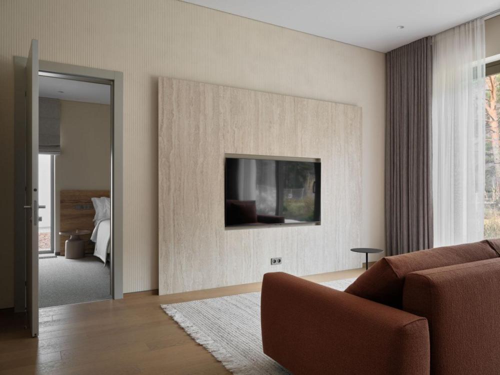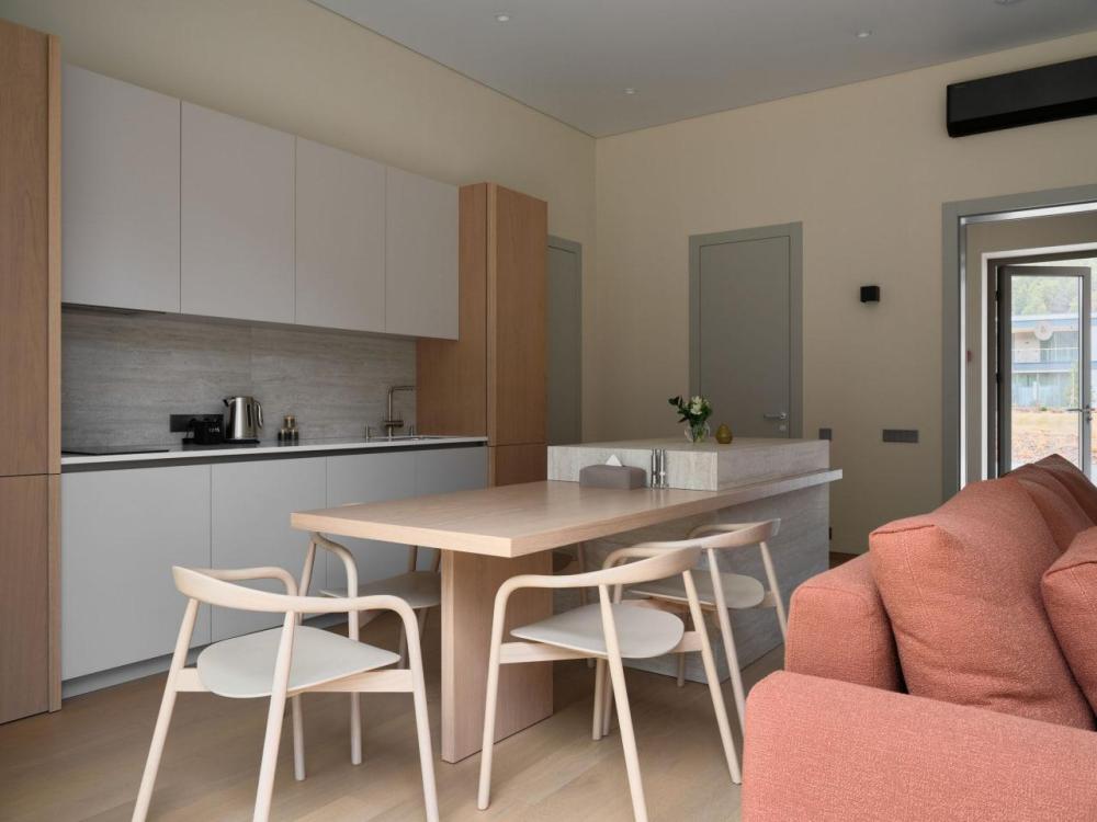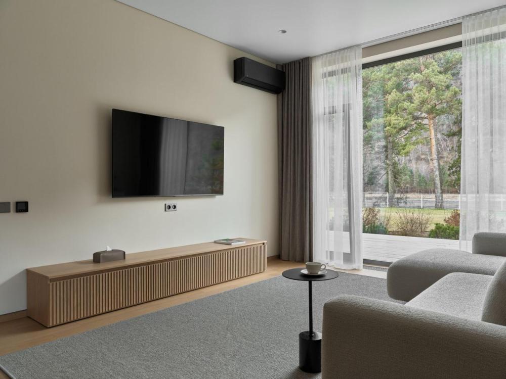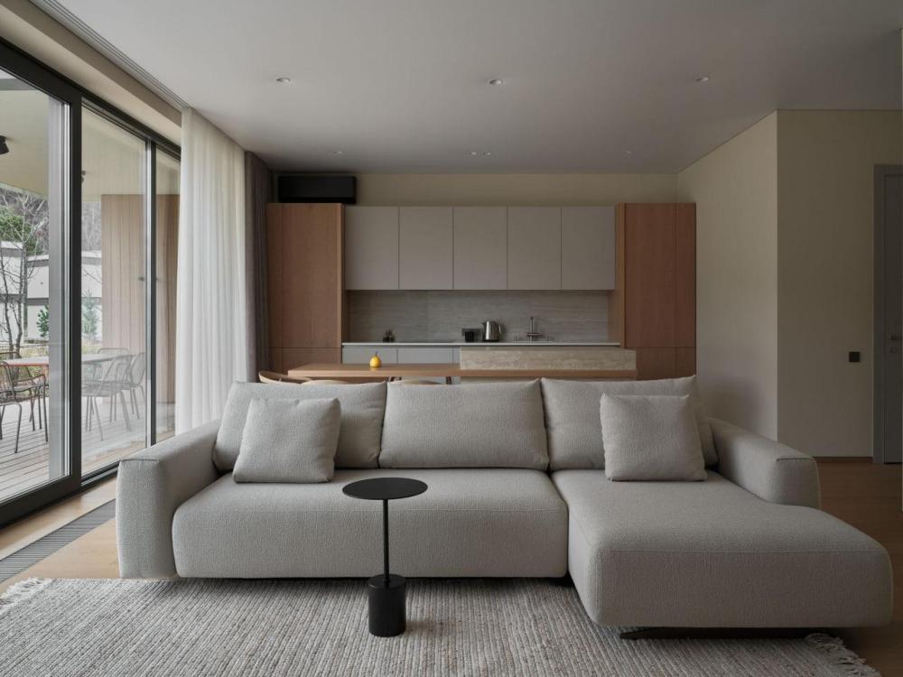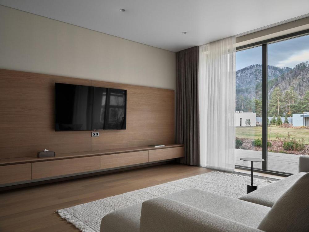 Одноэтажный дом на второй береговой линии. Из дома открывается потрясающий вид на реку и горы. Остекление в кухне-гостиной раздвижное, что позволяет чувствовать себя на природе, не выходя из дома. – Панорамный вид на реку и горы – Алюминиевые раздвижные оконные системы – Большая терраса с навесом – Кухня-гостиная и две спальни