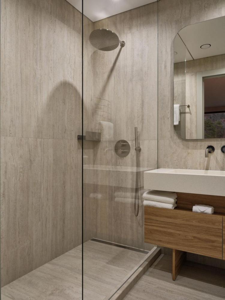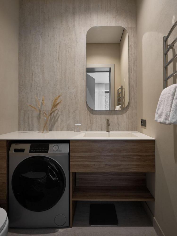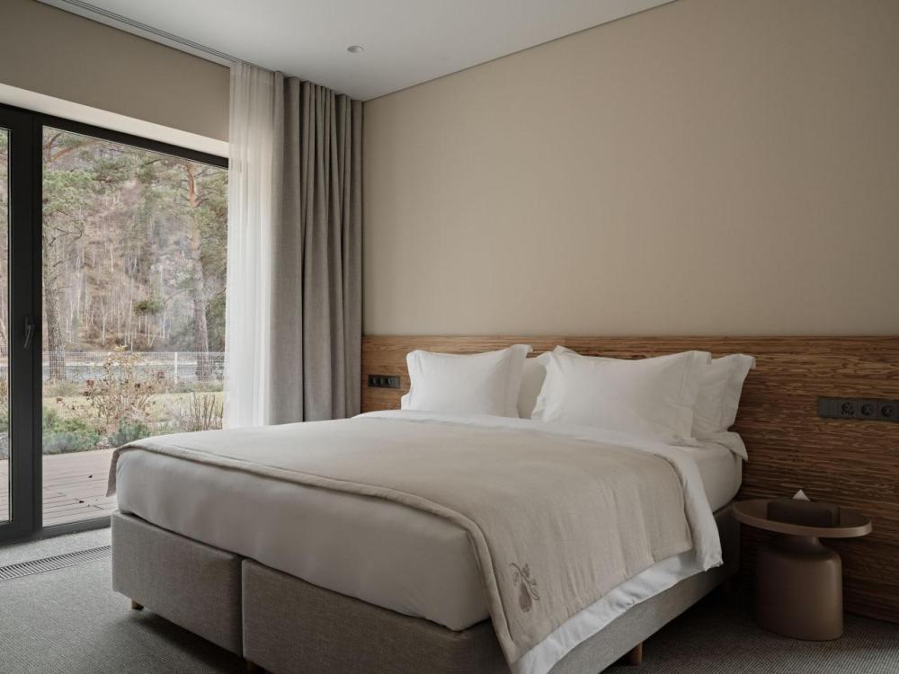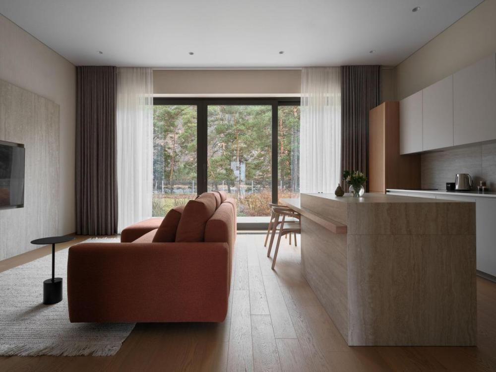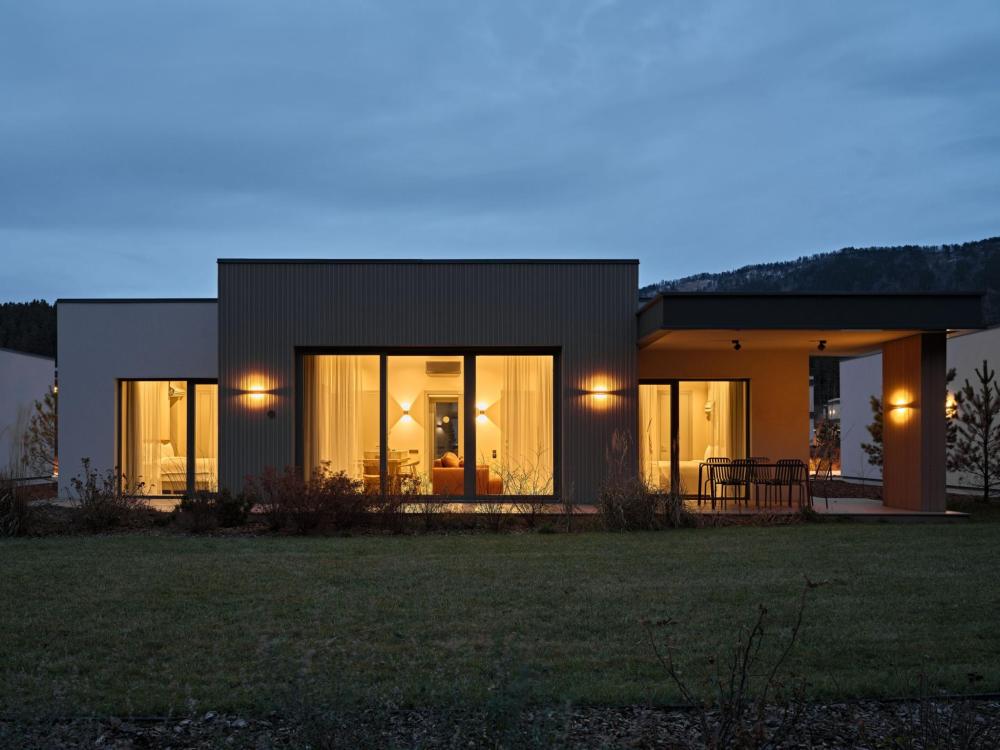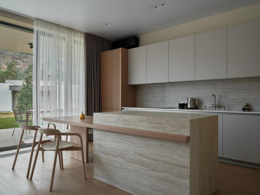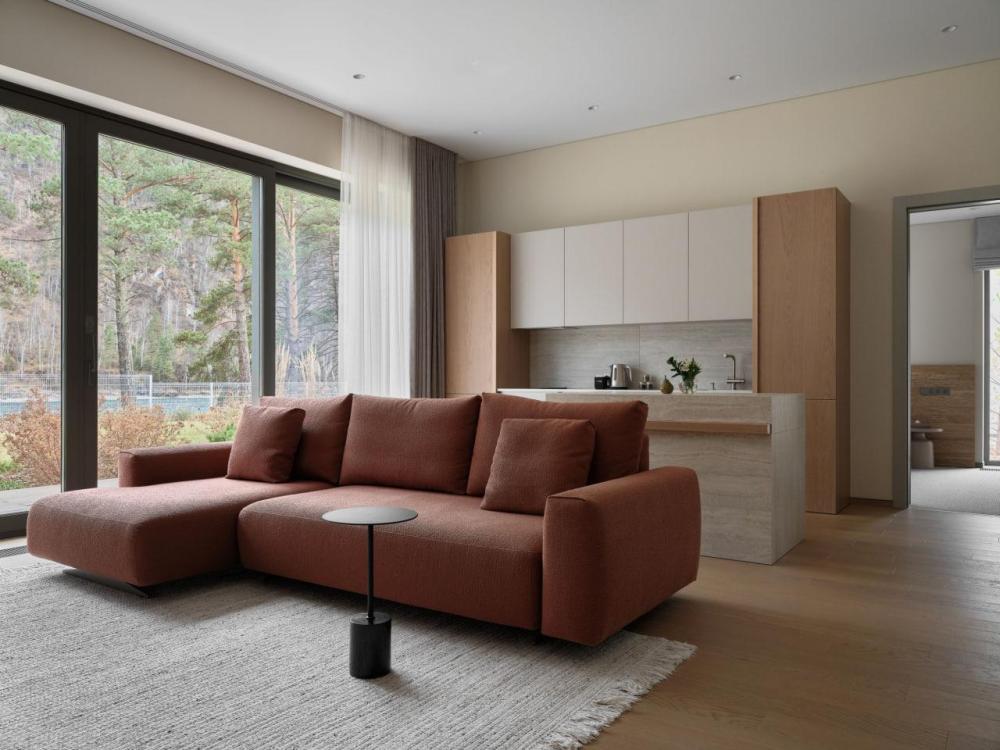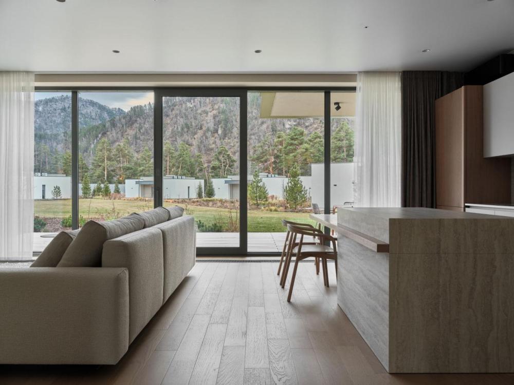 Одноэтажный дом на первой береговой линии. Остекление в кухне-гостиной раздвижное, что позволяет чувствовать себя на природе, не выходя из дома. – Панорамный вид на реку и горы – Алюминиевые раздвижные оконные системы – Большая терраса с навесом – Кухня-гостиная и спальня