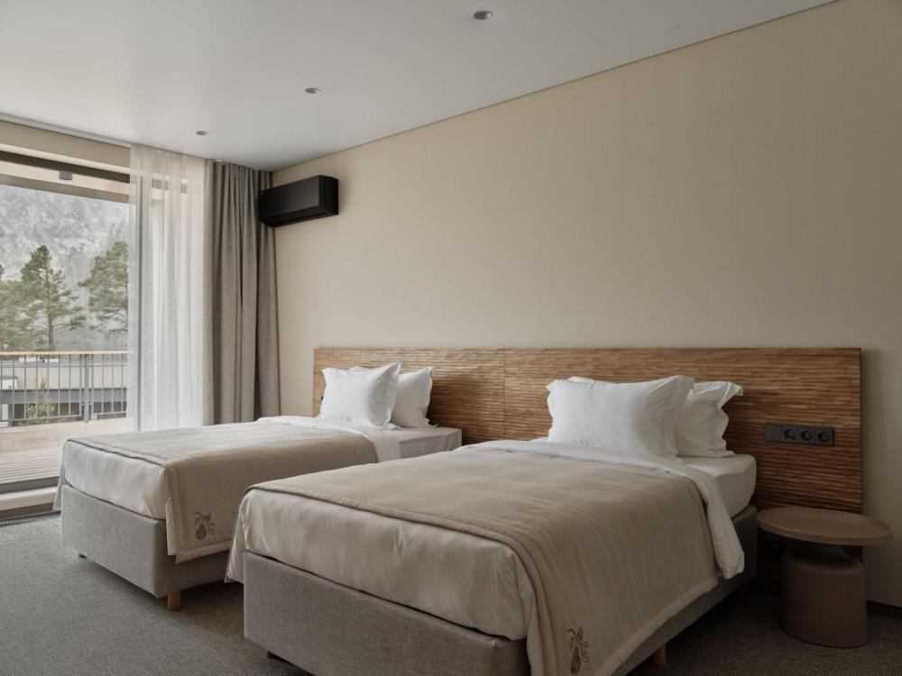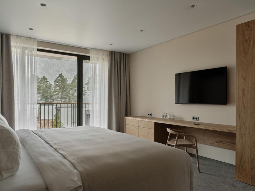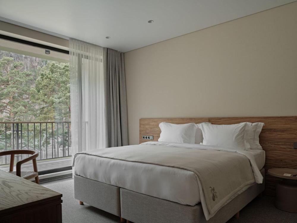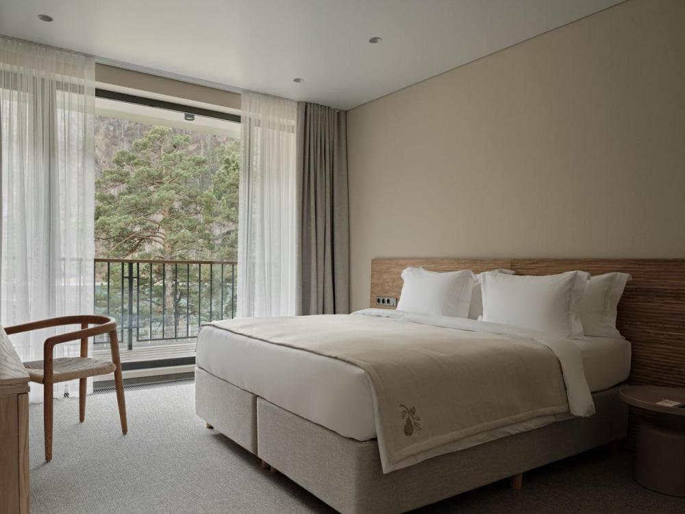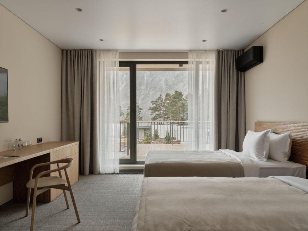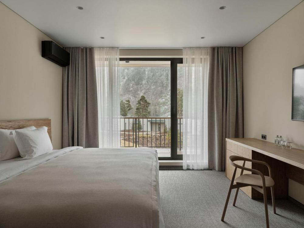 Двухэтажный дом на первой береговой линии. Остекление в кухне-гостиной раздвижное, что позволяет чувствовать себя на природе, не выходя из дома. – Уютная кухня-гостиная и три спальни – Панорамный вид на реку и горы – Терраса с навесом – Мангальная зона – 2 балкона