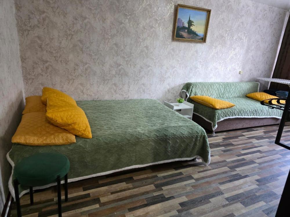 В квартире: три двуспальных кровати, кресло-кровать, кухонная зона, стиральная машина,микроволновка, электро плита, чайник, вся кухонная утварь , посуда , туалет-ванная раздельные, туалетная бумага ,зубная щетка, WI-FI ,СМАРТ ТВ, балкон для курящих,